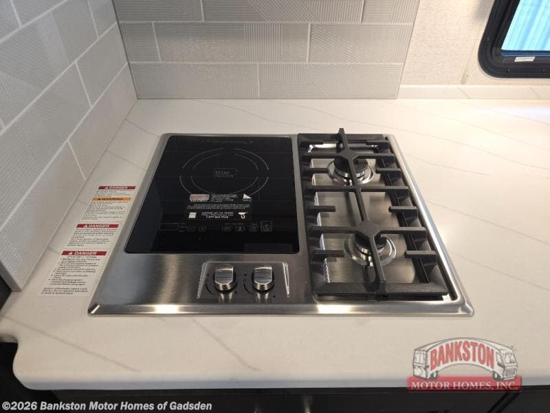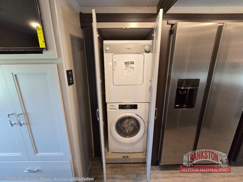 You won't even feel like you're traveling in this motorhome! The rear private bedroom offers at-home comforts with a Tilt-A-View inclining king bed slide, a closet, and a 32" Smart TV to watch movies in bed, plus there is a stackable washer and dryer for added convenience. The kiddos will want to draw straws for who gets to sleep on the 52" x 80" bunk over cab. Everyone can freshen up each morning in the full bathroom with 30" x 36" shower which has a skylight above, an Oxygenics shower head, and fiberglass shower with a glass door. Prepare your best home cooked meals with the two burner high output gas range top with single induction cooktop and enjoy them at the 72" Dream Dinette. The theater seating has the perfect view of the 42" Smart TV above the dinette.