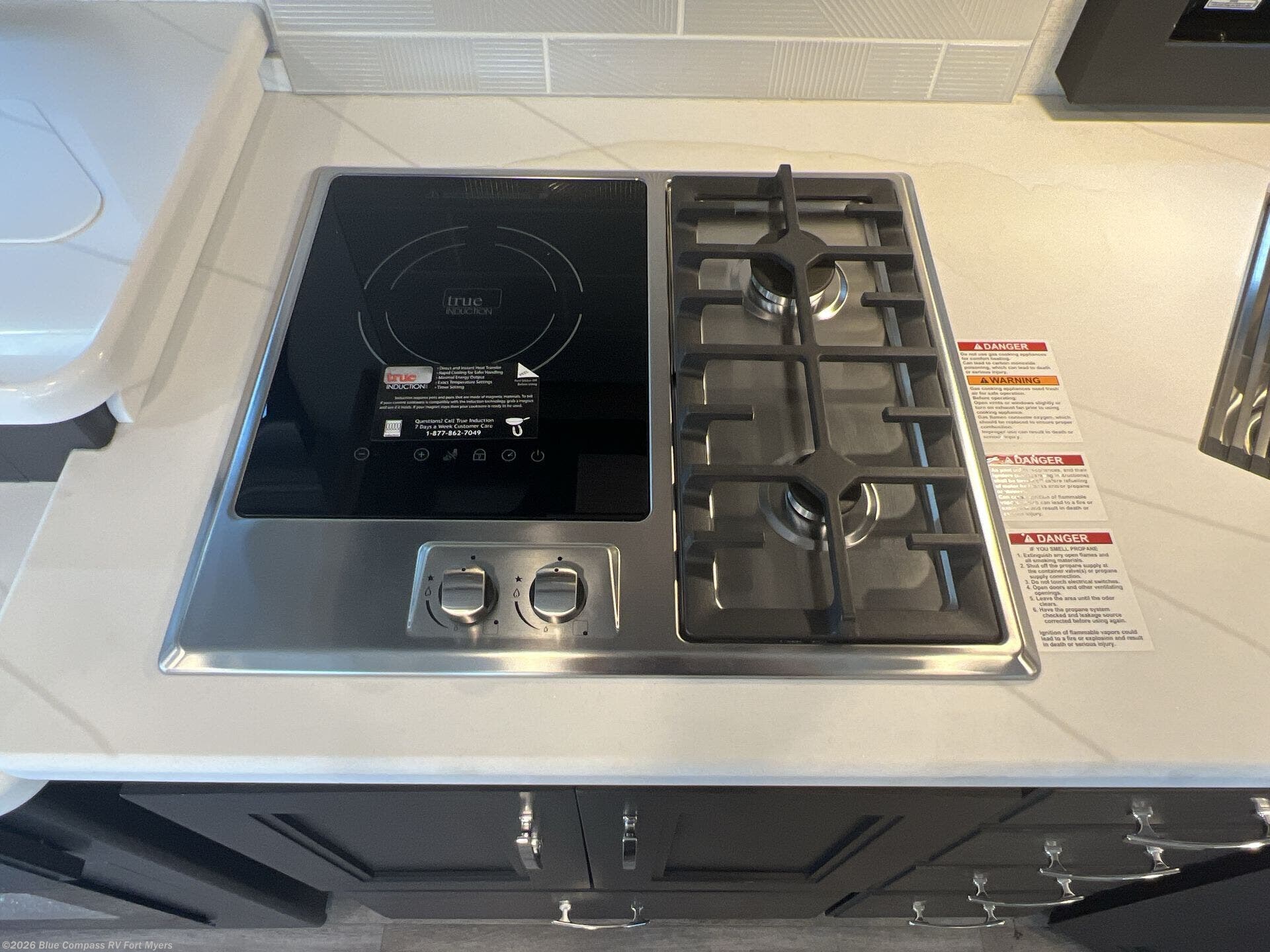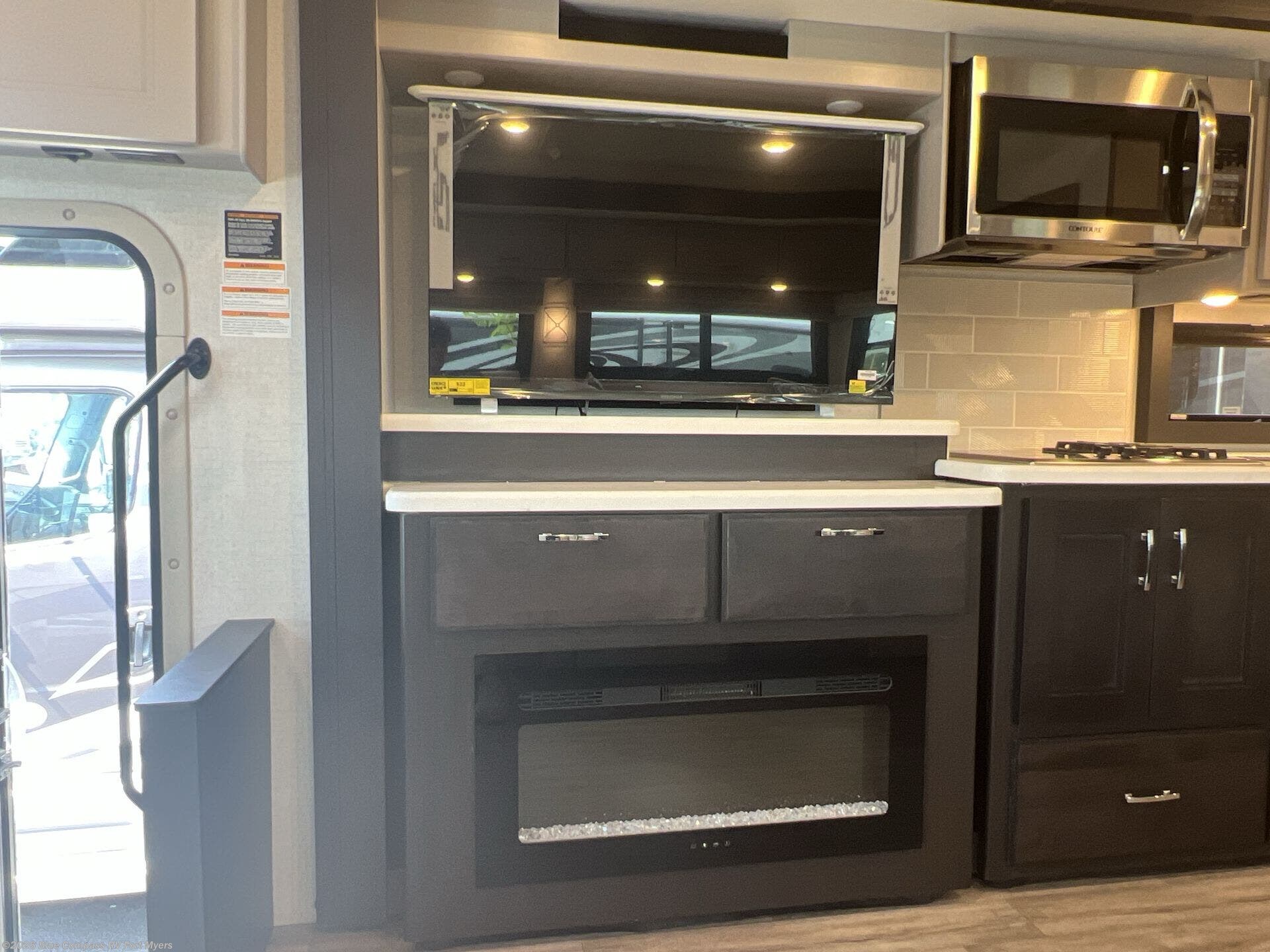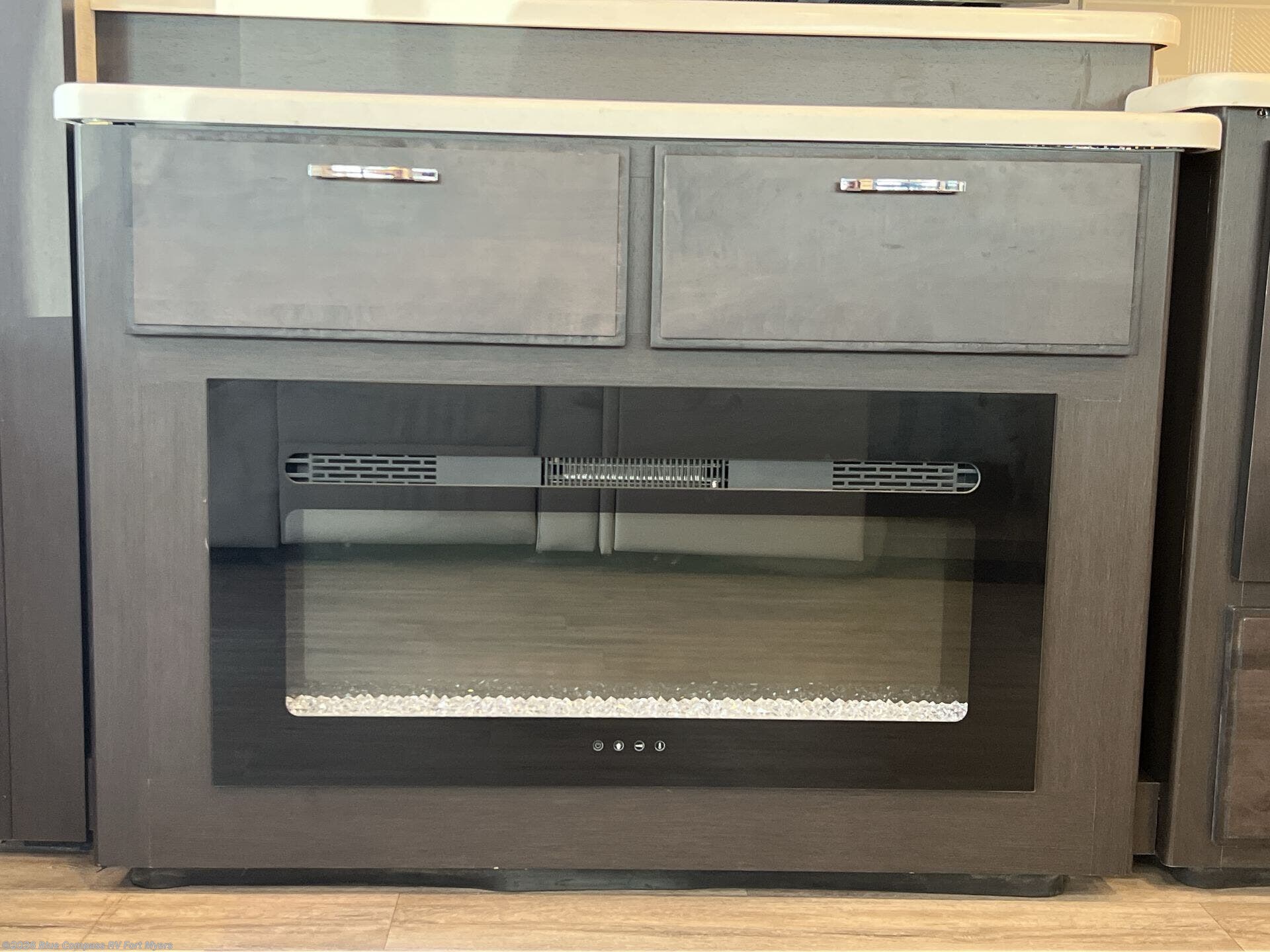 It's a clean decision to take this motorhome on your next trip with the bath and a half! The master suite offers at home comforts with a Tilt-A-View inclining king bed slide, a chest of drawers, a closet, and a 32" TV to watch movies in bed. The guests can sleep on the 52" x 80" bunk over cab and even convert the 72" Dream Dinette. Everyone can freshen up each morning in the full bathroom with the 30" x 36" shower which has a skylight above, an Oxygenics shower head, and a fiberglass shower with a glass door. Prepare your best home cooked meals with the two burner high output gas range top with single induction cooktop and easily take a bathroom break with the half bathroom nearby. The theater seating has the perfect view of the fireplace with a TV above it.