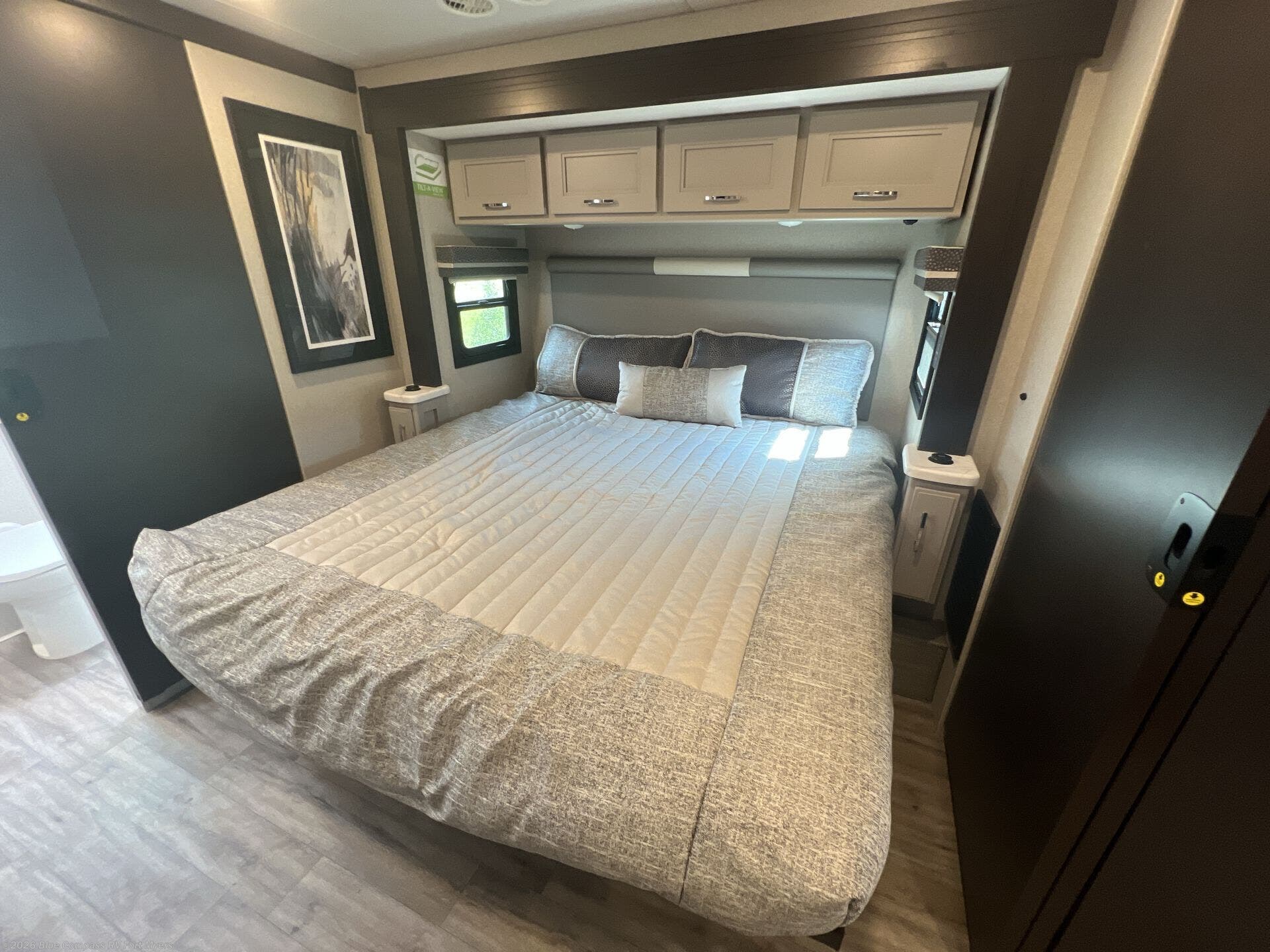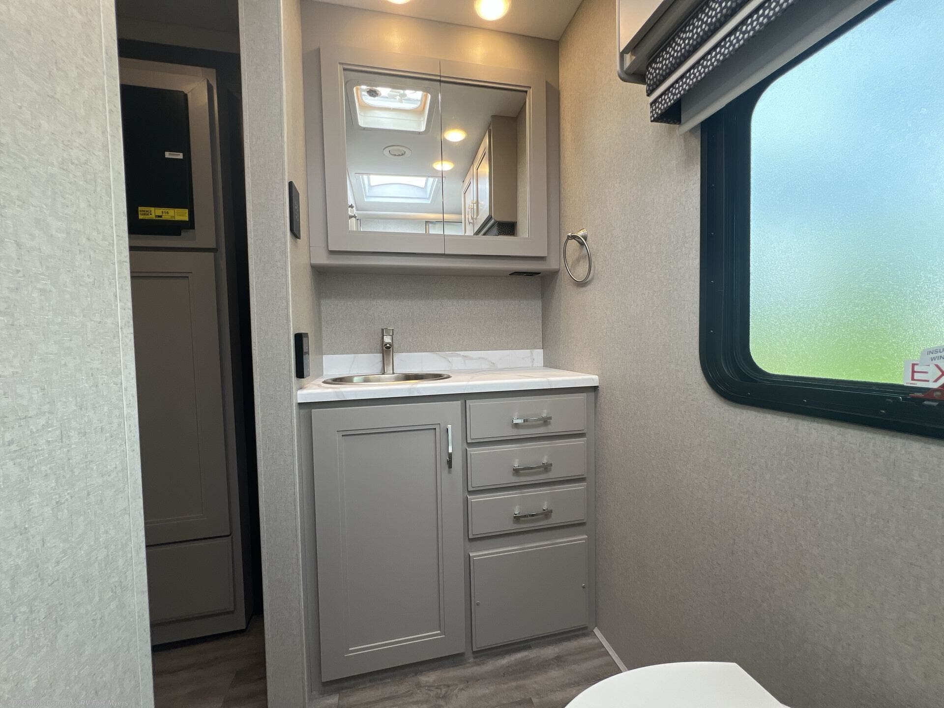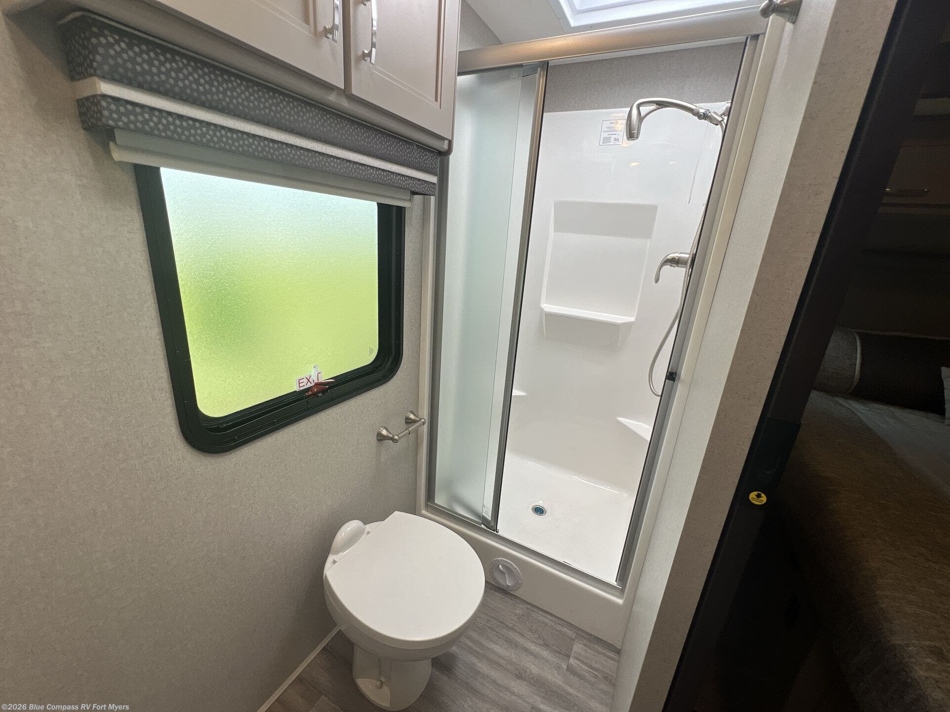 It's a clean decision to take this motorhome on your next trip with the bath and a half! The master suite offers at home comforts with a Tilt-A-View inclining king bed slide, a chest of drawers, a closet, and a 32" TV to watch movies in bed. The guests can sleep on the 52" x 80" bunk over cab and even convert the 72" Dream Dinette. Everyone can freshen up each morning in the full bathroom with the 30" x 36" shower which has a skylight above, an Oxygenics shower head, and a fiberglass shower with a glass door. Prepare your best home cooked meals with the two burner high output gas range top with single induction cooktop and easily take a bathroom break with the half bathroom nearby. The theater seating has the perfect view of the fireplace with a TV above it.