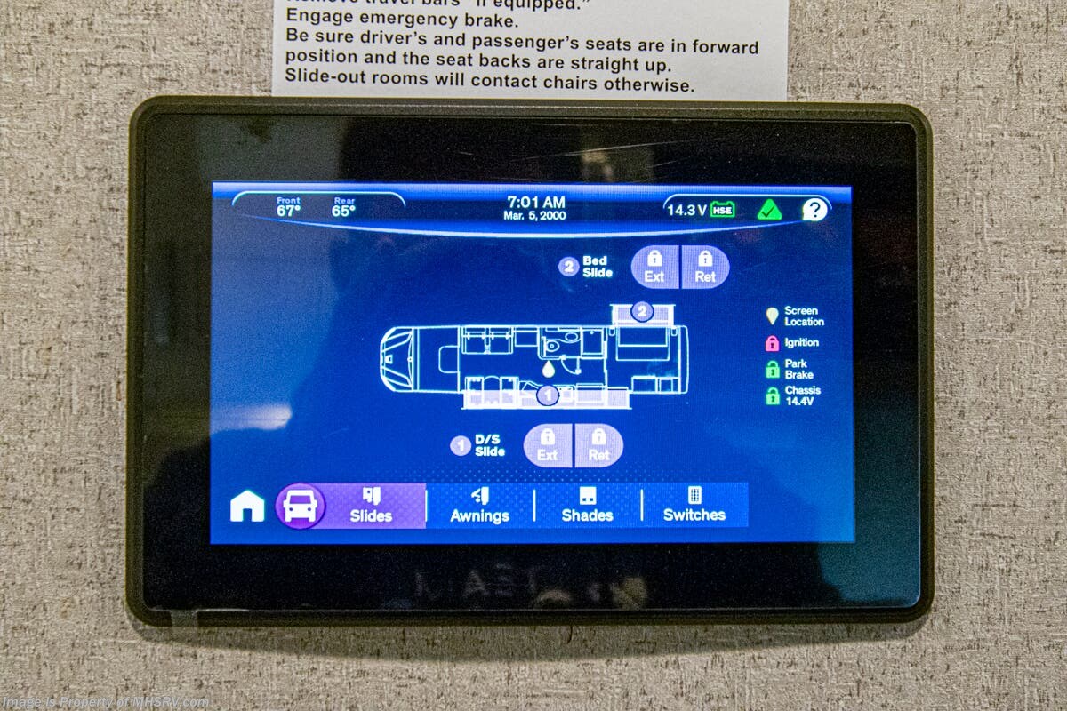- Fully integrated Girard roof mount awning on patio side, awning boxes on both sides
