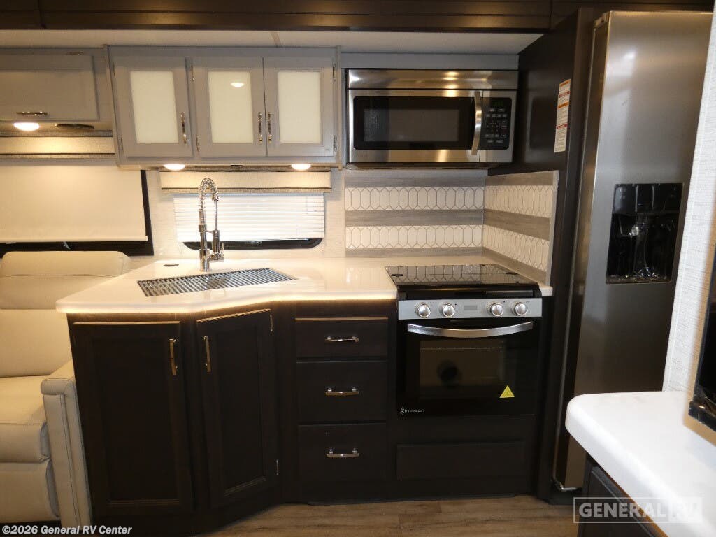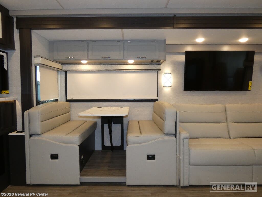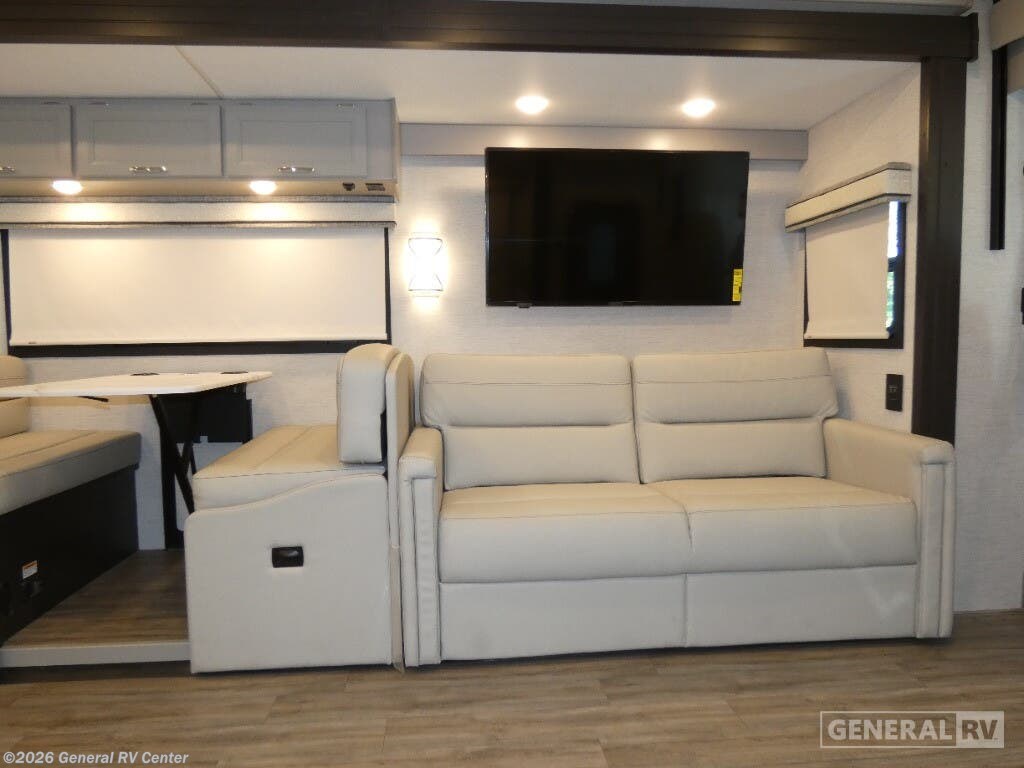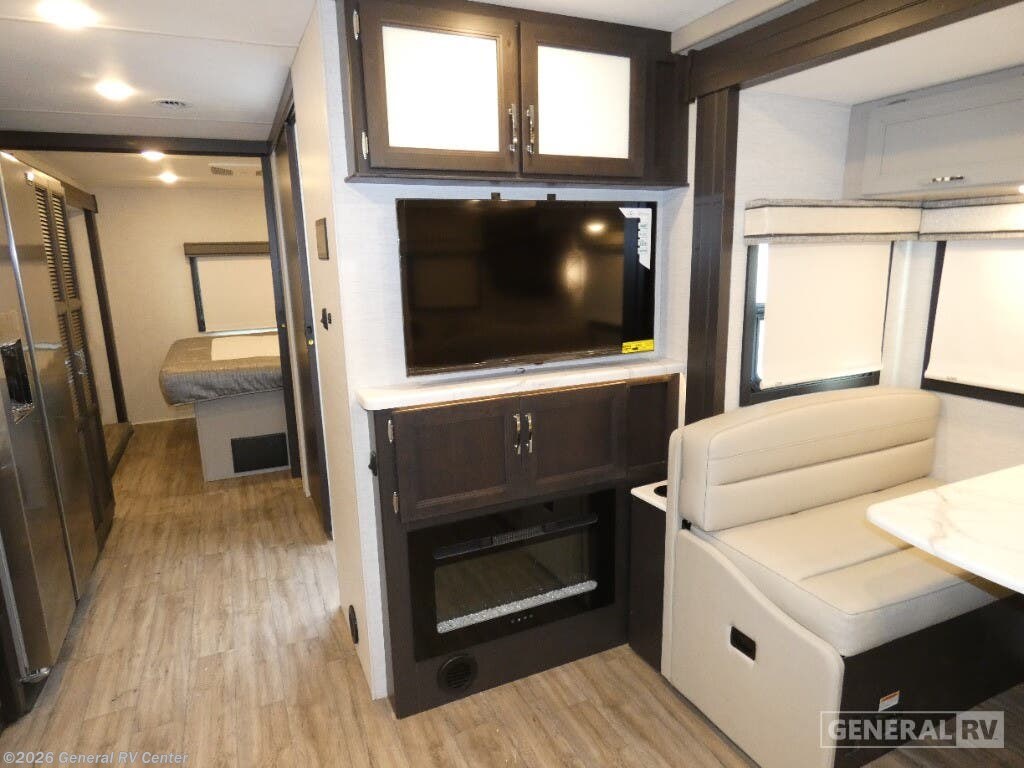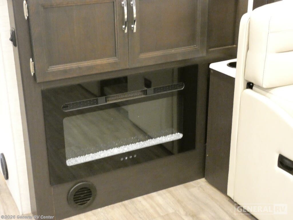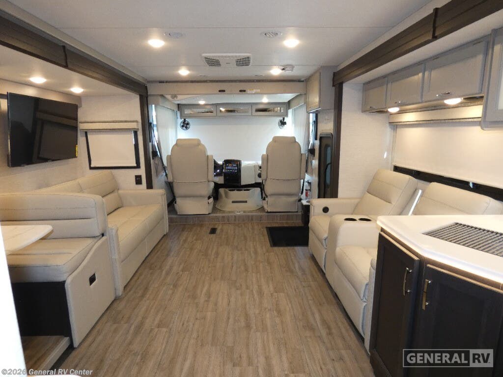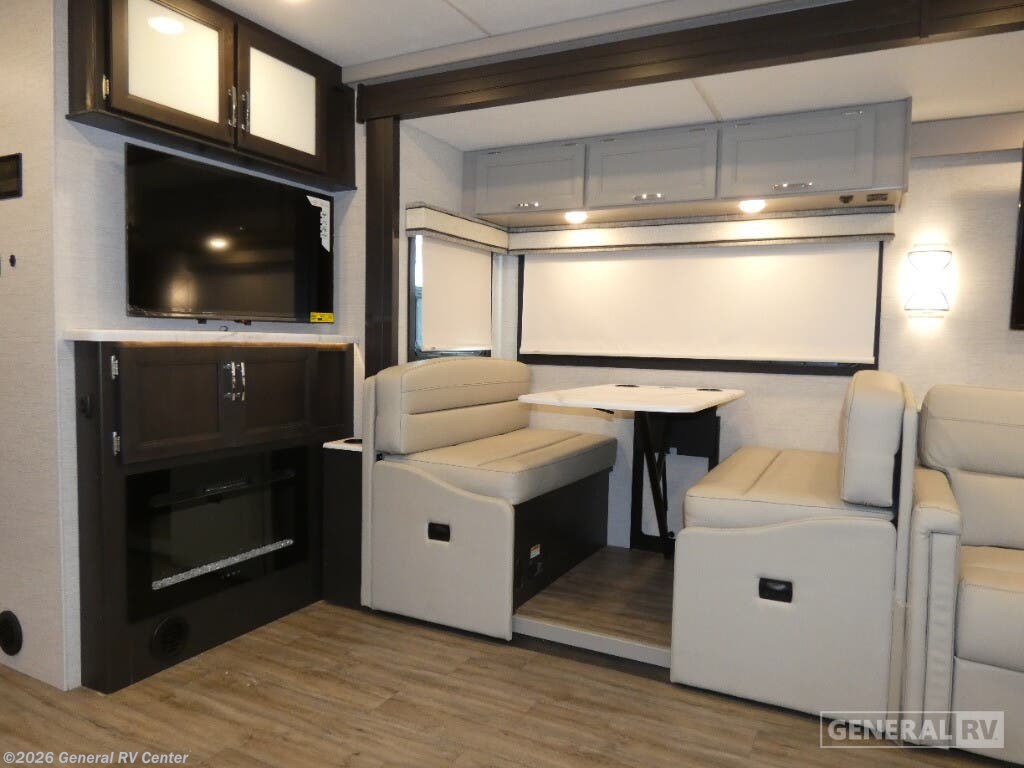 Step into the 2026 Thor Motor Coach Indigo CC35, where luxury meets functionality in the open road. This magnificent RV, built on the robust Ford F53 chassis, is powered by a 335-horsepower engine, ensuring a smooth and powerful journey. With a length of 37 feet, it offers ample space for family and friends, comfortably sleeping up to eight people. The interior is thoughtfully designed with a front living area that boasts a cozy fireplace and 68" theater seating, perfect for relaxing evenings. The center kitchen, equipped with a full-size electric refrigerator and a three-burner cooktop, makes meal preparation a breeze, while the stackable washer and dryer add everyday convenience. The rear bedroom is a sanctuary featuring a luxurious king-size bed and plenty of storage with a dresser and closet. The convertible sleeping options, including the Dream Dinette and sofa bed, make hosting guests easy. Enjoy the outdoors under the 20-foot powered retractable awning, and make use of the exterior TV for entertainment under the stars. With a 50-gallon fresh water tank, 40-gallon gray and black water tanks, and an automatic heater, the Indigo CC35 is designed for extended adventures without sacrificing comfort. Visit your nearest General RV dealership to explore this exceptional motorhome in person and begin your journey in style.