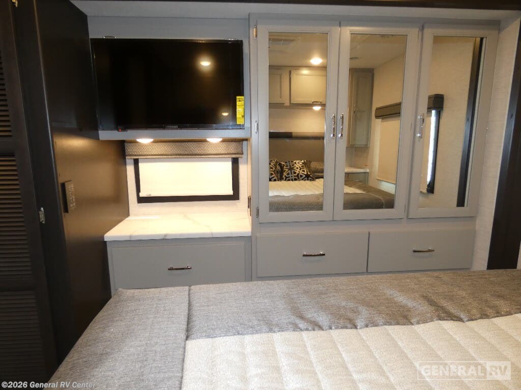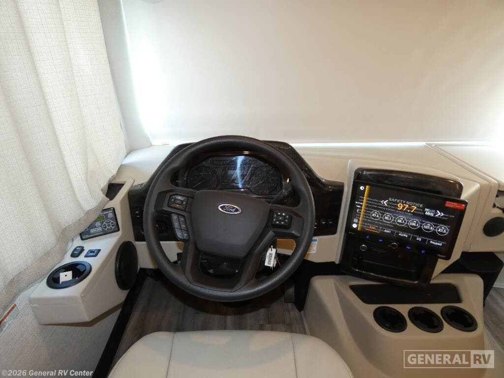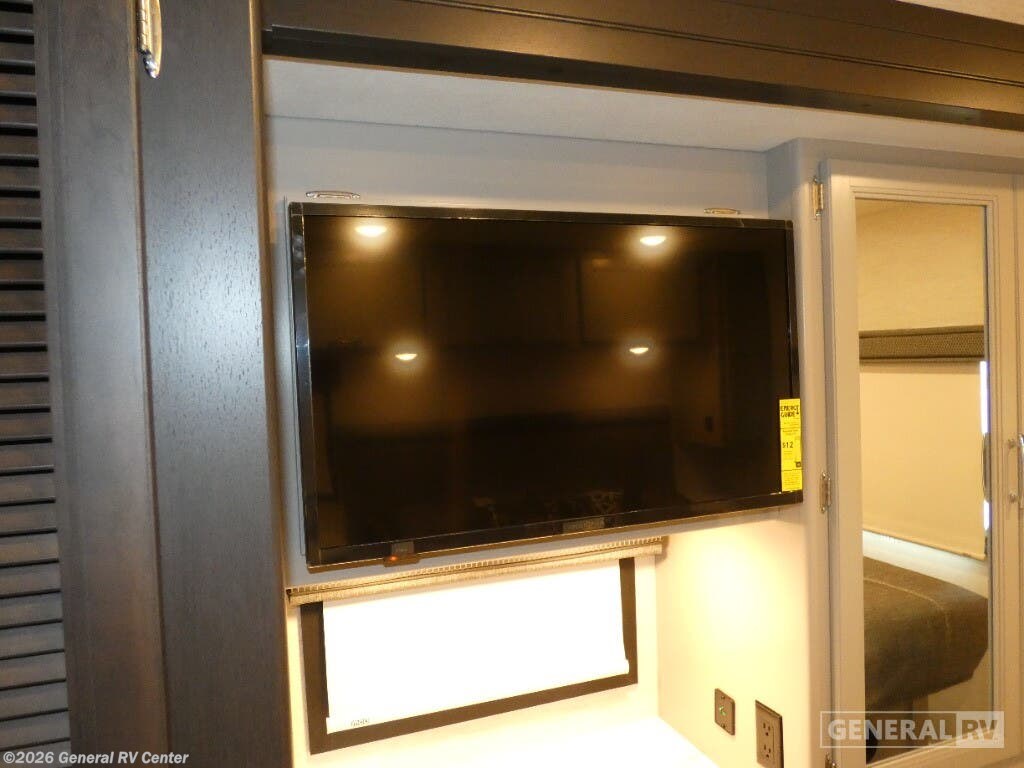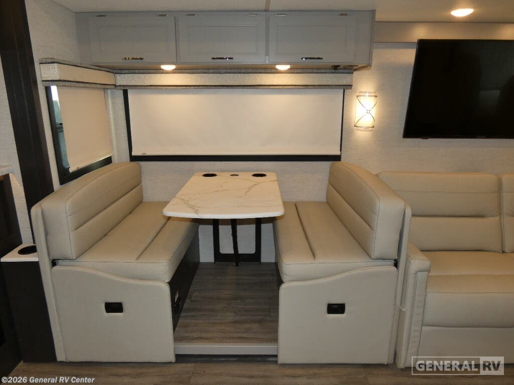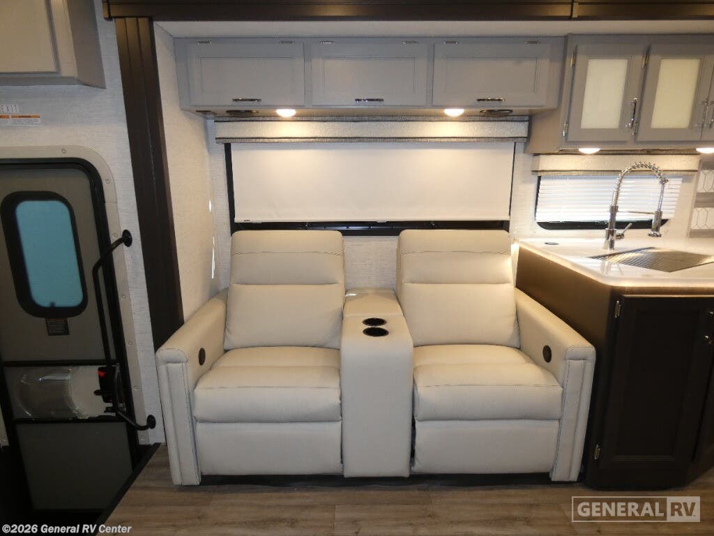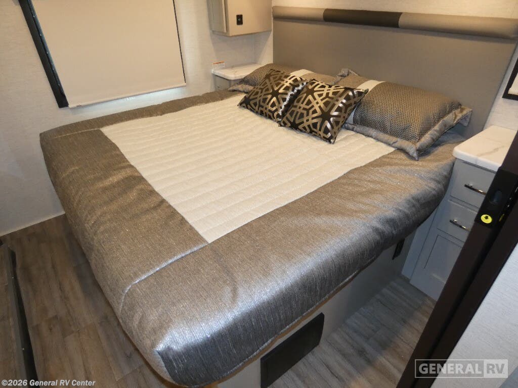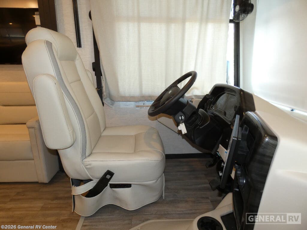 Step into the 2026 Thor Motor Coach Indigo CC35, where luxury meets functionality in the open road. This magnificent RV, built on the robust Ford F53 chassis, is powered by a 335-horsepower engine, ensuring a smooth and powerful journey. With a length of 37 feet, it offers ample space for family and friends, comfortably sleeping up to eight people. The interior is thoughtfully designed with a front living area that boasts a cozy fireplace and 68" theater seating, perfect for relaxing evenings. The center kitchen, equipped with a full-size electric refrigerator and a three-burner cooktop, makes meal preparation a breeze, while the stackable washer and dryer add everyday convenience. The rear bedroom is a sanctuary featuring a luxurious king-size bed and plenty of storage with a dresser and closet. The convertible sleeping options, including the Dream Dinette and sofa bed, make hosting guests easy. Enjoy the outdoors under the 20-foot powered retractable awning, and make use of the exterior TV for entertainment under the stars. With a 50-gallon fresh water tank, 40-gallon gray and black water tanks, and an automatic heater, the Indigo CC35 is designed for extended adventures without sacrificing comfort. Visit your nearest General RV dealership to explore this exceptional motorhome in person and begin your journey in style.