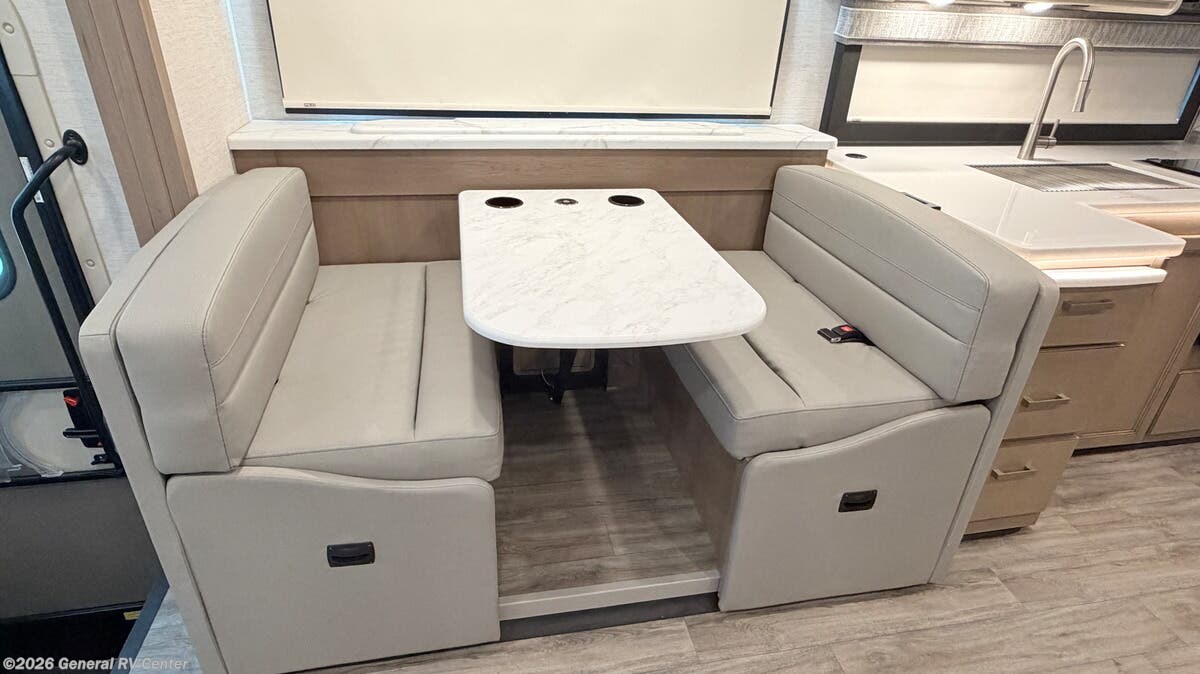Discover the 2026 Thor Motor Coach Indigo HH36, where spacious design meets modern comfort in a thoughtfully crafted Class A motorhome. Stretching approximately 36 feet, this coach provides generous room for family and guests, comfortably sleeping up to eight. At the center of the coach, the well-appointed kitchen features a three-burner cooktop, convection microwave, and a residential-style refrigerator, making it easy to prepare meals whether you’re on a weekend getaway or an extended journey. The expansive living area invites relaxation with comfortable seating and an open layout enhanced by multiple slide-outs, creating a welcoming space for entertaining or unwinding after a day of travel. At the rear, the private bedroom offers a luxurious king-size bed, delivering a restful retreat at the end of each day. Additional sleeping flexibility comes from the power drop-down overhead bunk and convertible seating, ensuring everyone has a comfortable place to rest. The centrally located bathroom includes a stylish enclosed shower and ample storage, while washer and dryer prep adds everyday convenience. Outside, relax beneath the power patio awning with integrated LED lighting, perfect for outdoor dining or evening gatherings. Built on a Ford F-53 chassis with a 335-horsepower V8 engine, the Indigo HH36 blends performance, comfort, and functionality—ready to turn every journey into a memorable experience.