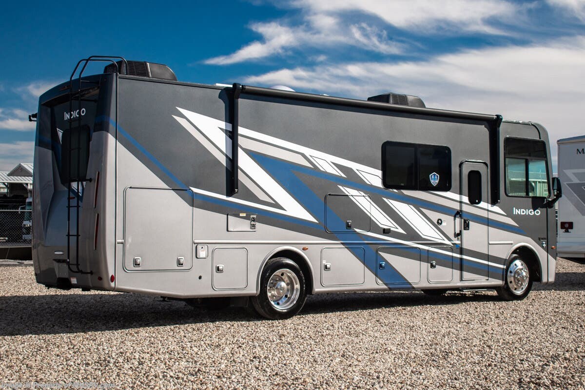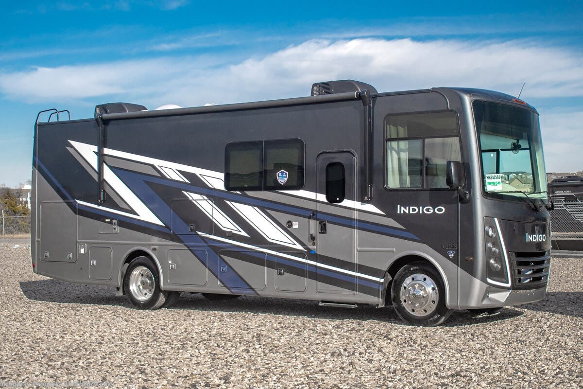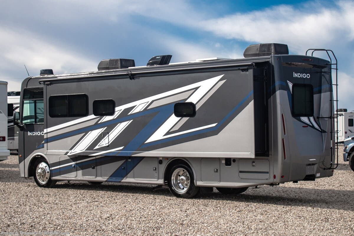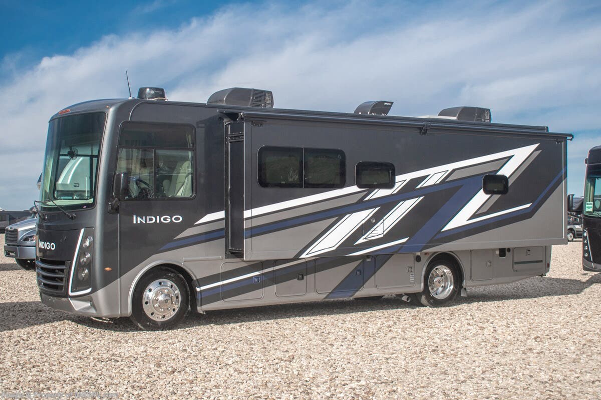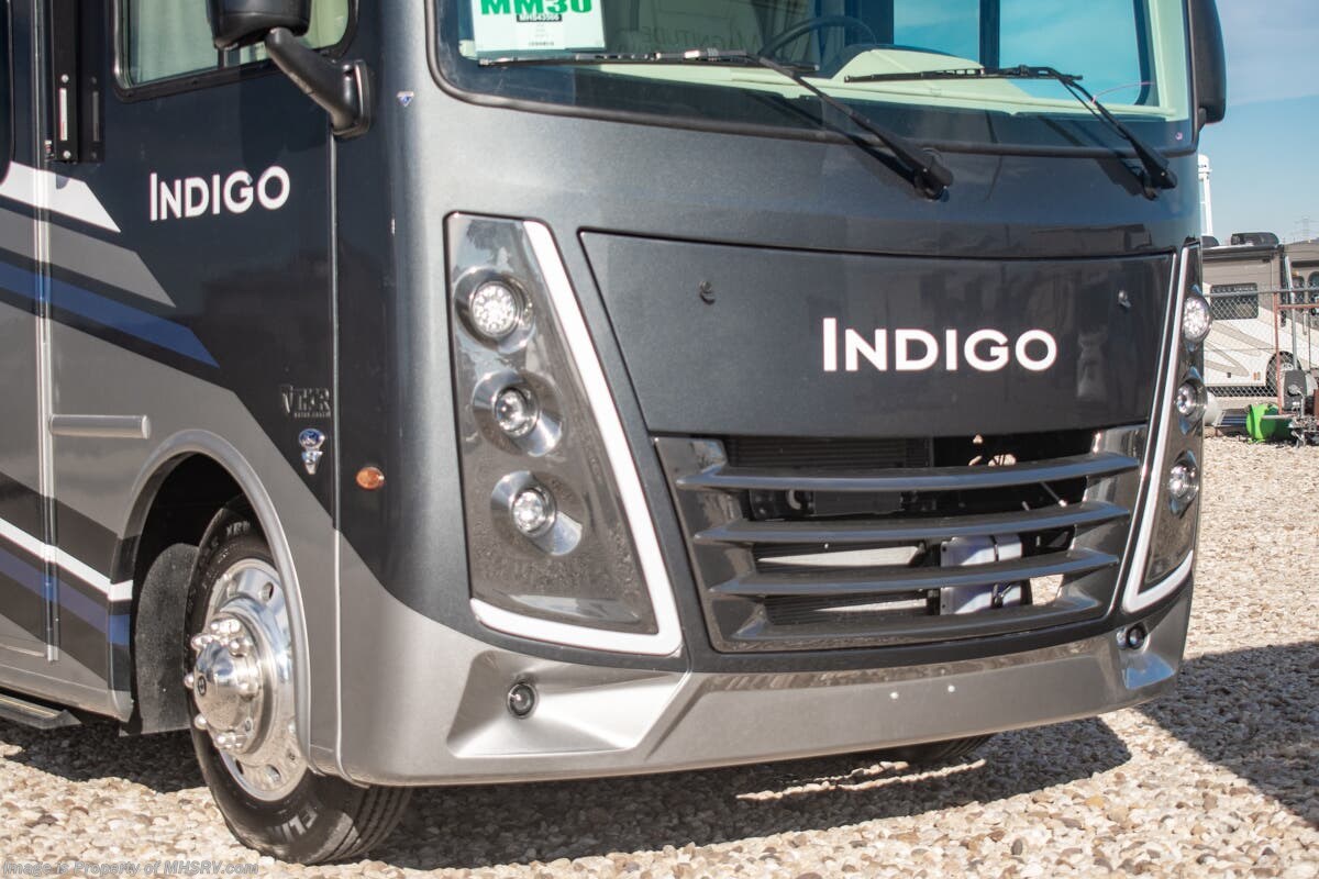- 200W Additional Solar Charging System Shop hundreds of motorhomes including Class A RVs at MHSRV! Choose from Thor A.C.E. – Resonate – Hurricane – Windsport – Luminate – Indigo – Vegas – Axis – Challenger – Miramar Fleetwood Flair – Fortis – Flex – Bounder - Forest River Georgetown - FR3 – Entegra Coach Vision – Vision XL – Emblem – Holiday Rambler Admiral – Eclipse – Invicta – Vacationer - and much more. We also sell quality pre-owned models such as Jayco Alante SE – Alante – Precept – Precept Prestige – Tiffin Allegro Open Road – Newmar Canyon Star – Bay Star – Winnebago Vista – Sunstar – Adventurer – Coachmen Mirada – Pursuit - Encore and much more. Visit for our complete line-up and the sale prices that have made us the #1 volume selling motor home dealership in the world 12 years in a row! About This RV This RV measures approximately 31' 9" feet in length and features a Ford F-53 chassis with a 7.3L V-8 engine, a six speed automatic transmission, a drop-down overhead loft, 1 slide-out and a bedroom TV. The Indigo also boasts an impressive list of standard features including the exterior entertainment center, Winegard Connect 2.0 WiFi, rotary battery disconnect switch, adjustable shelving bracketry, power privacy shade on windshield, touchscreen radio that features navigation and back-up monitor, heated remote exterior mirrors with integrated sideview cameras, lateral power patio awning with integrated LED lighting and much more. About Us For more details on this unit, our full inventory, brochures, window stickers, videos, photos, and customer reviews, visit or call 800-335-6054 for the Texas location or 334-288-0331 for our Alabama location. At Motor Home Specialist, we never charge prep or orientation fees. Every new RV sale includes a multi-point inspection, full interior and exterior detail. At our Texas location we also offer a high-pressure rain booth test—an exclusive service in the industry. You'll also receive a comprehensive coach orientation with an MHSRV technician and a complimentary night in our delivery park with full hook-ups at our Texas Location. --Why Pay More? Why Settle for Less?—
