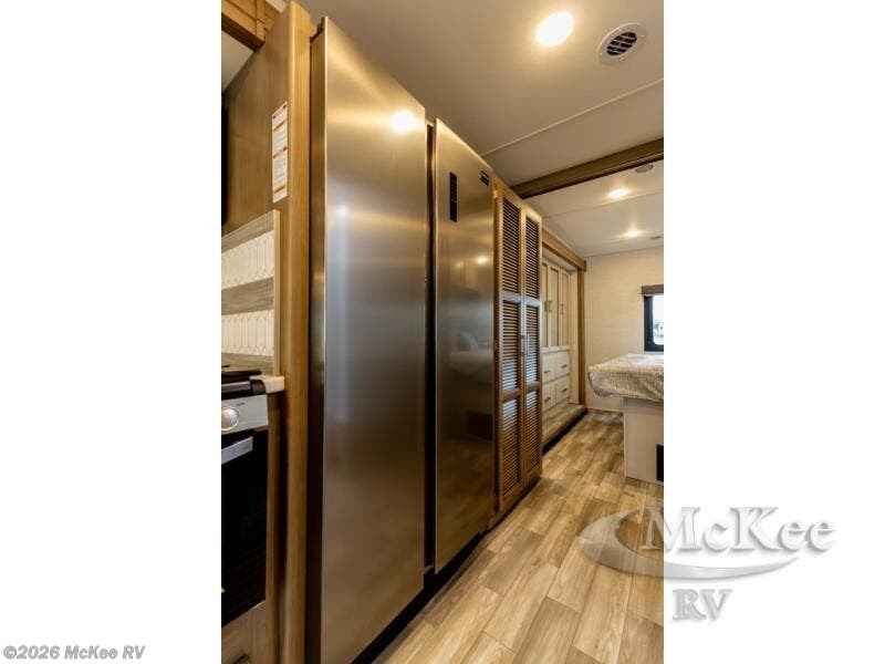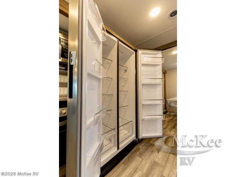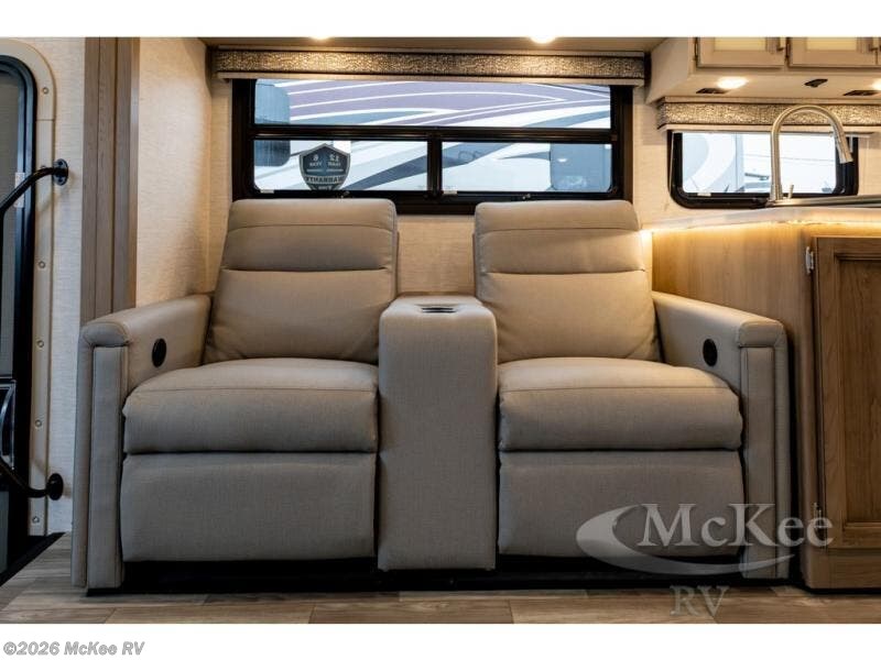 This spacious Class A motorhome has room to sleep eight! Enjoy the privacy of the rear king bedroom which has a spacious closet and a 32" LED Smart TV. Extra guests can utilize the Dream Dinette, the sofa bed, or the drop-down overhead bunk which has a Cotton Cloud mattress for comfort. As if that's not enough, there's a pair of leatherette theater seats with footrests so you can kick back and watch either the 39" or 50" LED Smart TV in the living room. You'll also find another TV outside. A full bath with 30" x 36" shower is conveniently located in the center so everyone has access, and the glass shower door and skylight make it feel roomy. The kitchen features a three-burner gas cooktop and oven, refrigerator, and stainless steel convection microwave. You will also appreciate the closet with stackable washer and dryer prep if you want to add those appliances!