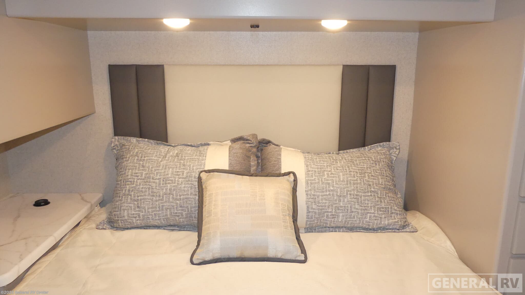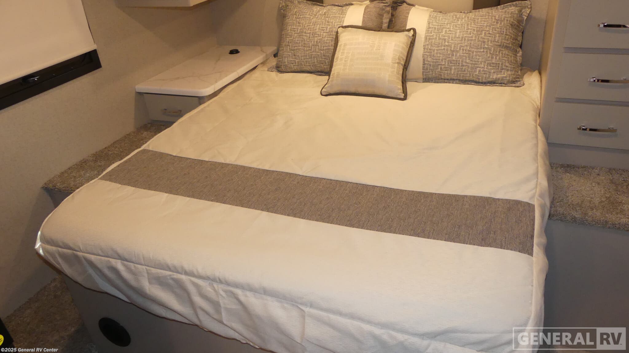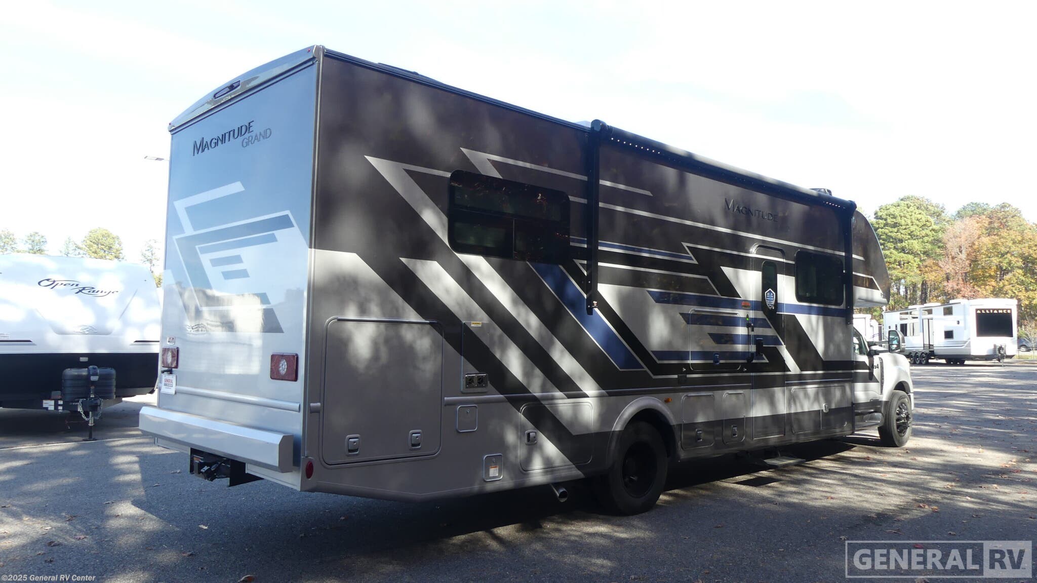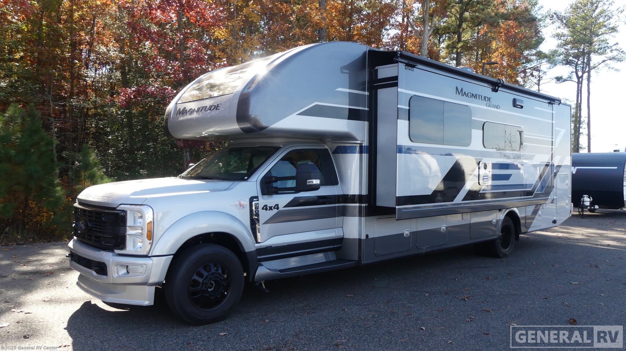 Thor Motor Coach Magnitude GRAND Super C diesel motorhome L35 highlights: Rear Bedroom Bed Over Bunk Full Bathroom Exterior TV This motorhome has everything you need to create unforgettable memories on the road. Retreat to the serene rear bedroom, featuring a plush queen bed, dual wardrobe beside the bed, and a 32” Smart TV. Conveniently located in the hallway are a closet with washer and dryer prep, and a pantry for storing all your essentials. In front of it, you'll find a spacious full bathroom with a linen closet, perfect for freshening up on the go. The kitchen boasts a residential refrigerator, three-burner cooktop, microwave, and 70” Dream Dinette. Relax and unwind in the 68” theater seating, while watching the 40” Smart TV located over the cab, plus, additional sleeping space is available in the 52” x 80” bunk over cab. And when you're ready to take the party outside, enjoy your favorite shows and movies on the exterior 32” Smart TV. The Magnitude GRAND Super C diesel motorhomes by Thor Motor Coach are built to last, featuring Vacu-bond laminated roofs and floors with block foam insulation for unparalleled durability and climate control which ensures a comfortable and quiet living space. Stay connected and entertained on the go with the innovative sync-enhanced voice recognition communication and entertainment system. With just the sound of your voice, you can control everything from navigation to music playlists. Setting up camp has never been easier, thanks to our automatic leveling jacks with a touchpad, simply press a button and let the system do the work for you. Inside, you'll enjoy incredible interior features like a spacious 84” interior ceiling height, perfect for comfortable living, solid countertops, designer headboard, bedspread, and pillow shams. Plus you can beat the heat with the dual 13,500 BTU roof air conditioners, providing superior cooling power to keep you comfortable in even the warmest climates. Explore our motorhome collection today and discover a new standard of luxury and adventure.
