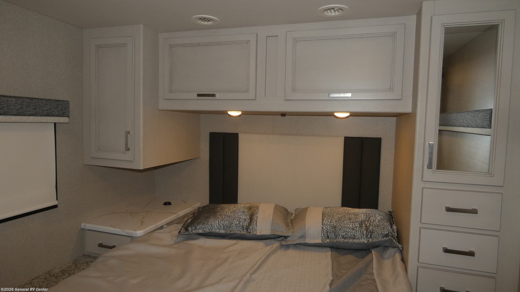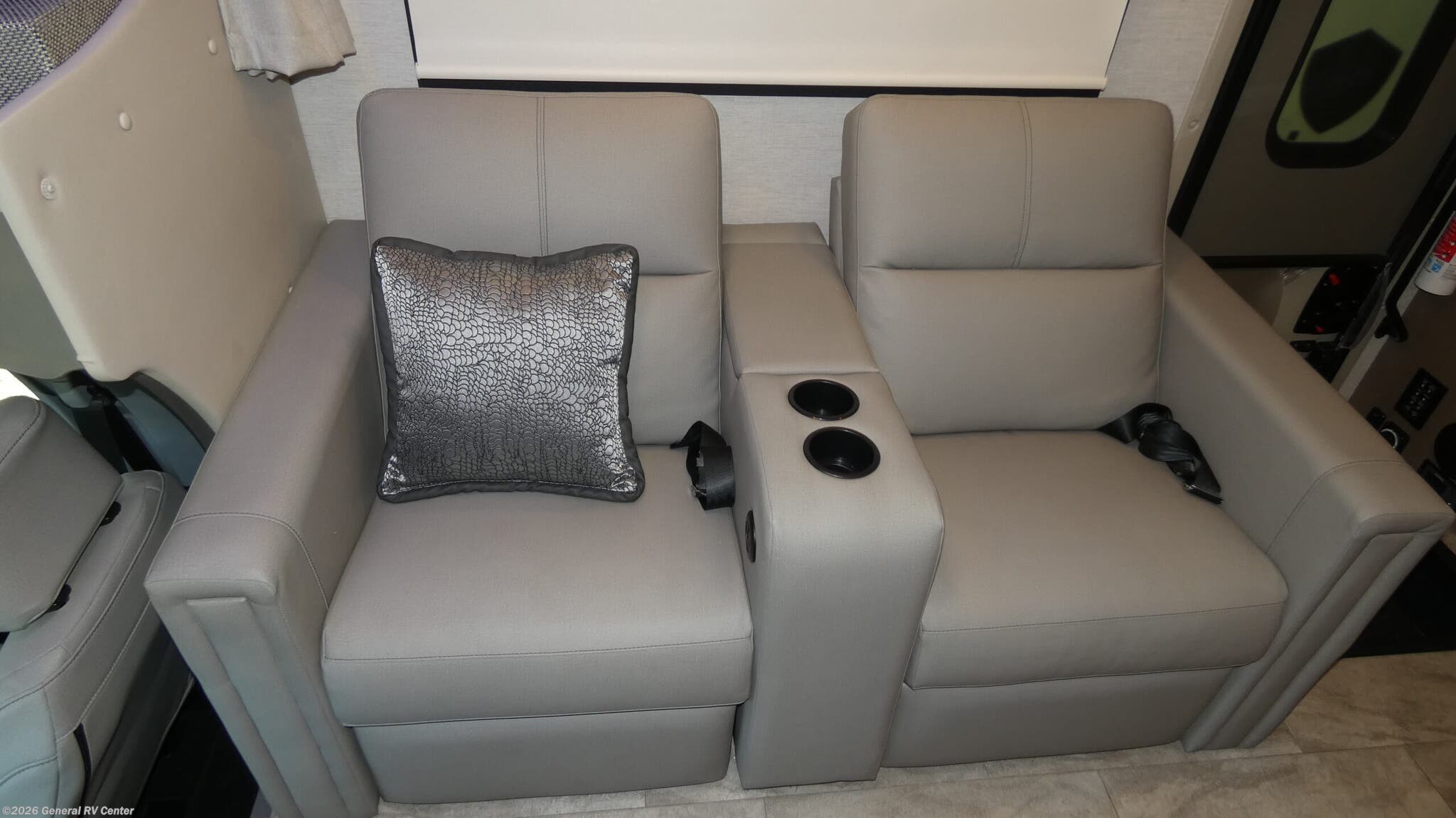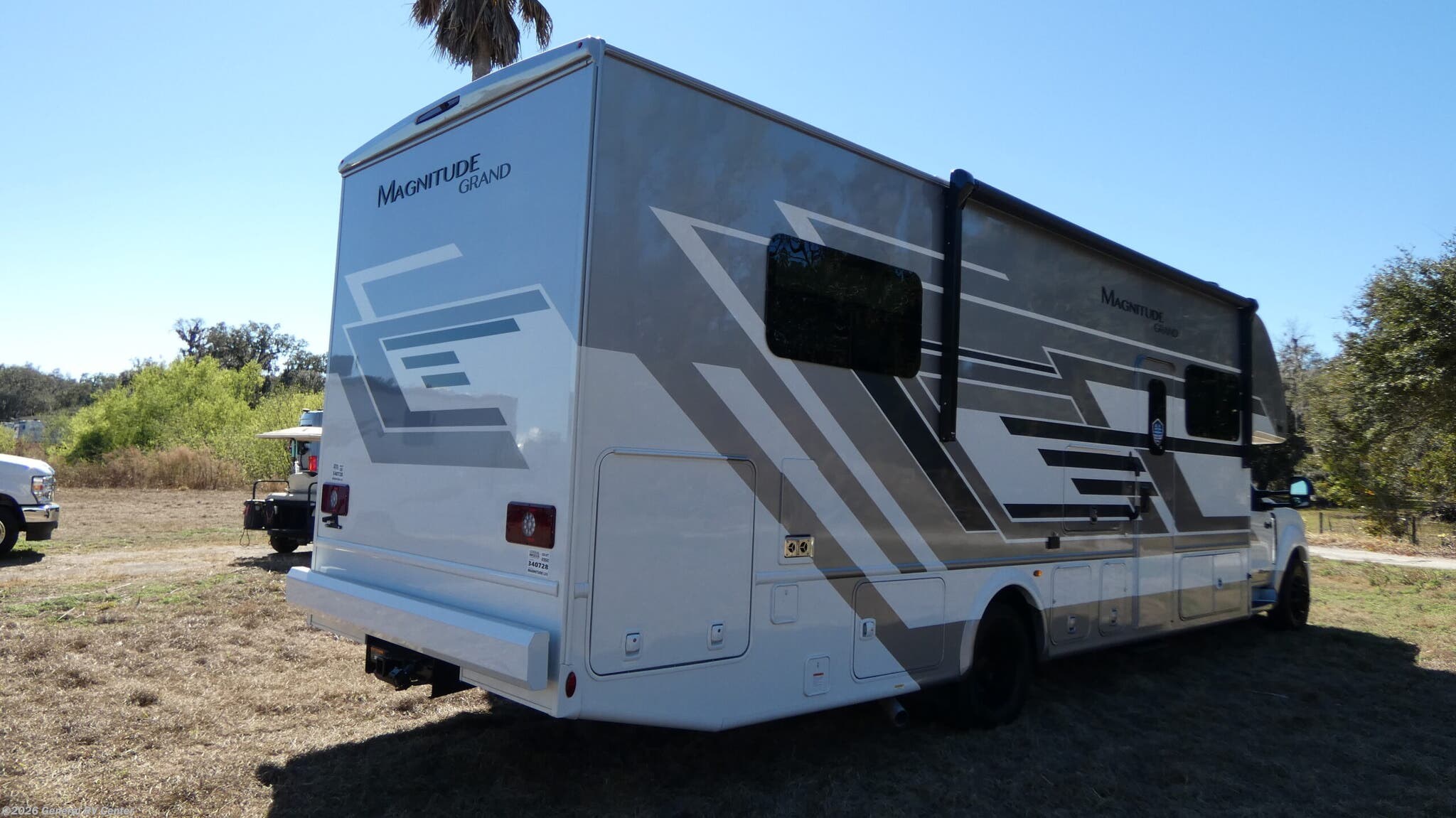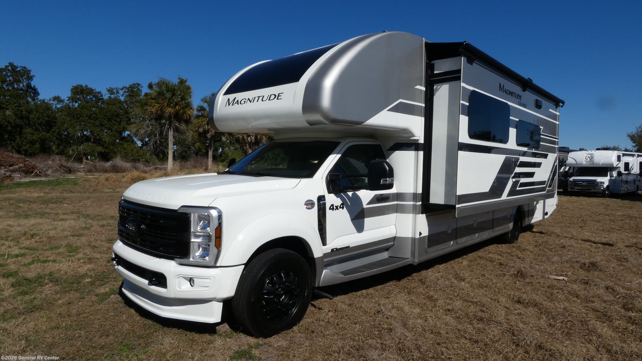 **Thor Motor Coach Magnitude GRAND Super C diesel motorhome L35 highlights:** * Rear Bedroom * Bed Over Bunk * Full Bathroom * Exterior TV This motorhome has everything you need to create unforgettable memories on the road. Retreat to the serene rear bedroom, featuring a plush queen bed, dual wardrobe beside the bed, and a 32” Smart TV. Conveniently located in the hallway are a closet with washer and dryer prep, and a pantry for storing all your essentials. In front of it, you'll find a spacious full bathroom with a linen closet, perfect for freshening up on the go. The kitchen boasts a residential refrigerator, three-burner cooktop, microwave, and 70” Dream Dinette. Relax and unwind in the 68” theater seating, while watching the 40” Smart TV located over the cab, plus, additional sleeping space is available in the 52” x 80” bunk over cab. And when you're ready to take the party outside, enjoy your favorite shows and movies on the exterior 32” Smart TV. The Magnitude GRAND Super C diesel motorhomes by Thor Motor Coach are built to last, featuring Vacu-bond laminated roofs and floors with block foam insulation for unparalleled durability and climate control which ensures a comfortable and quiet living space. Stay connected and entertained on the go with the innovative sync-enhanced voice recognition communication and entertainment system. With just the sound of your voice, you can control everything from navigation to music playlists. Setting up camp has never been easier, thanks to our automatic leveling jacks with a touchpad, simply press a button and let the system do the work for you. Inside, you'll enjoy incredible interior features like a spacious 84” interior ceiling height, perfect for comfortable living, solid countertops, designer headboard, bedspread, and pillow shams. Plus you can beat the heat with the dual 13,500 BTU roof air conditioners, providing superior cooling power to keep you comfortable in even the warmest climates. Explore our motorhome collection today and discover a new standard of luxury and adventure.