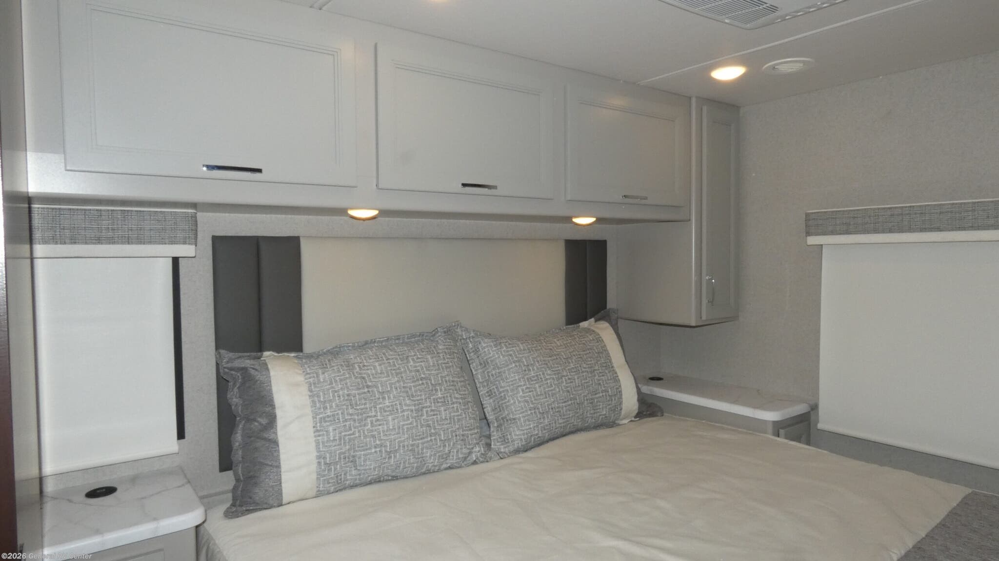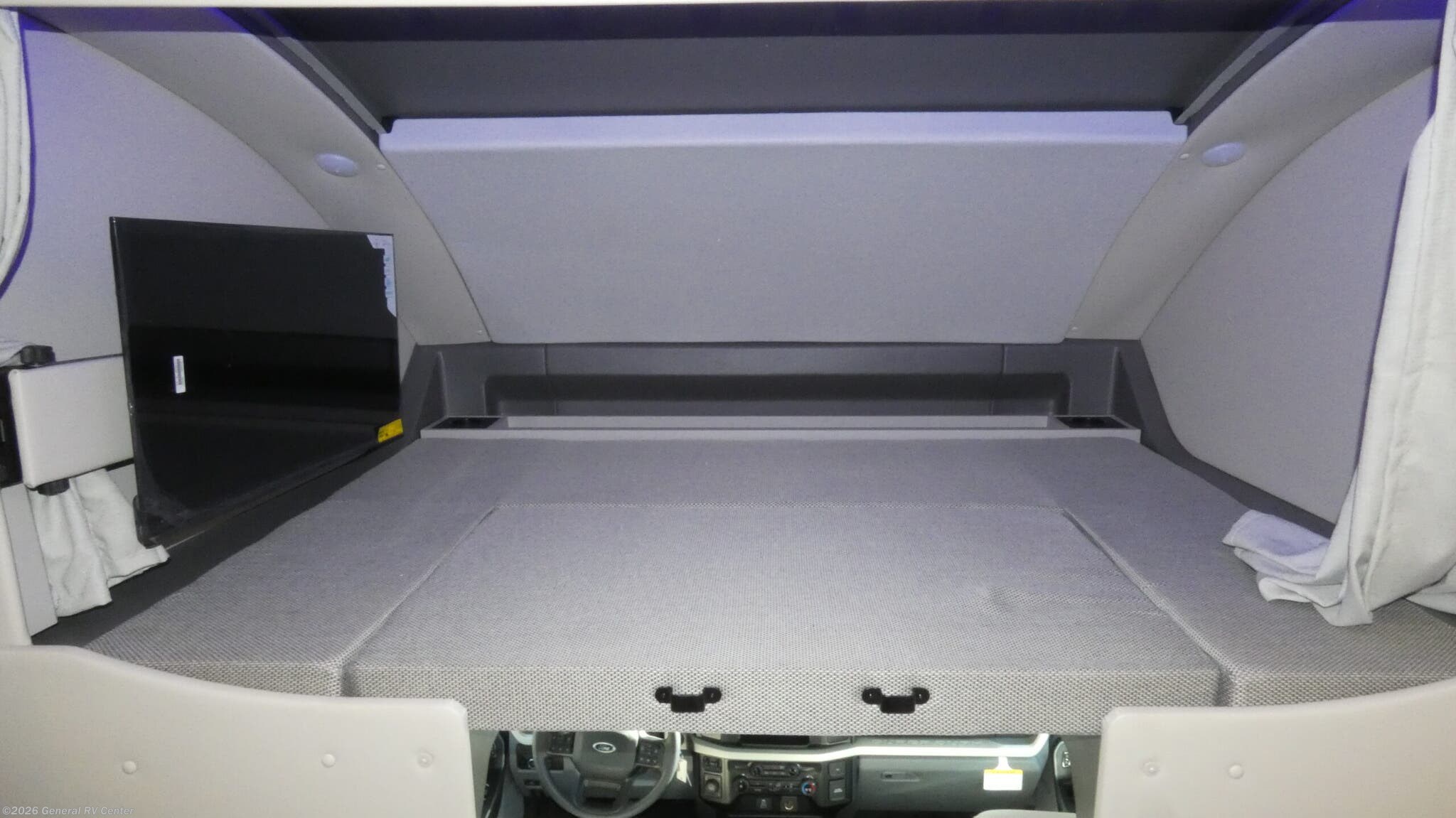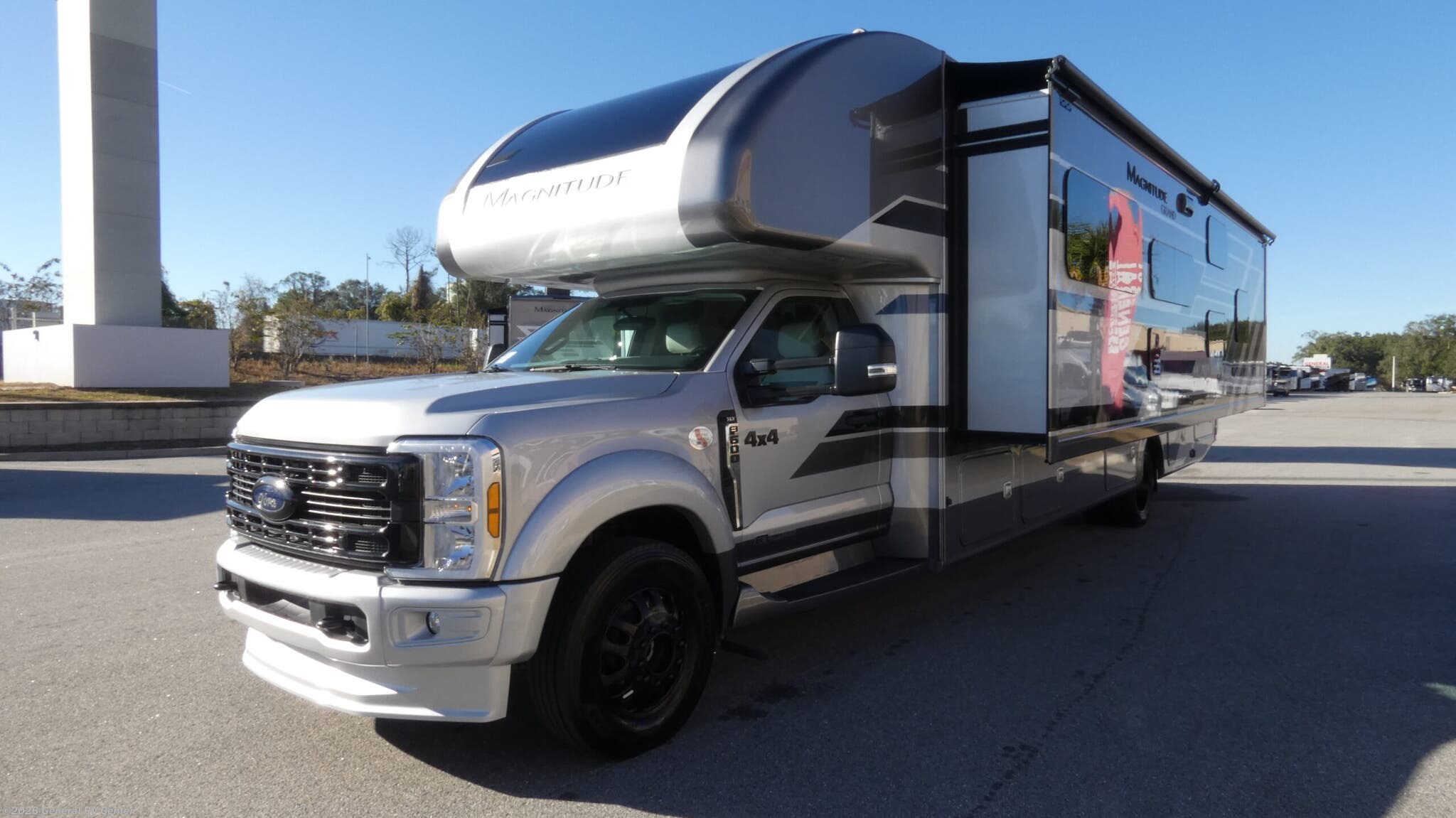 Thor Motor Coach Magnitude GRAND Super C diesel motorhome R36 highlights: Rear Bedroom Bunk Beds Full Bathroom Exterior TV 68” theater seating area The rear bedroom is a peaceful oasis, featuring a plush king bed, a spacious closet with a washer and dryer prep, a dresser, and a 32” Smart TV. You can accommodate the whole family with 26” x 72” bunk beds which also convert to a closet, in front, you will find a full bathroom with linen closet which ensures everyone stays fresh on the go. The kitchen is a gourmet's delight, boasting a residential refrigerator, a pantry perfect for keeping your stuff organized, a three-burner cooktop, microwave, and a 70” dream dinette ideal for grabbing meals with family and friends. Relax in the 68” theater seating area, while watching a movie in the 40” Smart TV. Additional sleeping space is available in the front bunk over the cab, plus you can spend entertaining yourself on the outside thanks to the 32” Smart TV on the exterior. The Magnitude GRAND Super C diesel motorhomes by Thor Motor Coach are built to last, featuring Vacu-bond laminated roofs and floors with block foam insulation for unparalleled durability and climate control which ensures a comfortable and quiet living space. Stay connected and entertained on the go with the innovative sync-enhanced voice recognition communication and entertainment system. With just the sound of your voice, you can control everything from navigation to music playlists. Setting up camp has never been easier, thanks to our automatic leveling jacks with a touchpad, simply press a button and let the system do the work for you. Inside, you'll enjoy incredible interior features like a spacious 84” interior ceiling height, perfect for comfortable living, solid countertops, designer headboard. Plus you can beat the heat with the dual 13,500 BTU roof air conditioners, providing superior cooling power to keep you comfortable in even the warmest climates. Explore our motorhome collection today and discover a new standard of luxury and adventure.