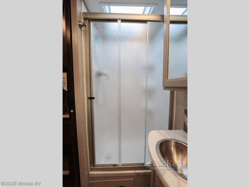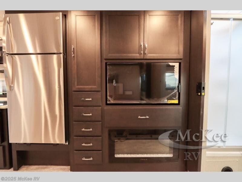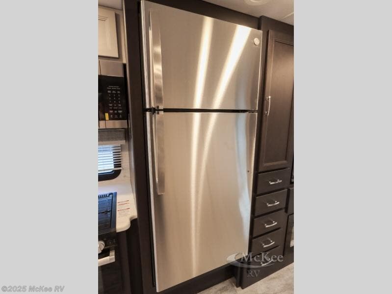 Enjoy traveling in this Magnitude Super C diesel motorhome that can easily sleep four or five! The rear bath provides a space saving sliding door, a 30" x 36" shower, a vanity with sink, and toilet. The Murphy bed allows versatility when you travel with friends providing plenty of seating and space during the day when the sofa is in place, then at night a 60" x 74" bed folds down. There is a closet in between the Murphy bed and 70" Dream Dinette which also provides seating during the day for meals or games, and can easily be transformed into sleeping space at night. Lastly, a 52" x 80" cab-over bunk that the kids will certainly be drawing straws for. And don't worry about having to stop for fast food since the kitchen includes a two-burner gas range with single induction cooktop, a convection microwave, and a stainless steel 16 cu. ft. residential refrigerator with an icemaker for your perishables! Oh, and did we mention fireplace and TV opposite the Murphy bed/sofa?!