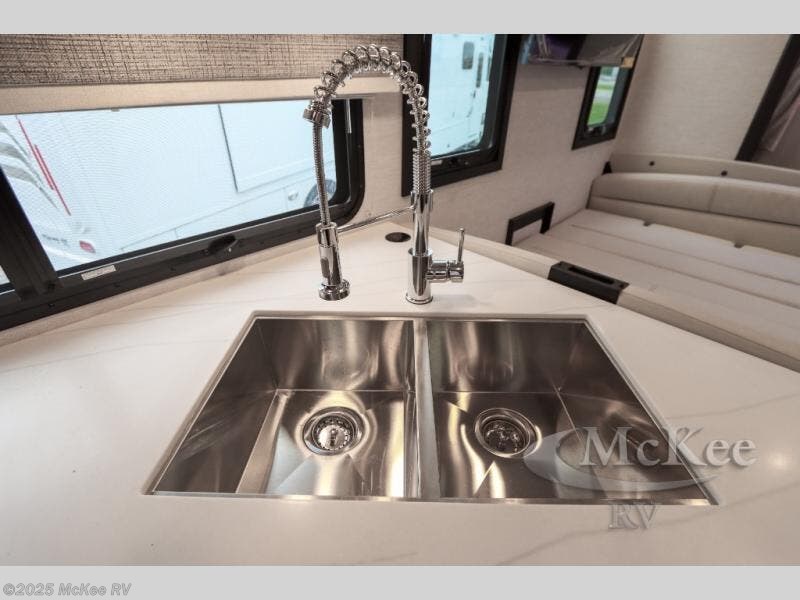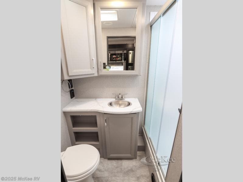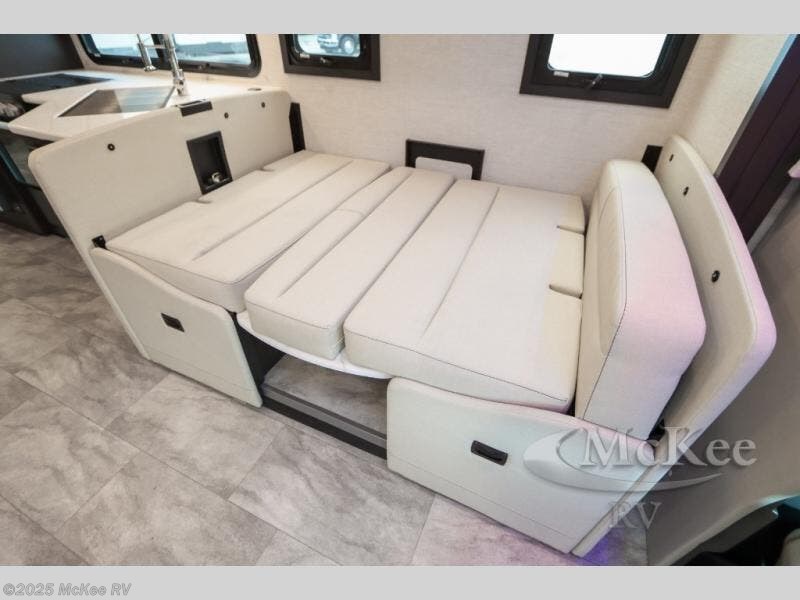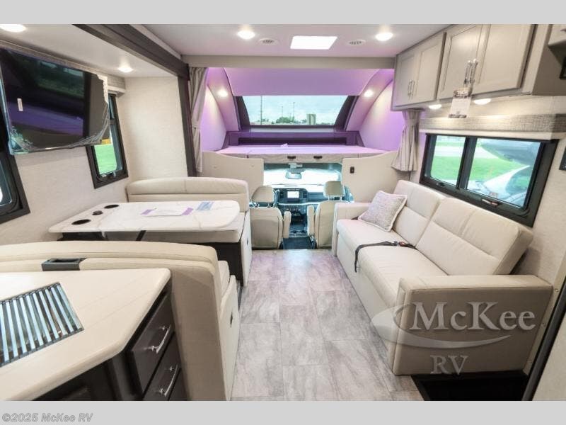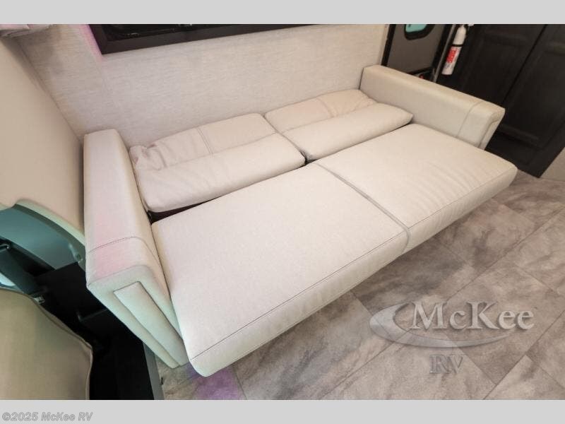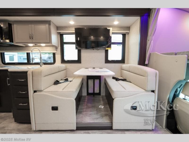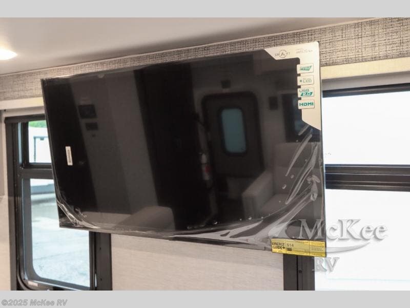 Escape to luxury with this incredible motorhome! The rear bedroom is a serene retreat, featuring a plush queen bed, spacious closet, dresser, and 32” Smart TV. A convenient full bathroom with a pantry and broom closet completes the space, perfect for freshening up on the go. The kitchen is a culinary haven, equipped with a residential refrigerator, three-burner cooktop, microwave, and 70” dream dinette where you can comfortably eat delicious meals. Relax in the 68” theater seating area, complete with 40” Smart TV, perfect for family movie nights or game days. Additional sleeping space is available in the bunk over cab, ensuring everyone has a comfortable place to rest. Create entertaining moments outside with the 32” exterior smart TV under the shade of the 14’ awning perfect for outdoor fun.