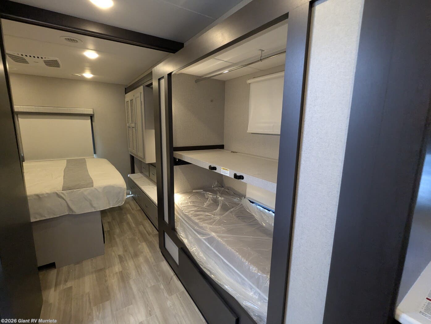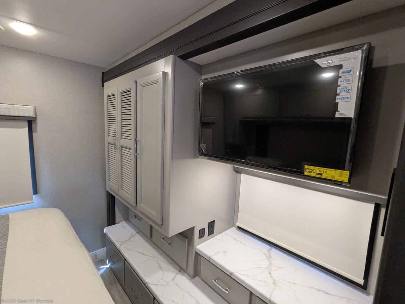 - Spacious Full-Wall Slide: Expansive living area with theater seating, a dinette, and a 50" LED Smart TV, comfortably sleeping up to 6 with a king bed and bunk beds.