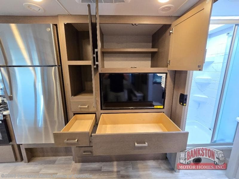 Pack your bags and experience a trip of a lifetime in this motorhome! The sofa with a 60" x 74" Murphy bed offers the versatility of a seating space during the day and a sleeping space at night. You also have a 52" x 80" bunk over cab for added sleeping or storage space. Freshen up after a long day of traveling in the full rear bathroom which has a 30" x 36" shower and plenty of countertop space to set your belongings. After the chef has prepared a delicious home cooked meal in the fully equipped kitchen, you can comfortably enjoy it at the 70" Dream Dinette which can also transform into a sleeping space. Across from the sofa is a fireplace with a TV and shelving/storage, plus you even have an exterior TV for a relaxing evening watching your favorite movies!