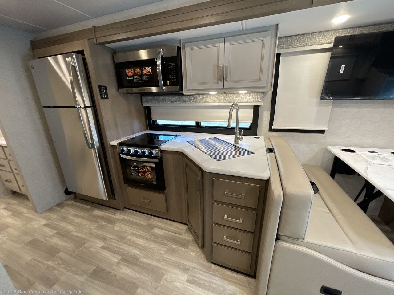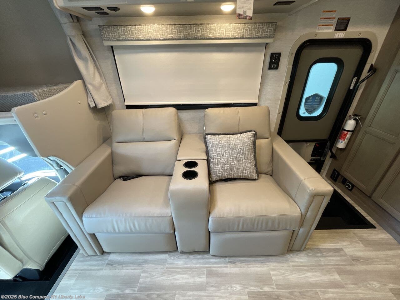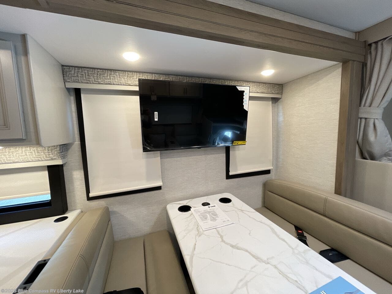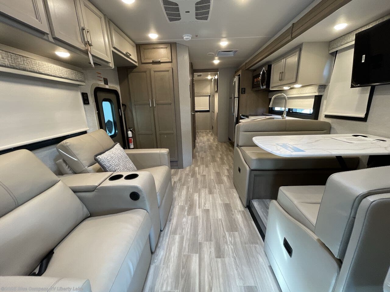 If you've been wanting to travel the country in style, now is the time with this motorhome that can sleep five people each night. The 40" living room Smart TV is directly across from the theater seating for easy viewing, plus there is a 32" bedroom Smart TV and an 32" exterior Smart TV for all your entertainment needs. The Dream Dinette will be the perfect place to enjoy breakfast each morning as you plan out your day, or you may just want to sit at the picnic table under the 14' power awning. This model includes a mid-ship full bath with a shower skylight that will not only provide more natural light, but will give you more head room as you wash up. The rear private bedroom will feel just like home with its 60" x 75" queen bed slide out, plus there is a wardrobe to keep your clothes tidy!