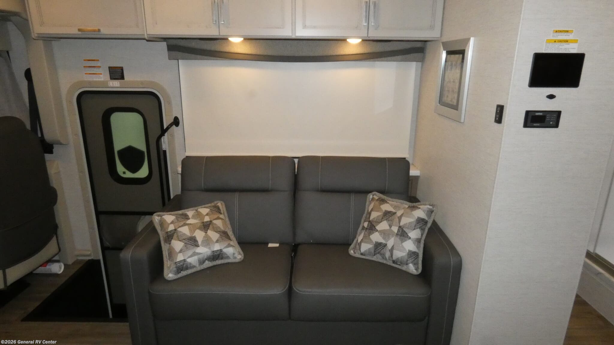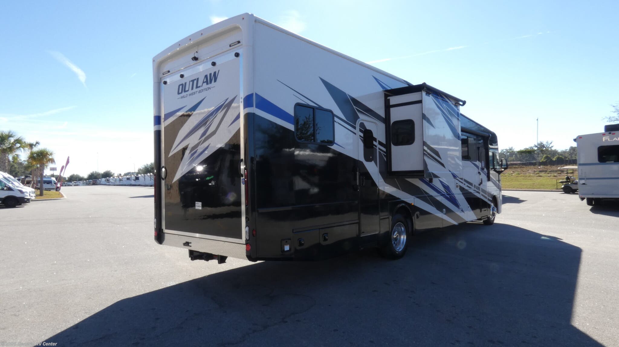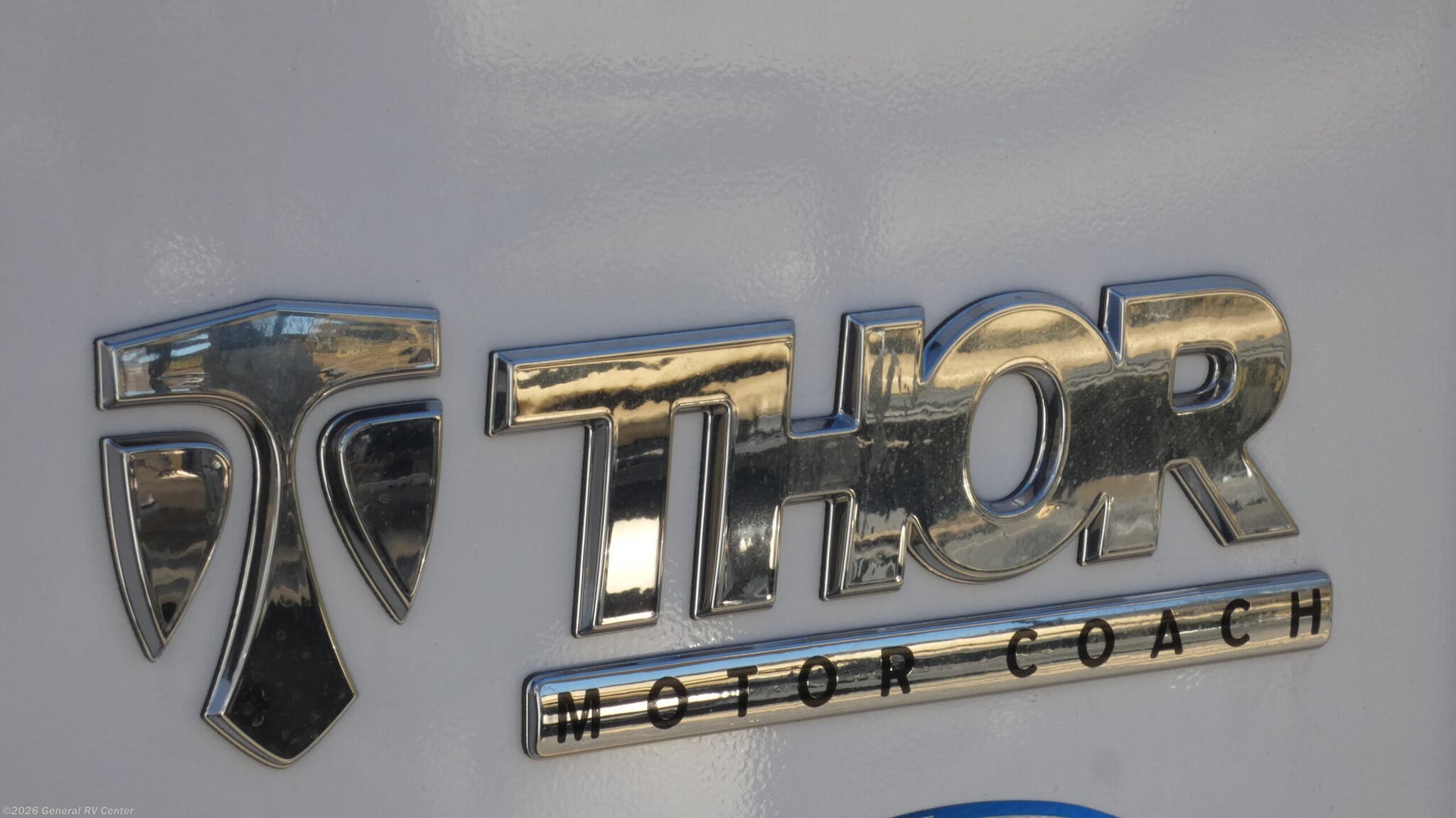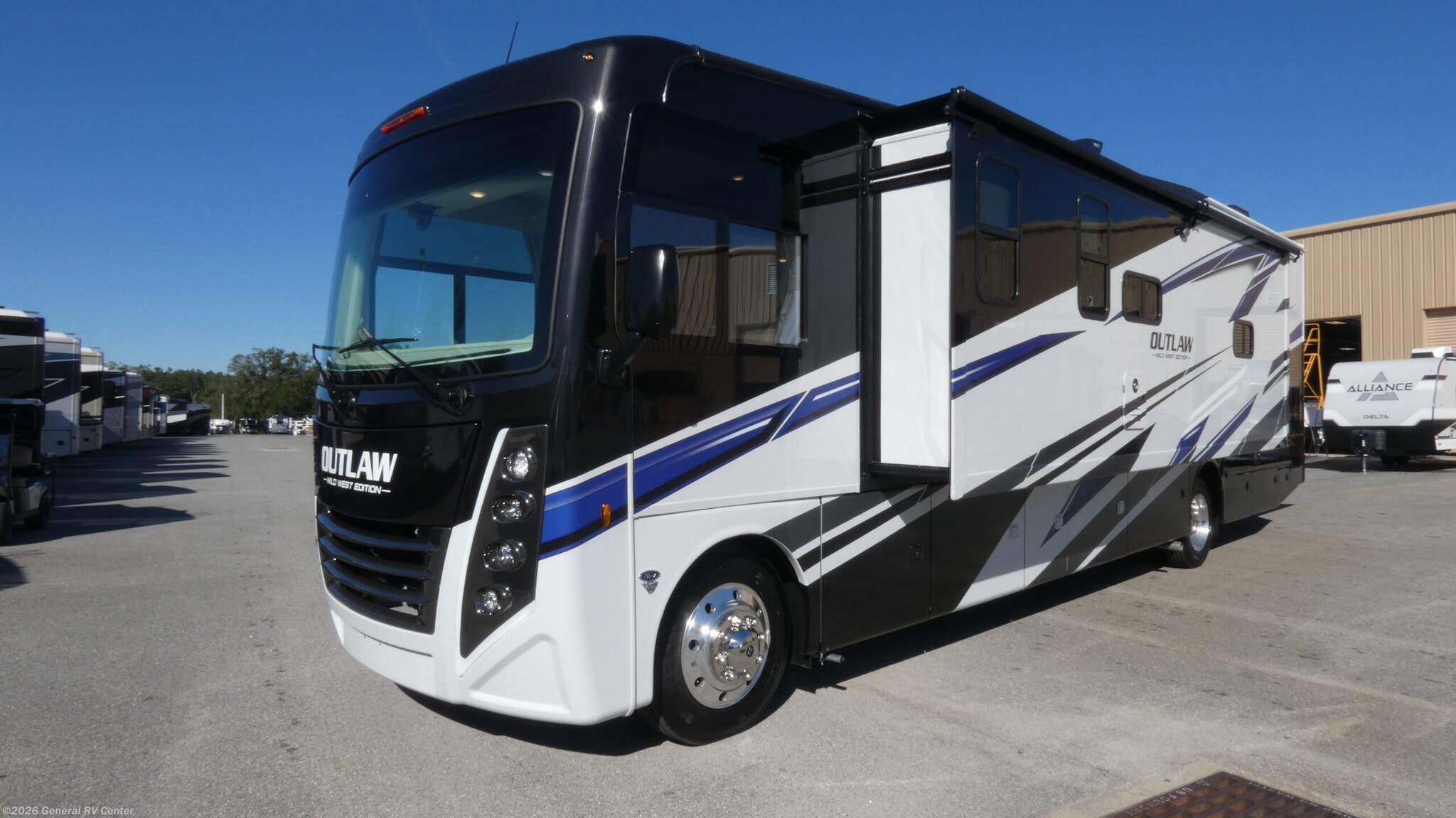 Step into the future of RV living with the 2026 Thor Motor Coach Outlaw 38MB. This dynamic motorhome is designed for those who crave adventure without sacrificing comfort. With the capacity to sleep up to 12, this RV is perfect for family getaways or traveling with friends. The thoughtfully designed floorplan features a front living area with a 72" Dream Dinette, perfect for dining or gathering around for game nights. The center kitchen is equipped with a full-size electric refrigerator and convection cooking, ensuring you can whip up your favorite meals with ease. The Outlaw 38MB shines with its unique features, including a rear garage area that transforms into a versatile patio deck, adding a new dimension to your outdoor experience. The center bedroom offers a cozy queen bed, while multiple convertible sleeping areas provide ample options for guests. With a generous fresh water capacity of 150 gallons and convenient amenities like a washer and dryer, this RV is ready for extended adventures. Powered by a robust Ford F53 chassis with 335 horsepower, the Outlaw ensures a smooth journey wherever the road takes you. For more information, visit your nearest General RV dealership and explore the possibilities of the Thor Outlaw 38MB.