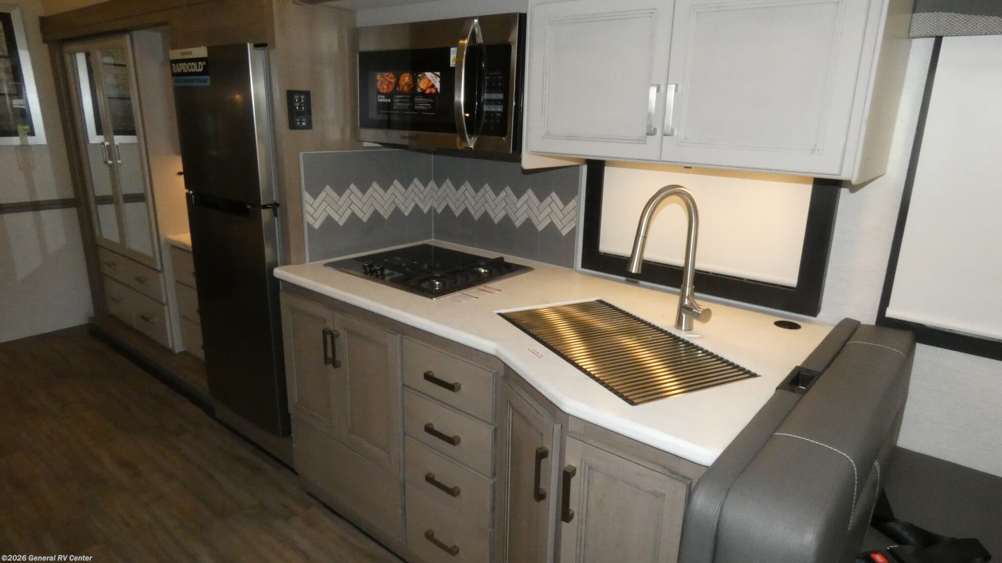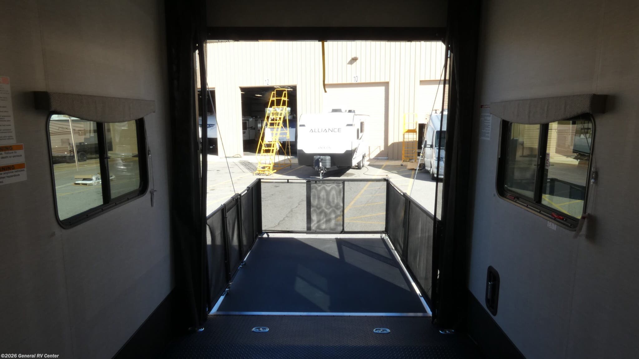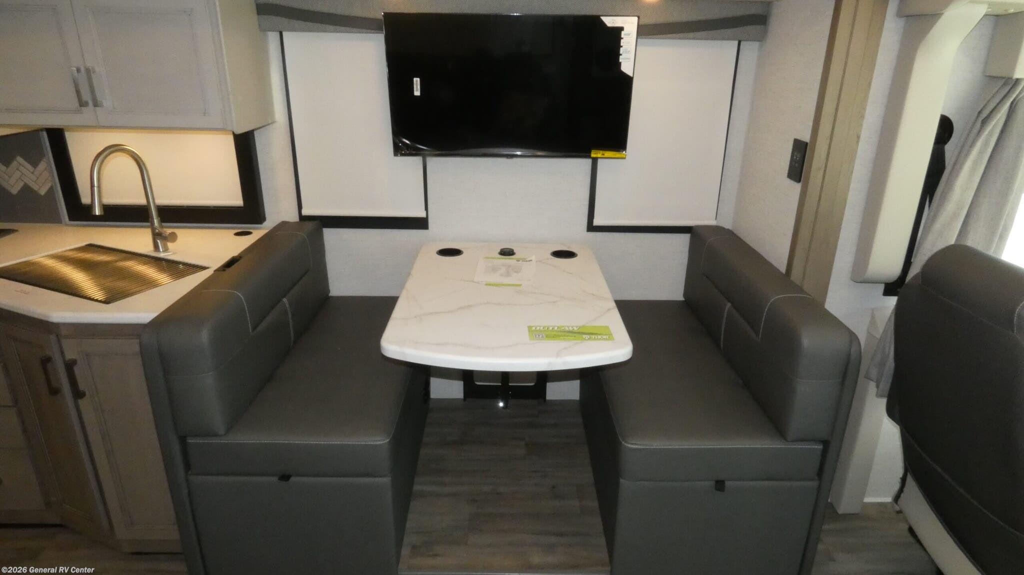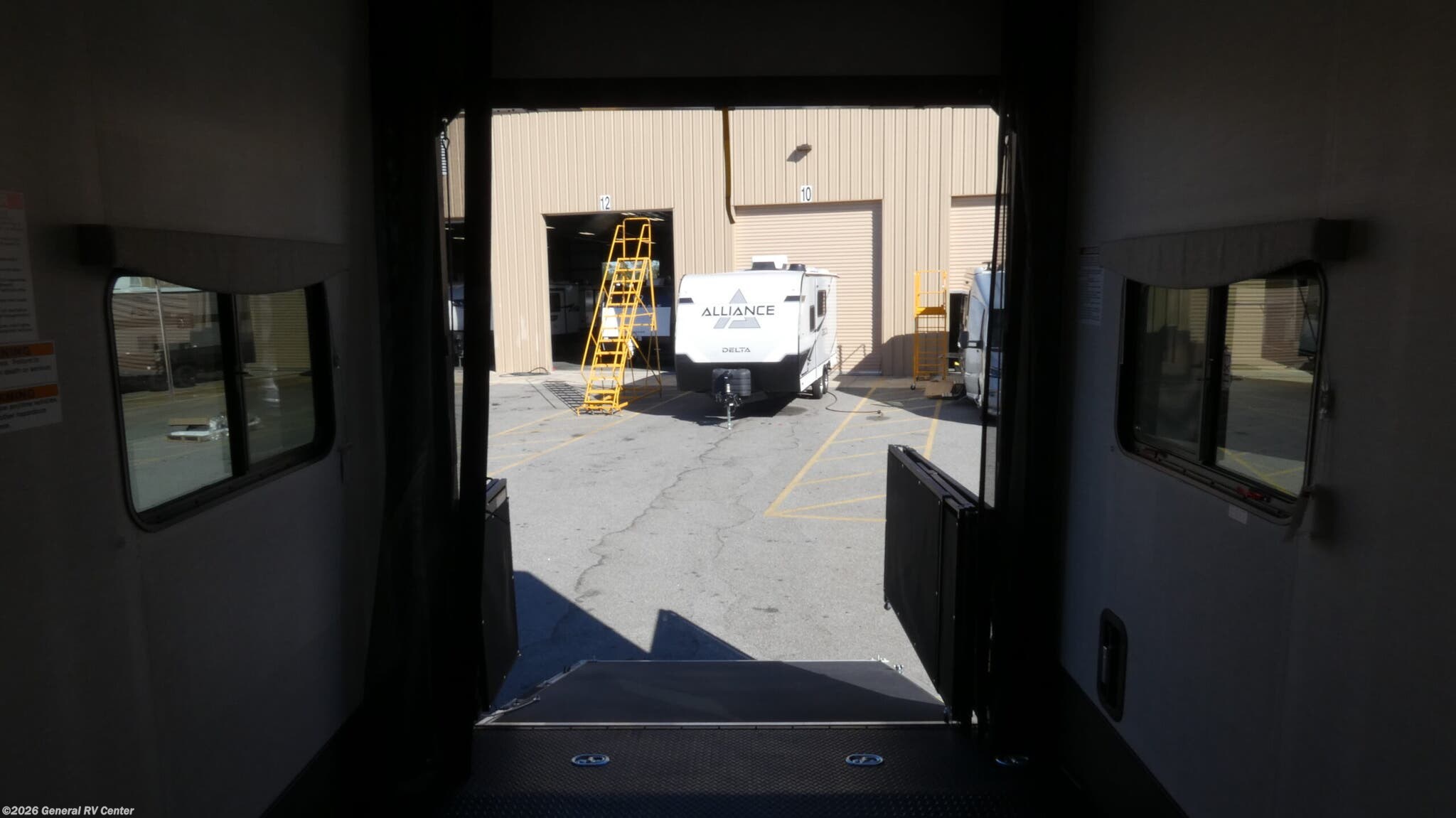 Step into the future of RV living with the 2026 Thor Motor Coach Outlaw 38MB. This dynamic motorhome is designed for those who crave adventure without sacrificing comfort. With the capacity to sleep up to 12, this RV is perfect for family getaways or traveling with friends. The thoughtfully designed floorplan features a front living area with a 72" Dream Dinette, perfect for dining or gathering around for game nights. The center kitchen is equipped with a full-size electric refrigerator and convection cooking, ensuring you can whip up your favorite meals with ease. The Outlaw 38MB shines with its unique features, including a rear garage area that transforms into a versatile patio deck, adding a new dimension to your outdoor experience. The center bedroom offers a cozy queen bed, while multiple convertible sleeping areas provide ample options for guests. With a generous fresh water capacity of 150 gallons and convenient amenities like a washer and dryer, this RV is ready for extended adventures. Powered by a robust Ford F53 chassis with 335 horsepower, the Outlaw ensures a smooth journey wherever the road takes you. For more information, visit your nearest General RV dealership and explore the possibilities of the Thor Outlaw 38MB.