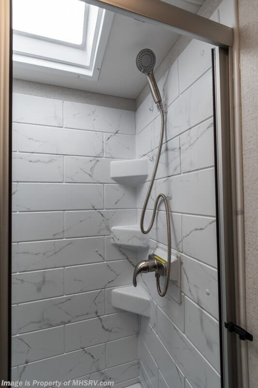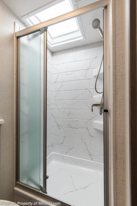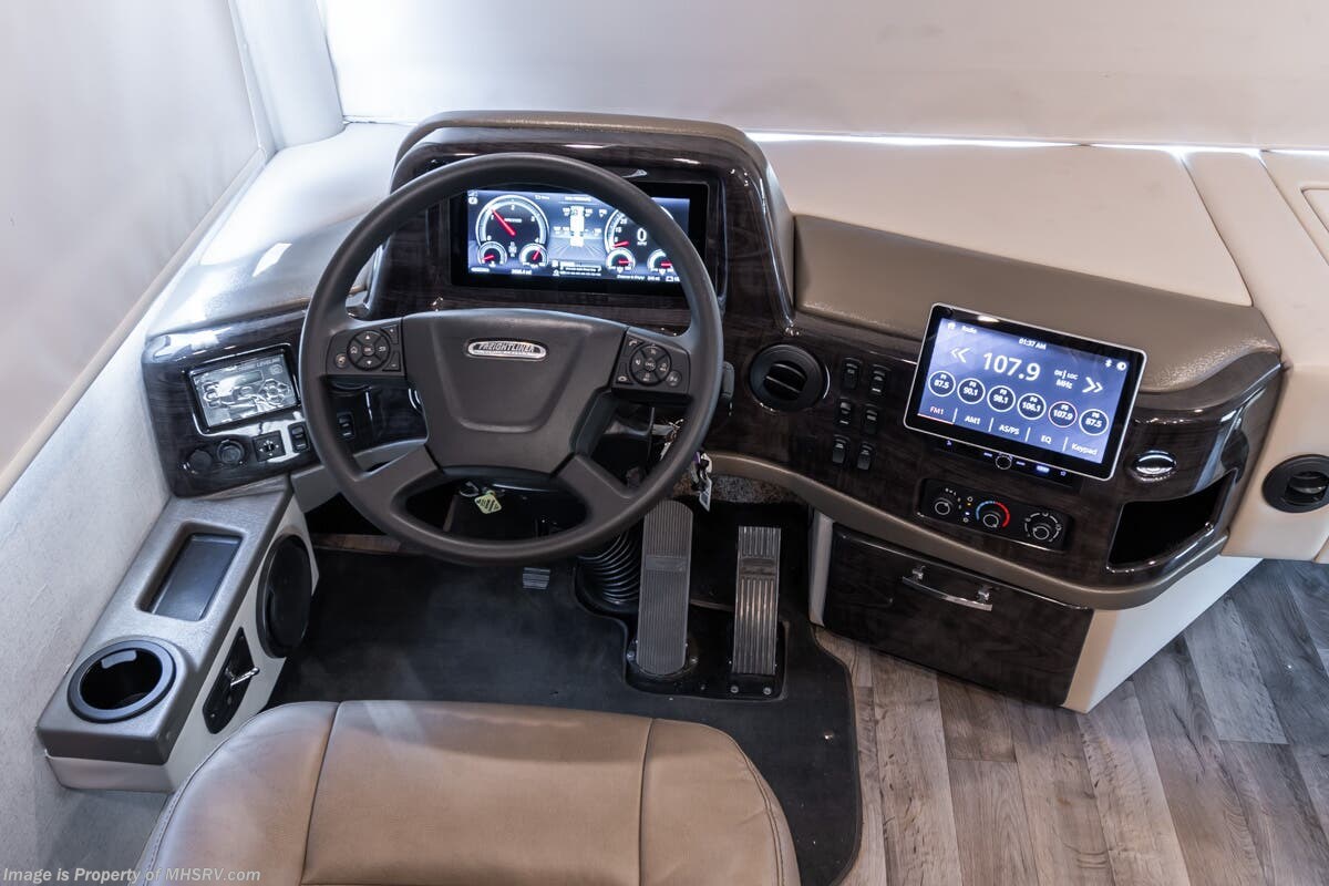 More About This RV This RV features LCI hydraulic leveling, aluminum wheels, full body paint, diesel generator, Freightliner chassis, Cummins diesel engine, tilt steering wheel, smart wheel, secondary auxiliary brake, patio awning, pass through storage, LED running lights, docking lights, black tank flush, water filtration system, exterior shower, fiberglass roof, solar, inverter, air ride, 7 foot ceiling, dual pane windows, multi-plex control panel, convection microwave, residential refrigerator, solid surface counter, theater seats, ovehead loft and much more