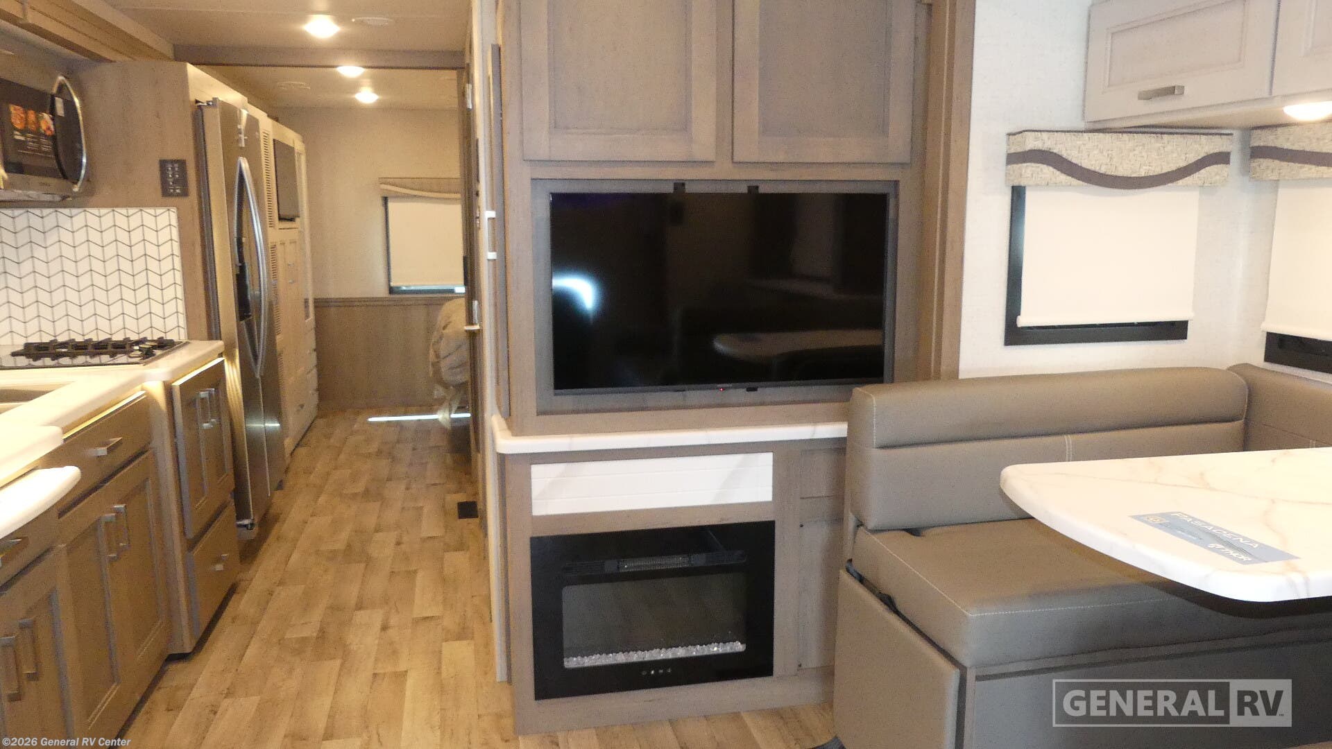 Thor Motor Coach Pasadena Super C diesel motorhome 38FX highlights: Rear Private Bedroom Bunk Over Cab Fireplace Theater Seating Exterior 40" TV You will feel right at home in this motorhome! It features a rear private bedroom with a 72" x 80" Tilt-A-View inclining king bed to lay your head on at night while you watch a movie across from the 32" Smart LED TV, plus there is a closet and an area with stackable washer and dryer prep for clean clothes throughout your entire trip. Speaking of clean, you can clean up each morning in the full bathroom with the 30" x 42" shower then head to the kitchen to whip up a delicious breakfast with the two burner high-output range with single induction cooktop. You can enjoy your meals at the booth dinette and relax by the fireplace on either the 68" sofa or theater seating which can be switched out for an optional sofa. There is also a 52" x 80" bunk over cab area that can be used as an extra sleeping or storage space! With any Pasadena Super C diesel motorhome by Thor Motor Coach, the rotocast basement pass-through storage compartments are durable and easy to clean. Other capabilities include the automotive dash with Android Auto and/or Apple CarPlay on a large 10.1" touch screen when you plug in your phone, and a side view camera system, plus a significant gross combined vehicle rating of the chassis allows plenty of pulling capacity even when fully loaded. There is even solar onboard and a Winegard ConnecT 5G system to stay connected. The S2RV Freightliner chassis with Atlas foundation might be the reason you looked at this coach, yet all the other features might be why you decide to go big and choose a Pasadena such as the residential linoleum throughout, the leatherette home theater seating with footrests, the solid surface countertops and designer backsplash in the kitchen, and the list continues!