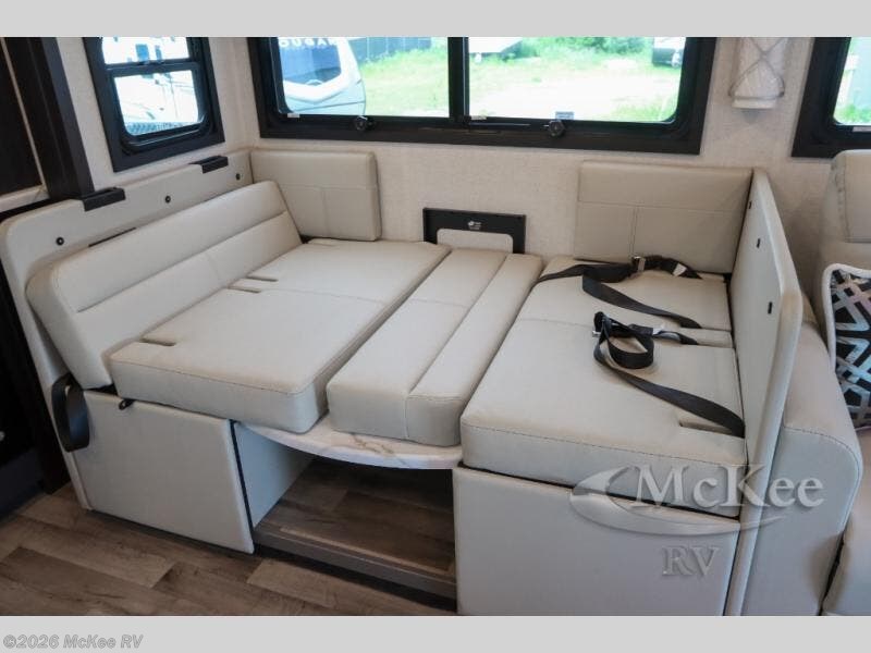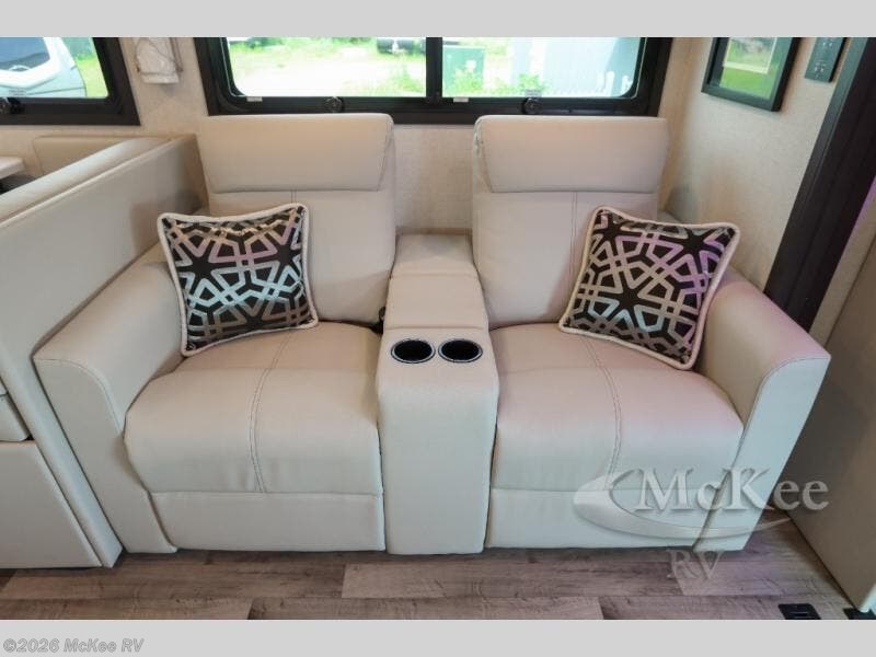 With any Pasadena Super C diesel motorhome by Thor Motor Coach, the rotocast basement pass-through storage compartments are durable and easy to clean. Other capabilities include the automotive dash with Android Auto and/or Apple CarPlay on a large 10.1" touch screen when you plug in your phone, and a side view camera system, plus a significant gross combined vehicle rating of the chassis allows plenty of pulling capacity even when fully loaded. There is even solar onboard and a Winegard ConnecT 5G system to stay connected. The S2RV Freightliner chassis with Atlas foundation might be the reason you looked at this coach, yet all the other features might be why you decide to go big and choose a Pasadena such as the residential linoleum throughout, the leatherette home theater seating with footrests, the solid surface countertops and designer backsplash in the kitchen, and the list continues!