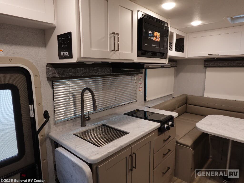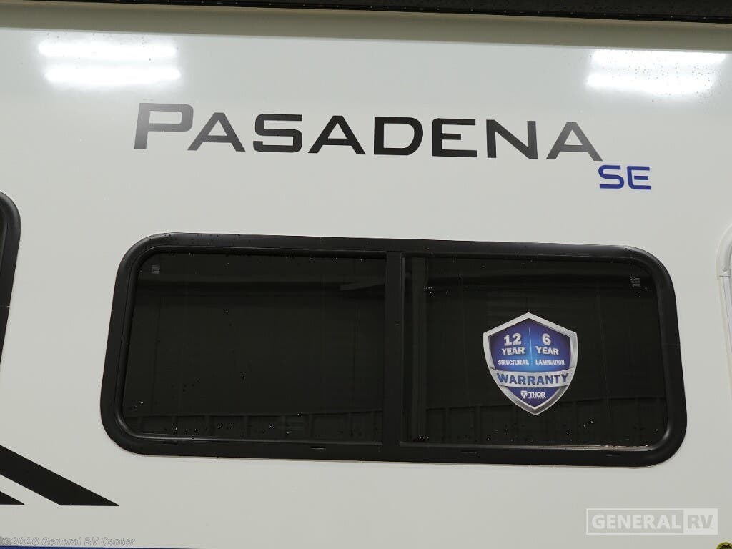 This compact, yet cozy coach is perfect for trips to the campground each weekend! Once you've reached your destination, you can set up the 11' power awning, unload the exterior storage compartments, and relax in your camp chairs. The two burner gas cooktop and convection microwave with an air fryer will let you make meals each day, and there is a 12V refrigerator to keep food fresh. A flip-up counter is another great feature that will give you more prep space! You can freshen up in the wet bath, grab your night clothes from the closet, then convert the U-shaped dinette into a 54" x 77" bed for a great night's rest! With any Pasadena SE Class C gas motorhome by Thor Motor Coach, you will find convenient amenities, a modern interior, and a reliable Ford E-Series chassis, with an optional Chevy chassis on select models to power your adventures. There is a one-piece fiberglass front cap, and premium one-piece roofing for added strength. Residential vinyl flooring will be easy to keep clean, and you'll love the LED lighting, pressed laminate countertops throughout, and full-extensions ball-bearing drawer guides. These motorhomes also include a 4.0 kW gas generator and a 30-amp shoreline power cord to keep you going, along with a tankless water heater to ensure your comfort!
