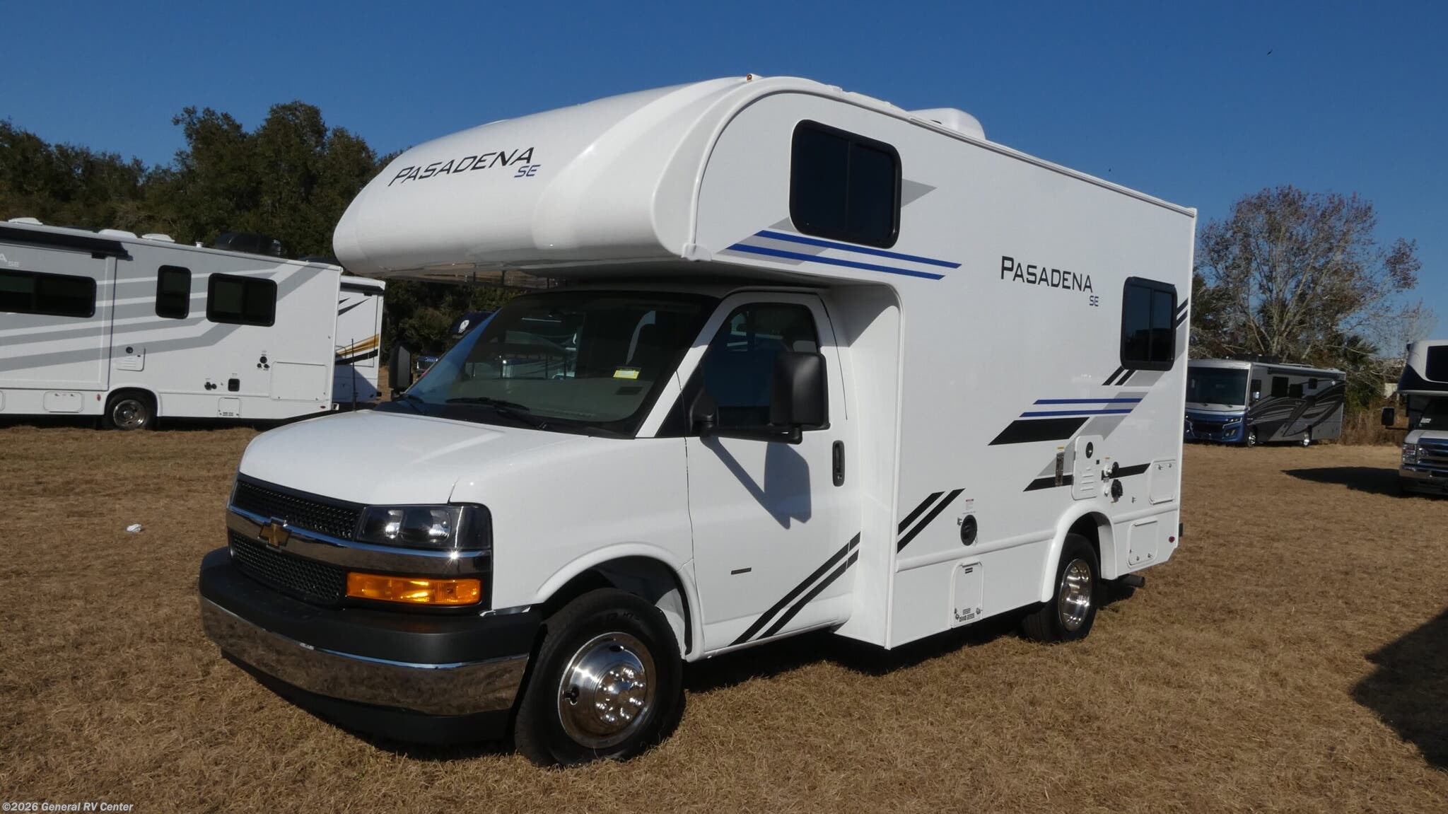 Thor Motor Coach Pasadena SE Class C gas motorhome SE19 Chevy highlights: U-Shaped Dinette with Bed Conversion Wet Bath Flip-Up Countertop Cab TV with Swivel This compact, yet cozy coach is perfect for trips to the campground each weekend! Once you've reached your destination, you can set up the 11' power awning, unload the exterior storage compartments, and relax in your camp chairs. The two burner gas cooktop and convection microwave with an air fryer will let you make meals each day, and there is a 12V refrigerator to keep food fresh. A flip-up counter is another great feature that will give you more prep space! You can freshen up in the wet bath, grab your night clothes from the closet, then convert the U-shaped dinette into a 54" x 77" bed for a great night's rest! With any Pasadena SE Class C gas motorhome by Thor Motor Coach, you will find convenient amenities, a modern interior, and a reliable Ford E-Series chassis, with an optional Chevy chassis on select models to power your adventures. There is a one-piece fiberglass front cap, and premium one-piece roofing for added strength. Residential vinyl flooring will be easy to keep clean, and you'll love the LED lighting, pressed laminate countertops throughout, and full-extensions ball-bearing drawer guides. These motorhomes also include a 4.0 kW gas generator and a 30-amp shoreline power cord to keep you going, along with a tankless water heater to ensure your comfort!