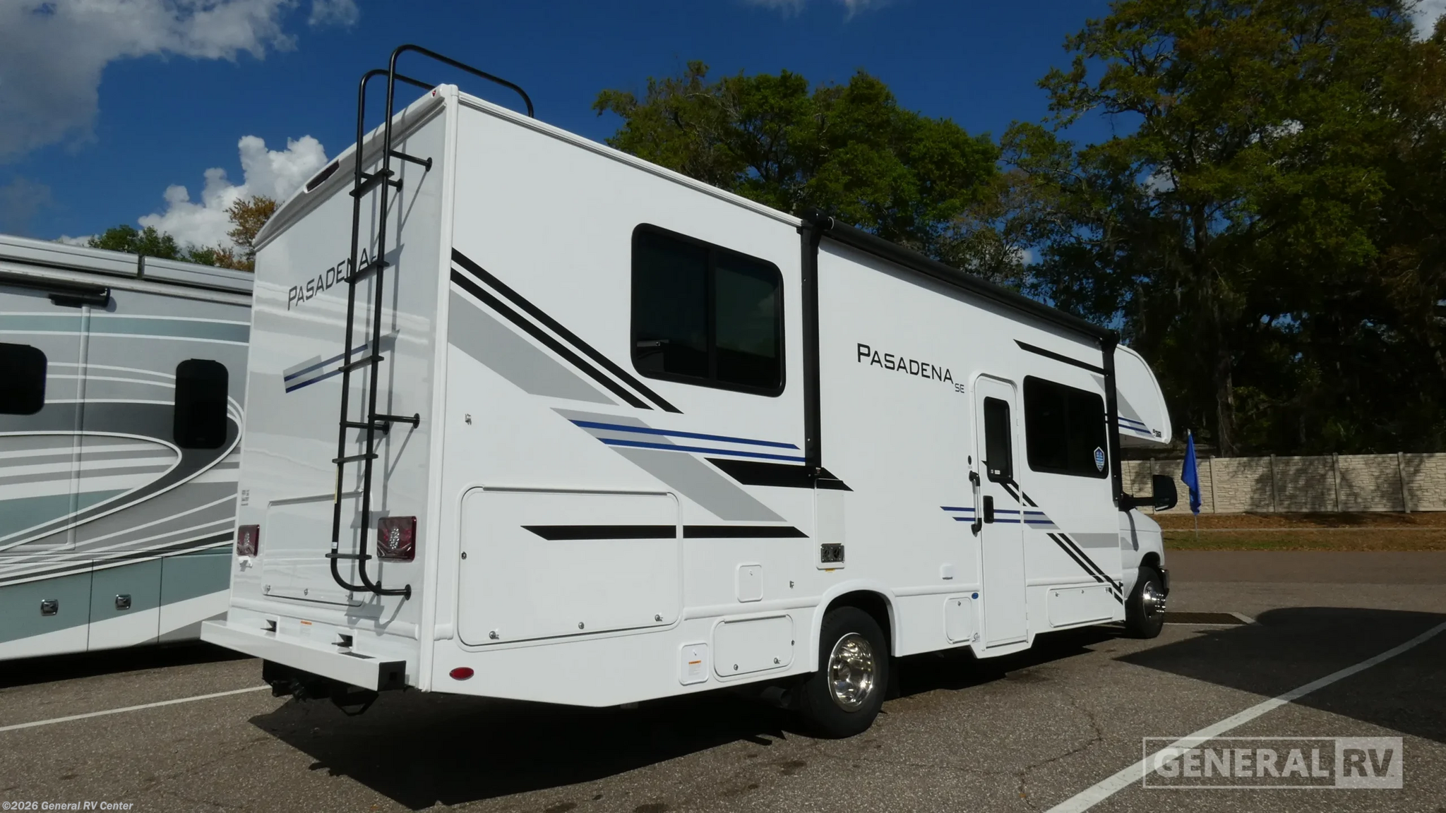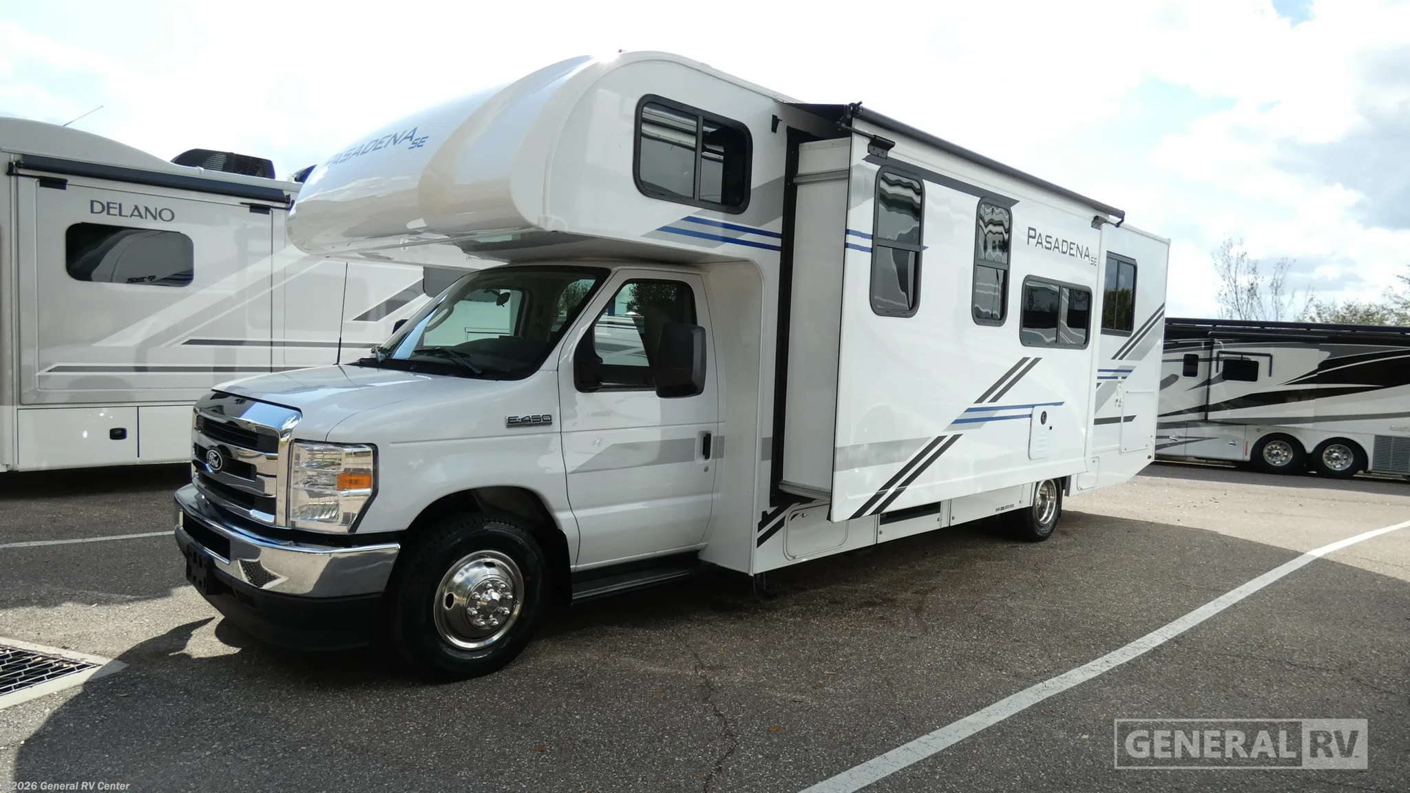 Thor Motor Coach Pasadena SE Class C gas motorhome SE28 highlights: Theater Seating Cab-Over Bunk Rear Private Bedroom Exterior Kitchen Plan to stay awhile in this spacious coach for five. Once you park for the day, you can start lunch on the three burner cooktop or in the microwave oven. There is a Dream dinette where you can dine at plus 68" theater seating to relax after your meal. A full bath includes a 24" x 36" shower to freshen up each day, and you'll feel right at home in the rear private bedroom. Here, you'll find an RV queen bed, dual bedside closets, and TV prep if you want the option to watch movies in bed. With any Pasadena SE Class C gas motorhome by Thor Motor Coach, you will find convenient amenities, a modern interior, and a reliable Ford E-Series chassis, to power your adventures. There is a one-piece fiberglass front cap, and premium one-piece roofing for added strength. Residential vinyl flooring will be easy to keep clean, and you'll love the LED lighting, pressed laminate countertops throughout, and full-extensions ball-bearing drawer guides. These motorhomes also include a generator and a 30-amp shoreline power cord to keep you going, along with a tankless water heater to ensure your comfort!