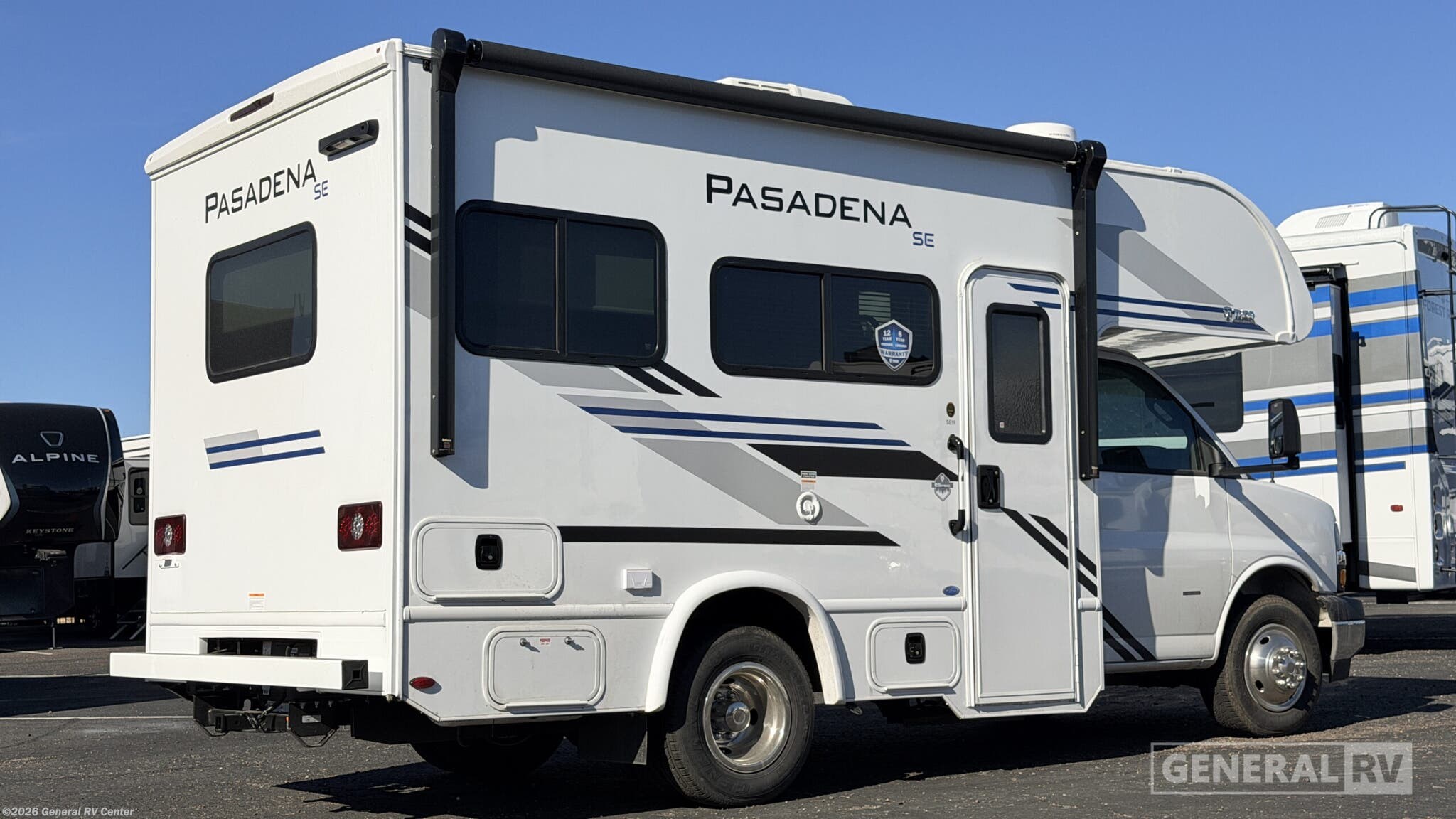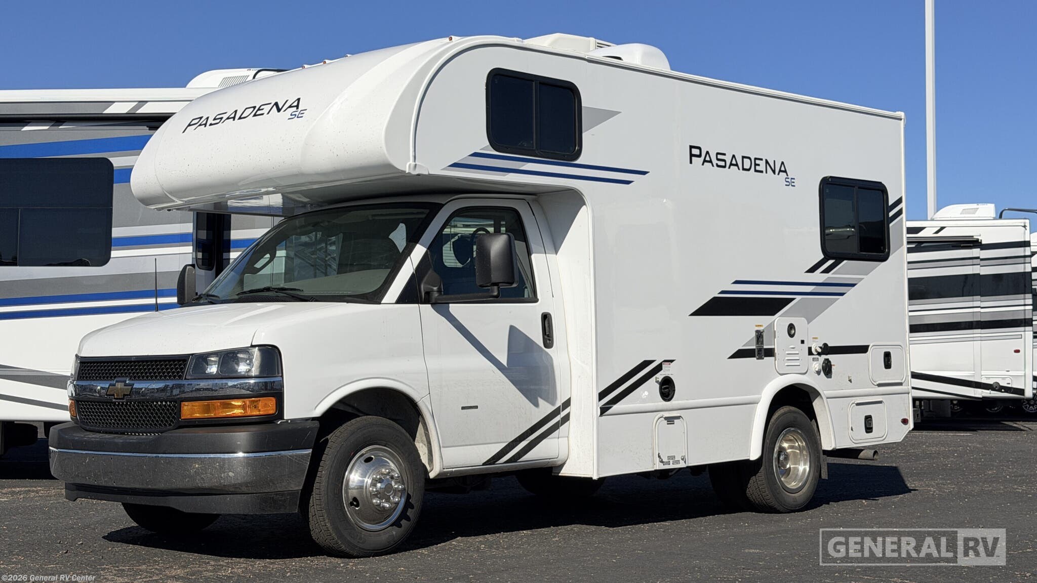 Thor Motor Coach Pasadena SE Class C gas motorhome SE19 Chevy highlights: U-Shaped Dinette with Bed Conversion Wet Bath Flip-Up Countertop Cab TV with Swivel This compact, yet cozy coach is perfect for trips to the campground each weekend! Once you've reached your destination, you can set up the 11' power awning, unload the exterior storage compartments, and relax in your camp chairs. The two burner gas cooktop and convection microwave with an air fryer will let you make meals each day, and there is a 12V refrigerator to keep food fresh. A flip-up counter is another great feature that will give you more prep space! You can freshen up in the wet bath, grab your night clothes from the closet, then convert the U-shaped dinette into a 54" x 77" bed for a great night's rest! With any Pasadena SE Class C gas motorhome by Thor Motor Coach, you will find convenient amenities, a modern interior, and a reliable Chevy chassis. There is a one-piece fiberglass front cap, and premium one-piece roofing for added strength. Residential vinyl flooring will be easy to keep clean, and you'll love the LED lighting, pressed laminate countertops throughout, and full-extensions ball-bearing drawer guides. These motorhomes also include a generator and a 30-amp shoreline power cord to keep you going, along with a tankless water heater to ensure your comfort!