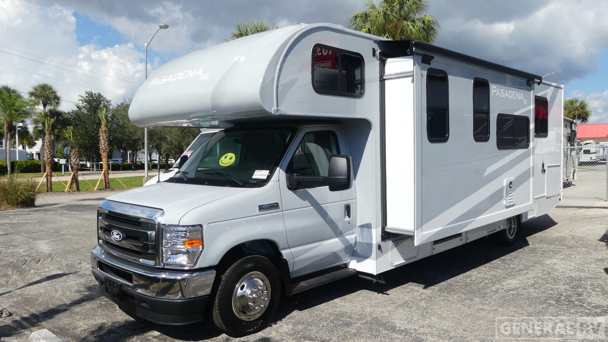 Thor Motor Coach Pasadena SE Class C gas motorhome SE28 highlights: Theater Seating Cab-Over Bunk Rear Private Bedroom Exterior Kitchen Plan to stay awhile in this spacious coach for five. Once you park for the day, you can start lunch on the three burner cooktop or in the microwave oven. There is a Dream dinette where you can dine at plus 68" theater seating to relax after your meal. A full bath includes a 24" x 36" shower to freshen up each day, and you'll feel right at home in the rear private bedroom. Here, you'll find an RV queen bed, dual bedside closets, and TV prep if you want the option to watch movies in bed. With any Pasadena SE Class C gas motorhome by Thor Motor Coach, you will find convenient amenities, a modern interior, and a reliable Ford E-Series chassis, to power your adventures. There is a one-piece fiberglass front cap, and premium one-piece roofing for added strength. Residential vinyl flooring will be easy to keep clean, and you'll love the LED lighting, pressed laminate countertops throughout, and full-extensions ball-bearing drawer guides. These motorhomes also include a generator and a 30-amp shoreline power cord to keep you going, along with a tankless water heater to ensure your comfort!