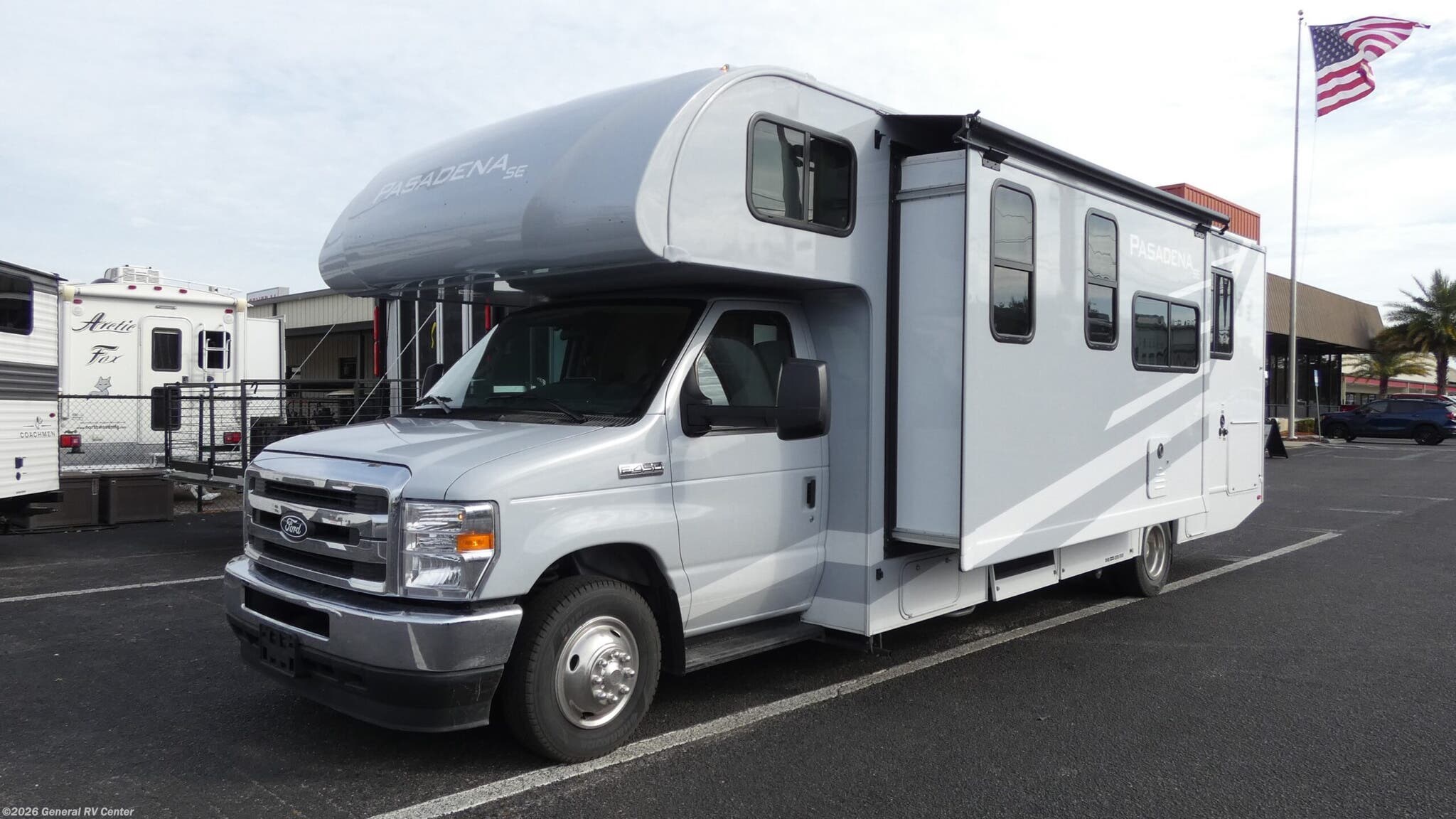 **Thor Motor Coach Pasadena SE Class C gas motorhome SE28 highlights:** * Theater Seating * Cab-Over Bunk * Rear Private Bedroom * Exterior Kitchen Plan to stay awhile in this spacious coach for five. Once you park for the day, you can start lunch on the three burner cooktop or in the microwave oven. There is a Dream dinette where you can dine at plus 68" theater seating to relax after your meal. A full bath includes a 24" x 36" shower to freshen up each day, and you'll feel right at home in the rear private bedroom. Here, you'll find an RV queen bed, dual bedside closets, and TV prep if you want the option to watch movies in bed. With any Pasadena SE Class C gas motorhome by Thor Motor Coach, you will find convenient amenities, a modern interior, and a reliable Ford E-Series chassis, to power your adventures. There is a one-piece fiberglass front cap, and premium one-piece roofing for added strength. Residential vinyl flooring will be easy to keep clean, and you'll love the LED lighting, pressed laminate countertops throughout, and full-extensions ball-bearing drawer guides. These motorhomes also include a generator and a 30-amp shoreline power cord to keep you going, along with a tankless water heater to ensure your comfort!