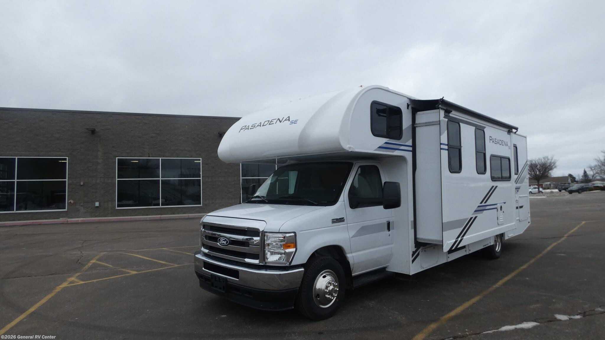 **Thor Motor Coach Pasadena SE Class C gas motorhome SE28 highlights:** * Theater Seating * Cab-Over Bunk * Rear Private Bedroom * Exterior Kitchen Plan to stay awhile in this spacious coach for five. Once you park for the day, you can start lunch on the three burner cooktop or in the microwave oven. There is a Dream dinette where you can dine at plus 68" theater seating to relax after your meal. A full bath includes a 24" x 36" shower to freshen up each day, and you'll feel right at home in the rear private bedroom. Here, you'll find an RV queen bed, dual bedside closets, and TV prep if you want the option to watch movies in bed. With any Pasadena SE Class C gas motorhome by Thor Motor Coach, you will find convenient amenities, a modern interior, and a reliable Ford E-Series chassis, to power your adventures. There is a one-piece fiberglass front cap, and premium one-piece roofing for added strength. Residential vinyl flooring will be easy to keep clean, and you'll love the LED lighting, pressed laminate countertops throughout, and full-extensions ball-bearing drawer guides. These motorhomes also include a generator and a 30-amp shoreline power cord to keep you going, along with a tankless water heater to ensure your comfort!