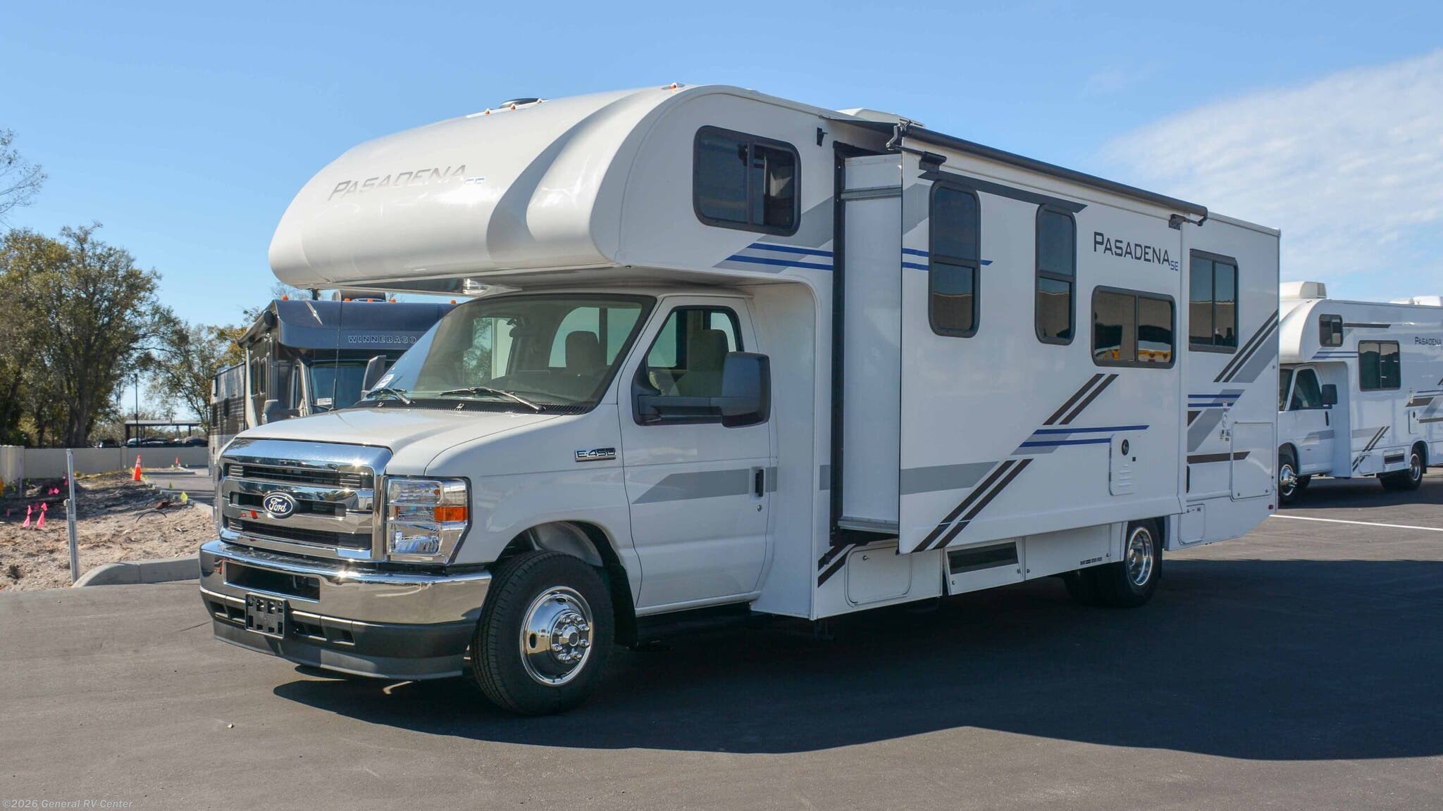 **Thor Motor Coach Pasadena SE Class C gas motorhome SE28 highlights:** * Theater Seating * Cab-Over Bunk * Rear Private Bedroom * Exterior Kitchen Plan to stay awhile in this spacious coach for five. Once you park for the day, you can start lunch on the three burner cooktop or in the microwave oven. There is a Dream dinette where you can dine at plus 68" theater seating to relax after your meal. A full bath includes a 24" x 36" shower to freshen up each day, and you'll feel right at home in the rear private bedroom. Here, you'll find an RV queen bed, dual bedside closets, and TV prep if you want the option to watch movies in bed. With any Pasadena SE Class C gas motorhome by Thor Motor Coach, you will find convenient amenities, a modern interior, and a reliable Ford E-Series chassis, to power your adventures. There is a one-piece fiberglass front cap, and premium one-piece roofing for added strength. Residential vinyl flooring will be easy to keep clean, and you'll love the LED lighting, pressed laminate countertops throughout, and full-extensions ball-bearing drawer guides. These motorhomes also include a generator and a 30-amp shoreline power cord to keep you going, along with a tankless water heater to ensure your comfort!