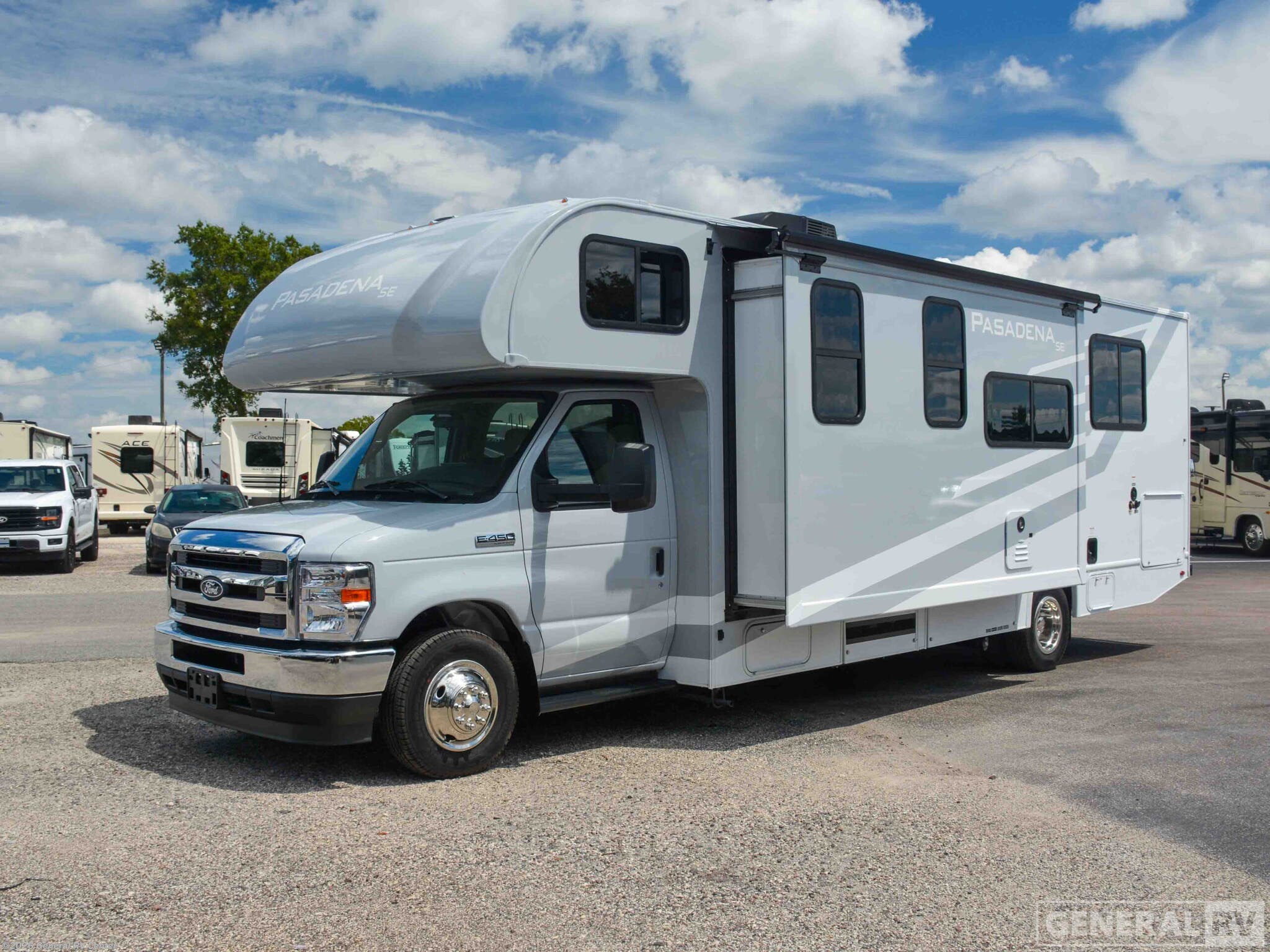 Thor Motor Coach Pasadena SE Class C gas motorhome SE28 highlights: Theater Seating Cab-Over Bunk Rear Private Bedroom Exterior Kitchen Plan to stay awhile in this spacious coach for five. Once you park for the day, you can start lunch on the three burner cooktop or in the microwave oven. There is a Dream dinette where you can dine at plus 68" theater seating to relax after your meal. A full bath includes a 24" x 36" shower to freshen up each day, and you'll feel right at home in the rear private bedroom. Here, you'll find an RV queen bed, dual bedside closets, and TV prep if you want the option to watch movies in bed. With any Pasadena SE Class C gas motorhome by Thor Motor Coach, you will find convenient amenities, a modern interior, and a reliable Ford E-Series chassis, to power your adventures. There is a one-piece fiberglass front cap, and premium one-piece roofing for added strength. Residential vinyl flooring will be easy to keep clean, and you'll love the LED lighting, pressed laminate countertops throughout, and full-extensions ball-bearing drawer guides. These motorhomes also include a generator and a 30-amp shoreline power cord to keep you going, along with a tankless water heater to ensure your comfort!