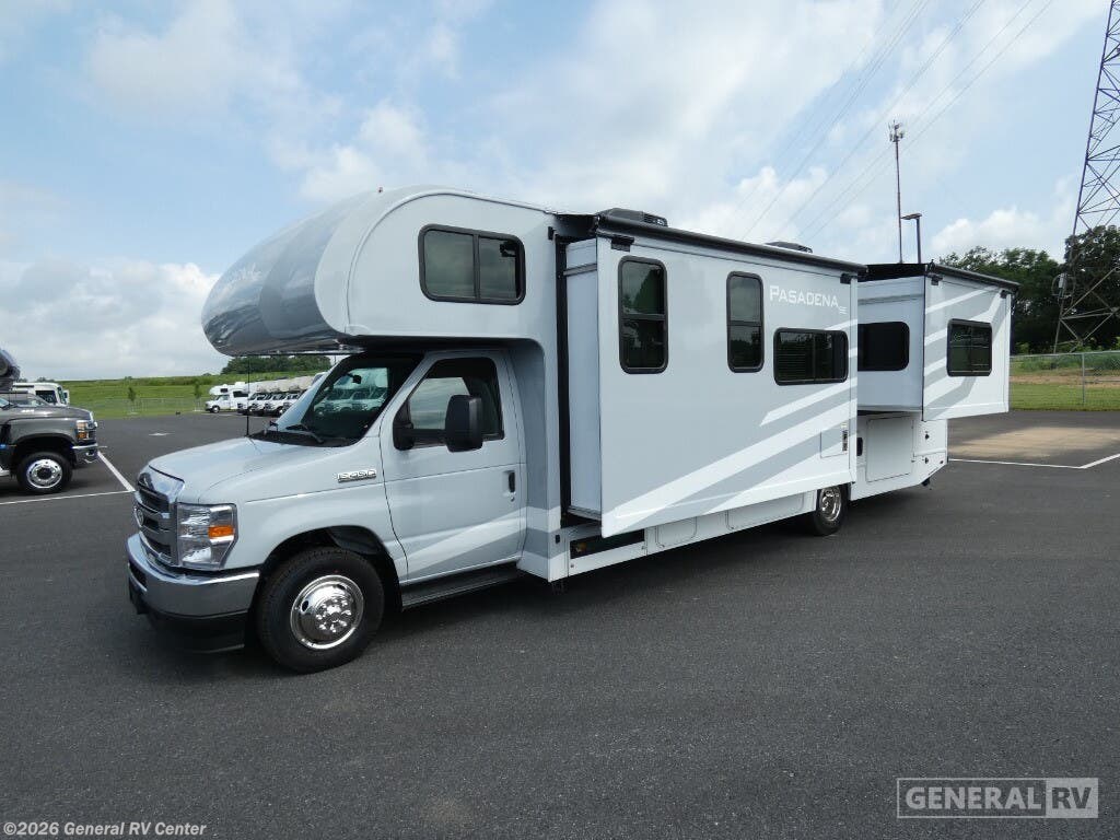 Thor Motor Coach Pasadena SE Class C gas motorhome SE29 highlights: - King Bed Slide - Cab-Over Bunk - Full Bath - Flip-Up Countertop Pack your bags and head across the country in this double slide out coach. The Dream dinette and theater seating provide a place to dine, relax, and even let extra guests sleep over who don't claim the cab-over bunk. A three burner gas cooktop and microwave oven will let you create meals each day, and a 12V refrigerator will keep your drinks cold! The rear of this coach is shared with the full bath and semi-private bedroom with a privacy curtain. You're sure to get a great night's rest on the king bed, and there is a large bedroom closet to keep your clothes wrinkle-free. There is also a second closet with washer and dryer prep if you choose to add these appliances. With any Pasadena SE Class C gas motorhome by Thor Motor Coach, you will find convenient amenities, a modern interior, and a reliable Ford E-Series chassis, with an optional Chevy chassis on select models to power your adventures. There is a one-piece fiberglass front cap, and premium one-piece roofing for added strength. Residential vinyl flooring will be easy to keep clean, and you'll love the LED lighting, pressed laminate countertops throughout, and full-extensions ball-bearing drawer guides. These motorhomes also include a 4.0 kW gas generator and a 30-amp shoreline power cord to keep you going, along with a tankless water heater to ensure your comfort!