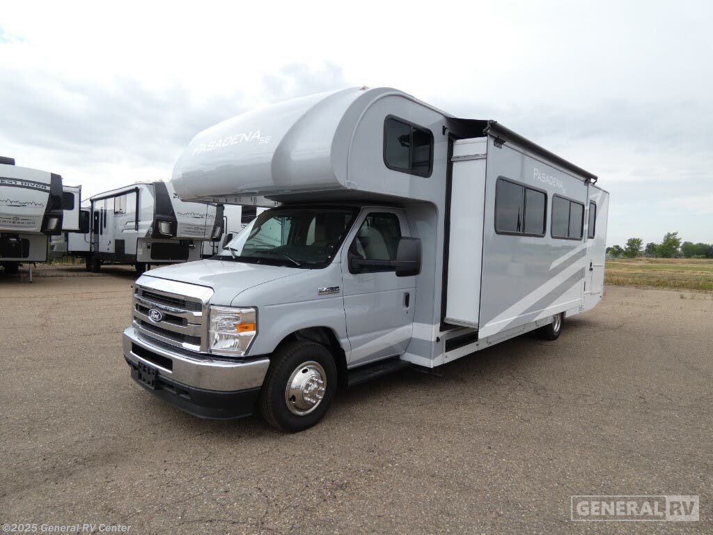 Thor Motor Coach Pasadena SE Class C gas motorhome SH31 highlights: Rear Bedroom 71" Dream Dinette 24" x 36" Shower 12V Refrigerator Exterior Kitchen You're sure to have a great time in this coach that can sleep six each night! The rear bedroom includes an RV queen bed and dual closets to keep your things organized, plus the bath is close by for easy nighttime use. Here, you'll find a private toilet and sink, with the independent shower right across the hall. Your guests can sleep on the 68" jack knife sofa and 70" dream dinette within the large slide out, or the cab-over bunk up front! A three burner gas cooktop and microwave oven will let you make meals for your crew, and a 12V refrigerator will keep perishables fresh. This unit also includes an exterior kitchen, allowing you to cook in the open fresh air! With any Pasadena SE Class C gas motorhome by Thor Motor Coach, you will find convenient amenities, a modern interior, and a reliable Ford E-Series chassis on select models to power your adventures. There is a one-piece fiberglass front cap, and premium one-piece roofing for added strength. Residential vinyl flooring will be easy to keep clean, and you'll love the LED lighting, pressed laminate countertops throughout, and full-extensions ball-bearing drawer guides. These motorhomes also include a generator and a 30-amp shoreline power cord to keep you going, along with a tankless water heater to ensure your comfort!