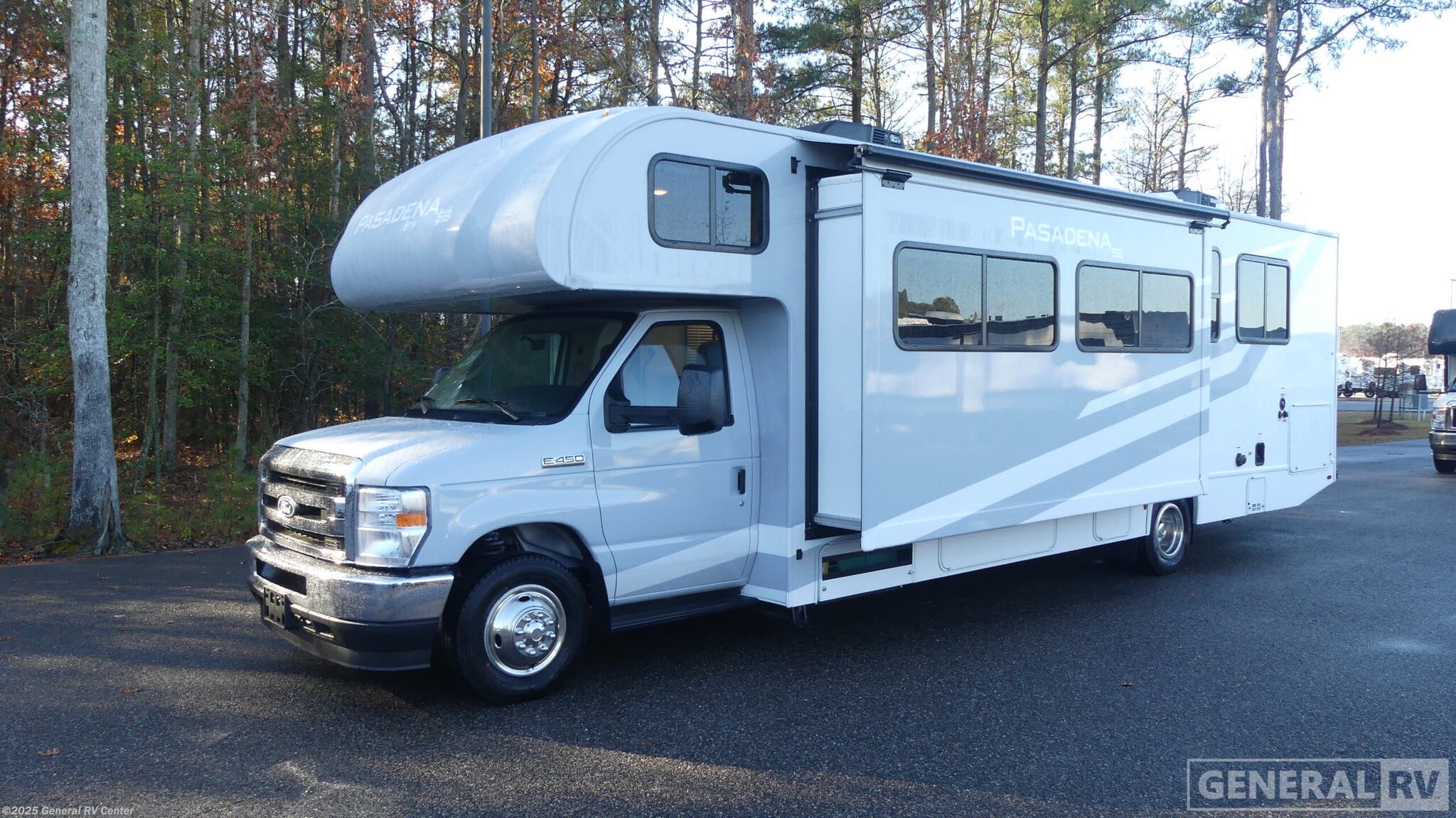 Thor Motor Coach Pasadena SE Class C gas motorhome SH31 highlights: Rear Bedroom 71" Dream Dinette 24" x 36" Shower 12V Refrigerator Exterior Kitchen You're sure to have a great time in this coach that can sleep six each night! The rear bedroom includes an RV queen bed and dual closets to keep your things organized, plus the bath is close by for easy nighttime use. Here, you'll find a private toilet and sink, with the independent shower right across the hall. Your guests can sleep on the 68" jack knife sofa and 70" dream dinette within the large slide out, or the cab-over bunk up front! A three burner gas cooktop and microwave oven will let you make meals for your crew, and a 12V refrigerator will keep perishables fresh. This unit also includes an exterior kitchen, allowing you to cook in the open fresh air! With any Pasadena SE Class C gas motorhome by Thor Motor Coach, you will find convenient amenities, a modern interior, and a reliable Ford E-Series chassis on select models to power your adventures. There is a one-piece fiberglass front cap, and premium one-piece roofing for added strength. Residential vinyl flooring will be easy to keep clean, and you'll love the LED lighting, pressed laminate countertops throughout, and full-extensions ball-bearing drawer guides. These motorhomes also include a generator and a 30-amp shoreline power cord to keep you going, along with a tankless water heater to ensure your comfort!