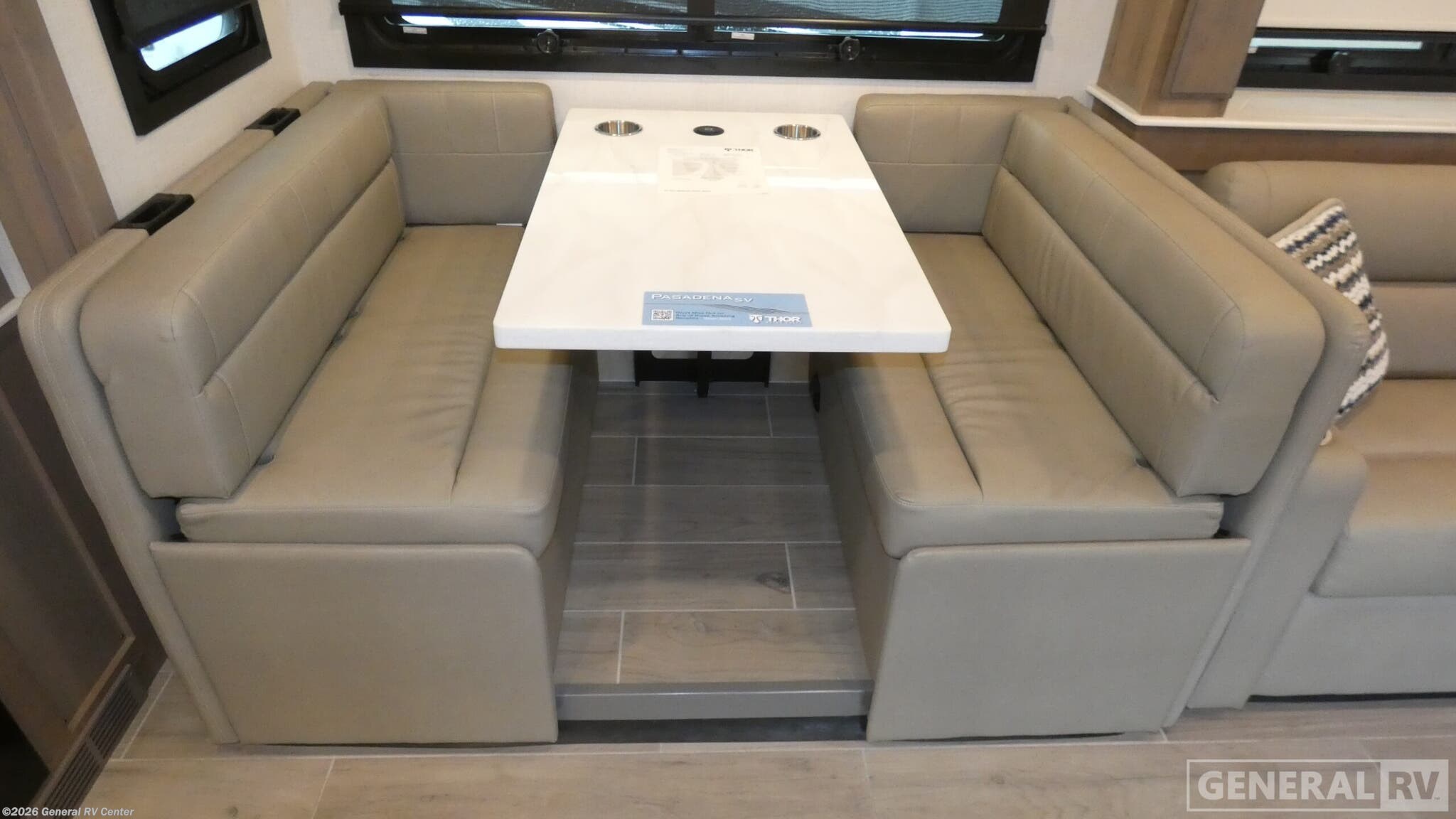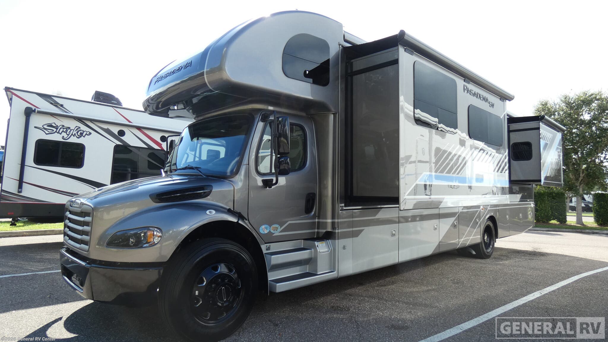 ## Thor Motor Coach Pasadena SV Super C diesel motorhome 38FX highlights: - Triple slides - Dream Dinette - Cab-Over Bunk Built on the dependable Freightliner® S2RV chassis with an Atlas™ Foundation, this Pasadena® SV Super C RV is driven by a 360-horsepower Cummins 6.7L ISB-XT engine that cranks out 800 lb-ft of torque. Tow confidently using the 15,000-pound trailer hitch, and settle into air-ride adjustable captain’s chairs that make the journey worth it. With heated/remote mirrors, side-view cameras, and cruise control at your fingertips, the open road has never felt this comfortable. The Pasadena® SV turns heads with its striking full-body, sleek gel-coated sidewalls, and Stealth Black-Out Package. After hiking, kick back beneath the power patio awning with integrated LED lighting and store your outdoor gear in the large basement pass-through storage compartments. Once you’re ready to unplug, use the standard 100-watt solar panel to keep your energy flowing. Wherever you roam, the Pasadena® SV keeps you plugged in and entertained thanks to the Winegard® ConnecT™ 5G system onboard, which works as an all-in-one Wi-Fi extender, 5G hotspot, and TV antenna. Binge your favorite shows on the Smart TVs inside, or take movie night outdoors with the 40-inch exterior LED TV. Up front, the 10-inch touchscreen dash radio puts control at your fingertips, loaded with Bluetooth®, Apple CarPlay®, Android Auto™, and SiriusXM® capability, because epic road trips deserve an epic soundtrack. With the Pasadena® SV, the road trips feel more like a luxury resort on wheels. Gather around the multi-functional Dream Dinette®, your go-to spot for dinner, game night, or remote work, featuring cup holders and a built-in wireless charger. When it’s time to relax, sink into the cozy theater seating that heats, massages, and reclines with footrests, USB ports, and cup holders. In the 38DX, 38FX, and 38XL floor plans, a remote-controlled electric fireplace sets the mood with just one click. When it’s time to wind down, the Pasadena® SV delivers next-level comfort for every kind of traveler. Stretch out on the King bed with a Tilt-A-View® feature that lets you kick back and watch TV or read a book in total relaxation. Above the cab, a cozy bunk with a shaded skylight doubles as a front-row seat for stargazing. If you need more sleeping space, the Dream Dinette® quickly converts into a bed for overnight guests.
