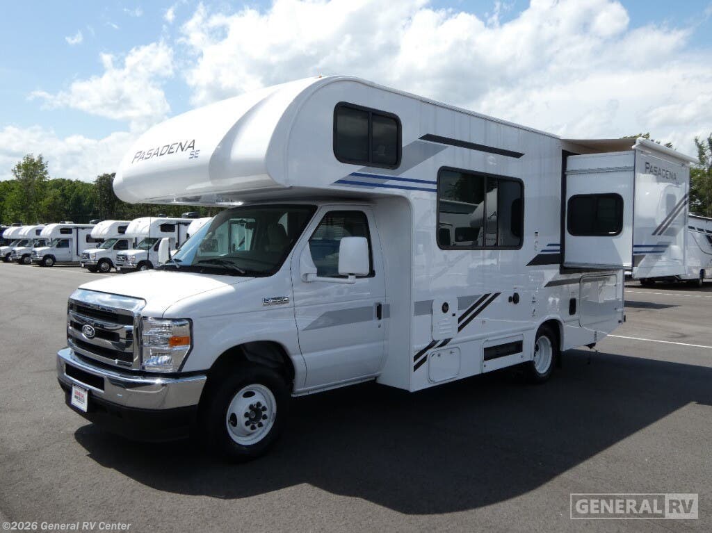 **Thor Motor Coach Pasadena SE Class C gas motorhome SZ22 highlights: - RV Queen Bed Slide - Closet - Dream Dinette - Cab-Over Bunk It won't be hard to find comfort in this coach for five! You can freshen up in the rear corner full bath once you've set up camp, then make lunch on the two burner gas cooktop or convection microwave with an air fryer. There is also a 12V refrigerator for cold items and a flip-up countertop for more space. Whether you dine at the Dream Dinette or take your plate outdoors under the 15' power awning, you're sure to have a great time in this motorhome. There is a semi-private bedroom with a 60" x 74" RV queen bed slide and bedroom TV prep if you want the option to watch movies in bed. And your guests can take the Dream Dinette and cab-over bunk at night! With any Pasadena SE Class C gas motorhome by Thor Motor Coach, you will find convenient amenities, a modern interior, and a reliable Ford E-Series chassis, with an optional Chevy chassis on select models to power your adventures. There is a one-piece fiberglass front cap, and premium one-piece roofing for added strength. Residential vinyl flooring will be easy to keep clean, and you'll love the LED lighting, pressed laminate countertops throughout, and full-extensions ball-bearing drawer guides. These motorhomes also include a 4.0 kW gas generator and a 30-amp shoreline power cord to keep you going, along with a tankless water heater to ensure your comfort!