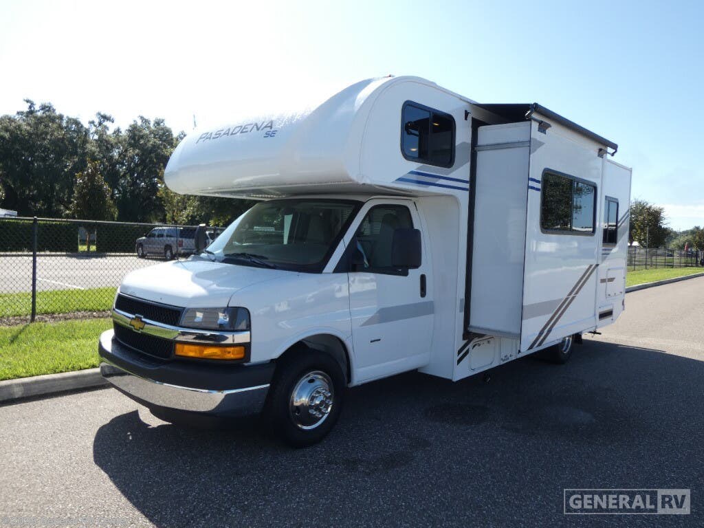 Thor Motor Coach Pasadena SE Class C gas motorhome SZ25 Chevy highlights: Twin Beds with King Conversion Dream Dinette Slide Out Cab-Over Bunk Flip-Up Countertop It won't be hard to find comfort in this coach for five! You can freshen up in the mid-coach full bath once you've set up camp, then make lunch on the two burner gas cooktop or convection microwave with an air fryer. There is also a 12V refrigerator for cold items and a flip-up countertop for more space. Whether you dine at the Dream Dinette slide out or take your plate outdoors under the 17' 6" power awning, you're sure to have a great time in this motorhome. The semi-private rear bedroom includes a privacy curtain, two twin beds with a king-size bed conversion, plus TV prep if you want the option to watch shows in bed. And any guests you may have can sleep on the dinette and 52" x 96" cab-over sleeping space! With any Pasadena SE Class C gas motorhome by Thor Motor Coach, you will find convenient amenities, a modern interior, and a reliable Chevy chassis. There is a one-piece fiberglass front cap, and premium one-piece roofing for added strength. Residential vinyl flooring will be easy to keep clean, and you'll love the LED lighting, pressed laminate countertops throughout, and full-extensions ball-bearing drawer guides. These motorhomes also include a generator and a 30-amp shoreline power cord to keep you going, along with a tankless water heater to ensure your comfort!