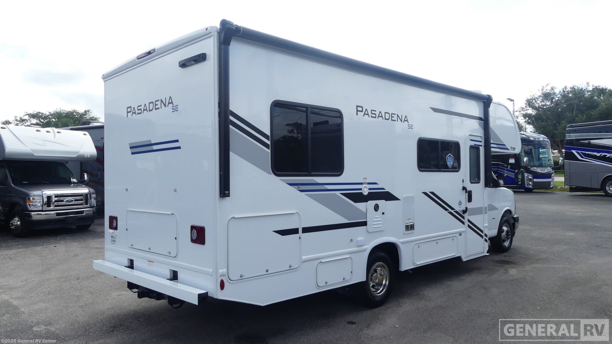 Thor Motor Coach Pasadena SE Class C gas motorhome SZ25 Chevy highlights: Twin Beds with King Conversion Dream Dinette Slide Out Cab-Over Bunk Flip-Up Countertop It won't be hard to find comfort in this coach for five! You can freshen up in the mid-coach full bath once you've set up camp, then make lunch on the two burner gas cooktop or convection microwave with an air fryer. There is also a 12V refrigerator for cold items and a flip-up countertop for more space. Whether you dine at the Dream Dinette slide out or take your plate outdoors under the 17' 6" power awning, you're sure to have a great time in this motorhome. The semi-private rear bedroom includes a privacy curtain, two twin beds with a king-size bed conversion, plus TV prep if you want the option to watch shows in bed. And any guests you may have can sleep on the dinette and 52" x 96" cab-over sleeping space! With any Pasadena SE Class C gas motorhome by Thor Motor Coach, you will find convenient amenities, a modern interior, and a reliable Chevy chassis. There is a one-piece fiberglass front cap, and premium one-piece roofing for added strength. Residential vinyl flooring will be easy to keep clean, and you'll love the LED lighting, pressed laminate countertops throughout, and full-extensions ball-bearing drawer guides. These motorhomes also include a generator and a 30-amp shoreline power cord to keep you going, along with a tankless water heater to ensure your comfort!