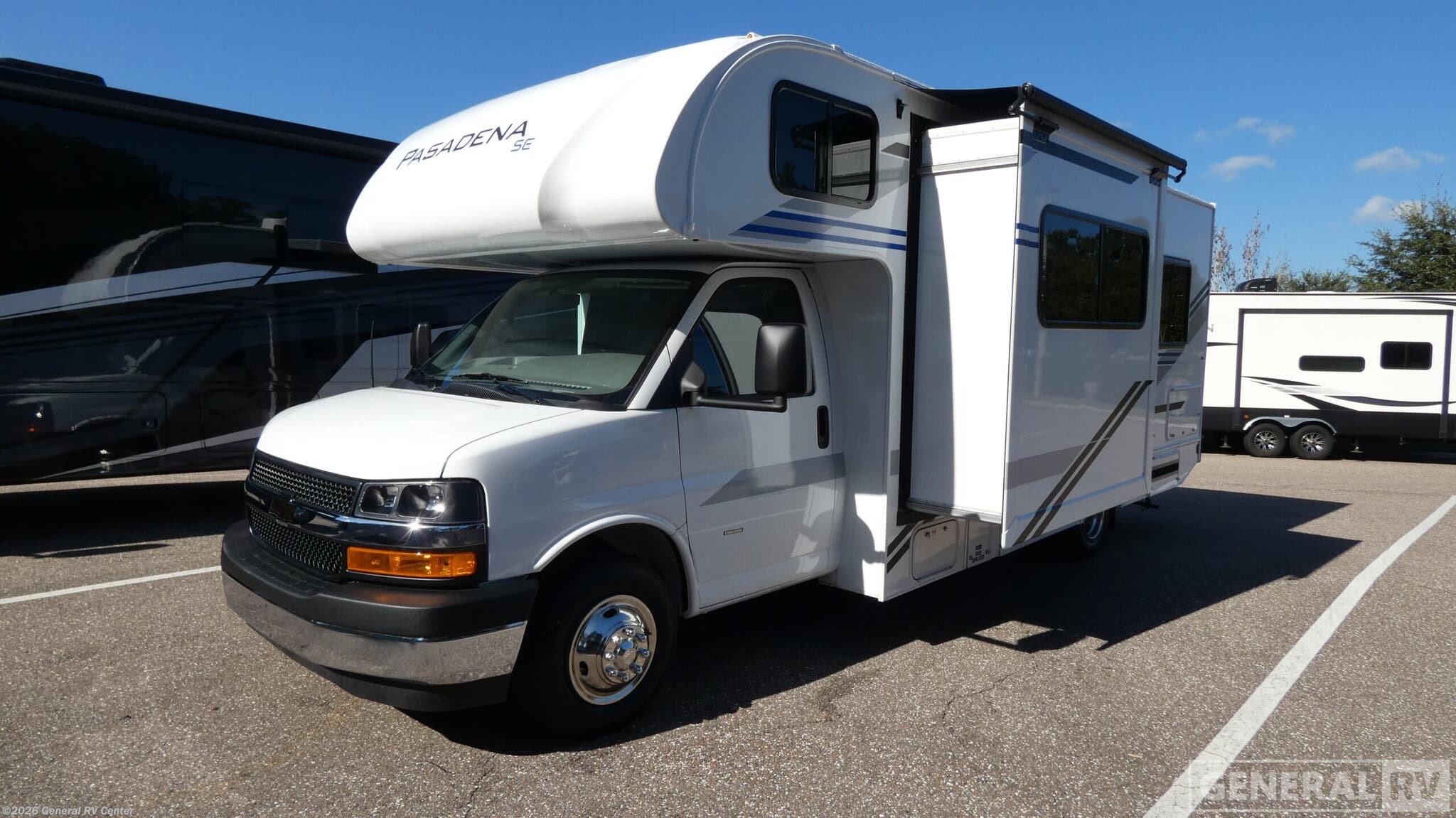 Thor Motor Coach Pasadena SE Class C gas motorhome SZ25 Chevy highlights: Twin Beds with King Conversion Dream Dinette Slide Out Cab-Over Bunk Flip-Up Countertop It won't be hard to find comfort in this coach for five! You can freshen up in the mid-coach full bath once you've set up camp, then make lunch on the two burner gas cooktop or convection microwave with an air fryer. There is also a 12V refrigerator for cold items and a flip-up countertop for more space. Whether you dine at the Dream Dinette slide out or take your plate outdoors under the 17' 6" power awning, you're sure to have a great time in this motorhome. The semi-private rear bedroom includes a privacy curtain, two twin beds with a king-size bed conversion, plus TV prep if you want the option to watch shows in bed. And any guests you may have can sleep on the dinette and 52" x 96" cab-over sleeping space! With any Pasadena SE Class C gas motorhome by Thor Motor Coach, you will find convenient amenities, a modern interior, and a reliable Chevy chassis. There is a one-piece fiberglass front cap, and premium one-piece roofing for added strength. Residential vinyl flooring will be easy to keep clean, and you'll love the LED lighting, pressed laminate countertops throughout, and full-extensions ball-bearing drawer guides. These motorhomes also include a generator and a 30-amp shoreline power cord to keep you going, along with a tankless water heater to ensure your comfort!