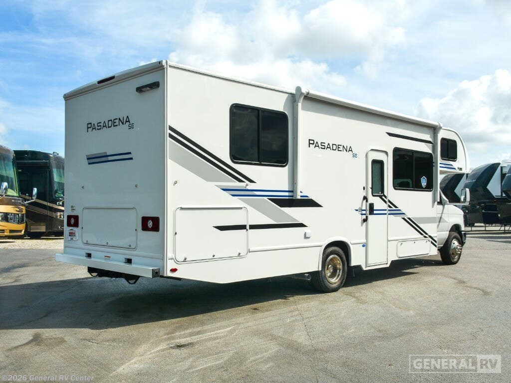 Thor Motor Coach Pasadena SE ESpec Essential Class C gas motorhome SZ28 highlights: Rear Bedroom 70" Dream Dinette 24" x 32" Shower 12V Refrigerator You're sure to have a great time in this coach that can sleep six each night! The rear bedroom includes an RV queen bed and dual closets to keep your things organized, plus the bath is close by for easy nighttime use. Here, you'll find a private toilet and sink, with the independent shower right across the hall. Your guests can sleep on the 68" sofa, 70" dream dinette, or the cab-over bunk! A two burner gas cooktop and convection microwave with an air fryer will let you make meals for your crew, and a 12V refrigerator will keep perishables fresh. With any Pasadena SE Class C gas motorhome by Thor Motor Coach, you will find convenient amenities, a modern interior, and a reliable Ford E-Series chassis, with an optional Chevy chassis on select models to power your adventures. There is a one-piece fiberglass front cap, and premium one-piece roofing for added strength. Residential vinyl flooring will be easy to keep clean, and you'll love the LED lighting, pressed laminate countertops throughout, and full-extensions ball-bearing drawer guides. These motorhomes also include a generator and a 30-amp shoreline power cord to keep you going, along with a tankless water heater to ensure your comfort!