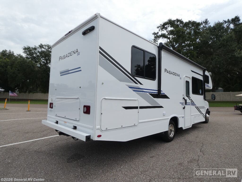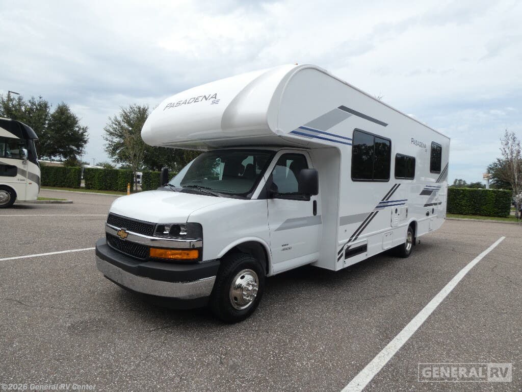 Thor Motor Coach Pasadena SE ESpec Essential Class C gas motorhome SZ28 Chevy highlights: Rear Bedroom 70" Dream Dinette 24" x 32" Shower 12V Refrigerator You're sure to have a great time in this coach that can sleep six each night! The rear bedroom includes an RV queen bed and dual closets to keep your things organized, plus the bath is close by for easy nighttime use. Here, you'll find a private toilet and sink, with the independent shower right across the hall. Your guests can sleep on the 68" sofa, 70" dream dinette, or the cab-over bunk! A two burner gas cooktop and convection microwave with an air fryer will let you make meals for your crew, and a 12V refrigerator will keep perishables fresh. With any Pasadena SE Class C gas motorhome by Thor Motor Coach, you will find convenient amenities, a modern interior, and a reliable Chevy chassis. There is a one-piece fiberglass front cap, and premium one-piece roofing for added strength. Residential vinyl flooring will be easy to keep clean, and you'll love the LED lighting, pressed laminate countertops throughout, and full-extensions ball-bearing drawer guides. These motorhomes also include a generator and a 30-amp shoreline power cord to keep you going, along with a tankless water heater to ensure your comfort!