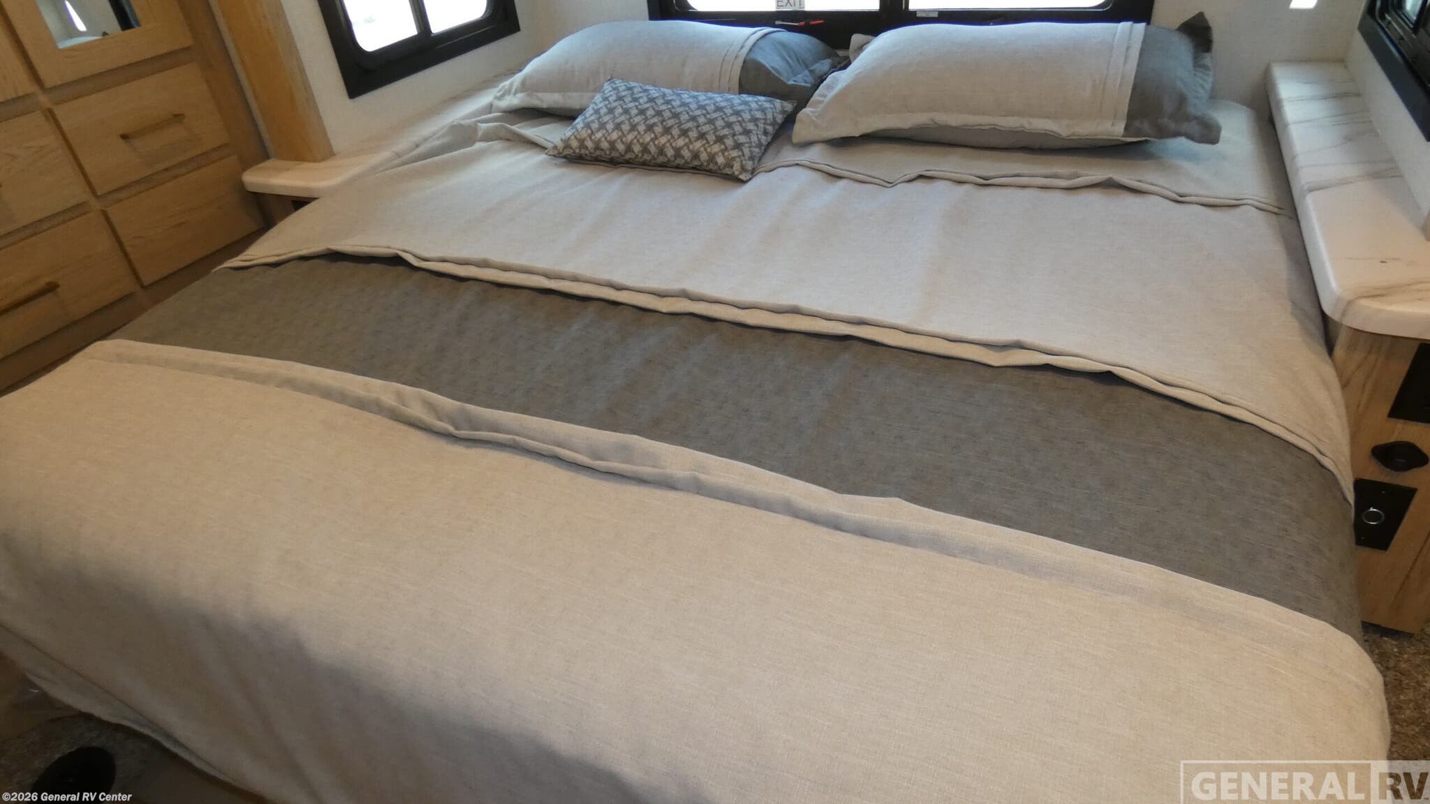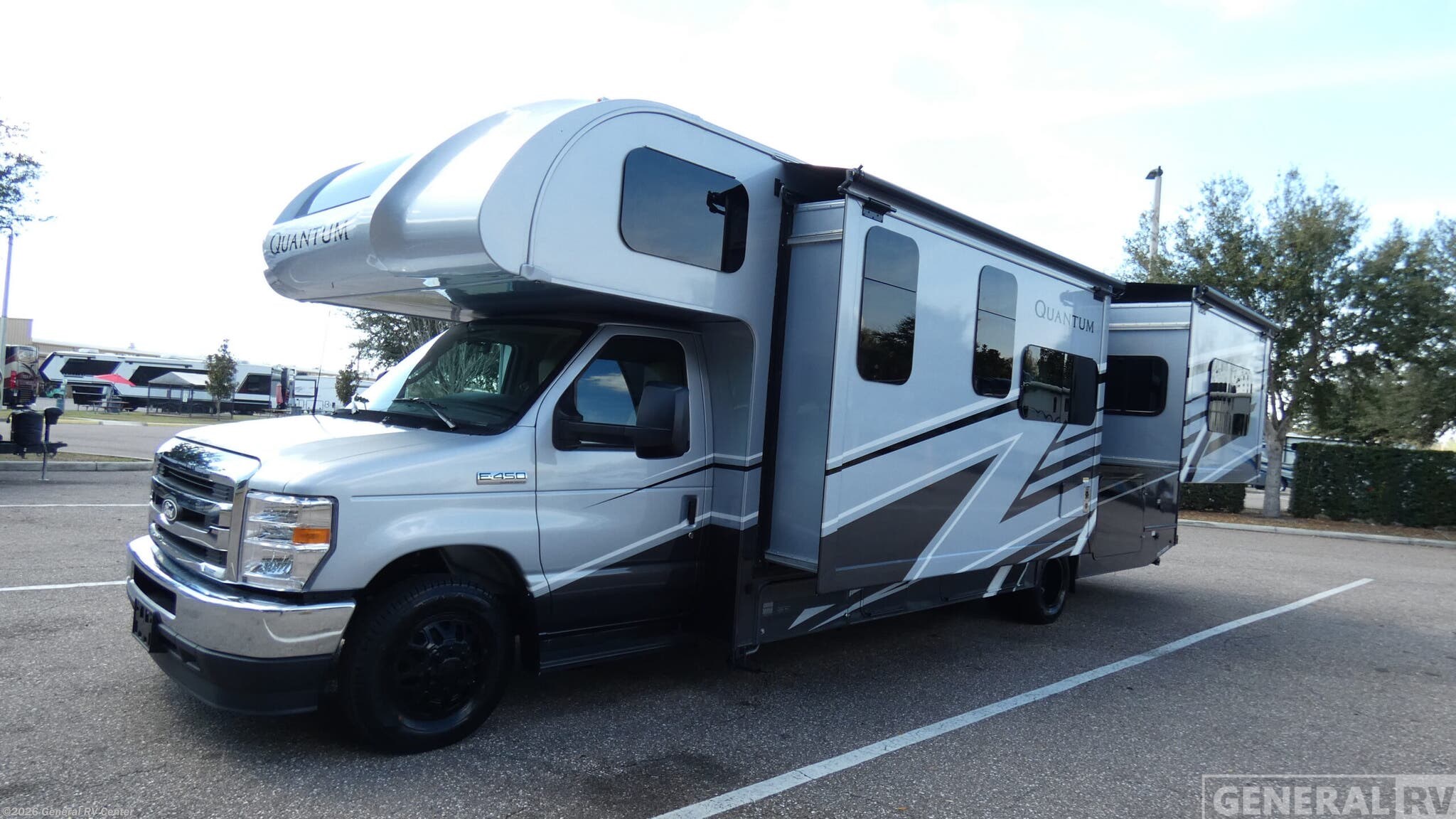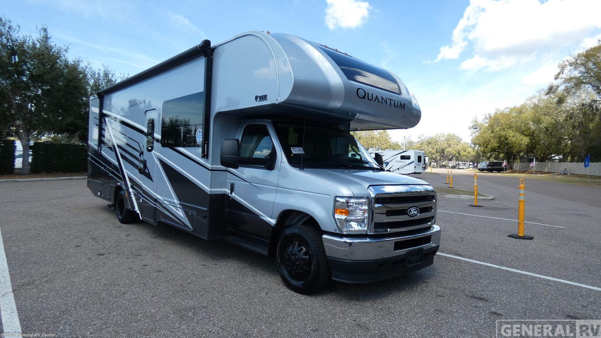 Experience the open road like never before with the 2026 Thor Motor Coach Quantum KW29. This exceptional RV combines comfort and functionality, making it the perfect choice for families and adventurers alike. With a spacious interior that sleeps up to eight, you'll find a king-sized bed in the rear bedroom, a full-size bed, and convertible sleeping areas, ensuring everyone has a cozy spot to rest. The front living area provides a welcoming space to relax, complete with a 70" Dream Dinette and a 68" Jack-Knife Sofa, perfect for entertaining or enjoying a family meal. The Quantum KW29 is designed with convenience in mind. The center kitchen is equipped with a convection oven and a two-burner cooktop, allowing you to whip up delicious meals with ease. The RV is prepped for a washer and dryer, adding a touch of home to your travels. The rear bathroom offers privacy and comfort, featuring a plastic/glass shower and ample storage space. Outside, the 18 ft. powered retractable awning provides a perfect spot to unwind and enjoy the scenery. Built on a robust Ford E450 chassis with a powerful 325-horsepower engine, this RV promises a smooth and reliable journey. With a length of 31 feet and thoughtful design elements like the flip-up countertop and ample storage, the Quantum KW29 is ready to make your travel dreams come true. To explore this incredible RV further, visit your nearest General RV dealership.