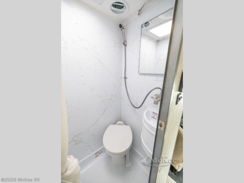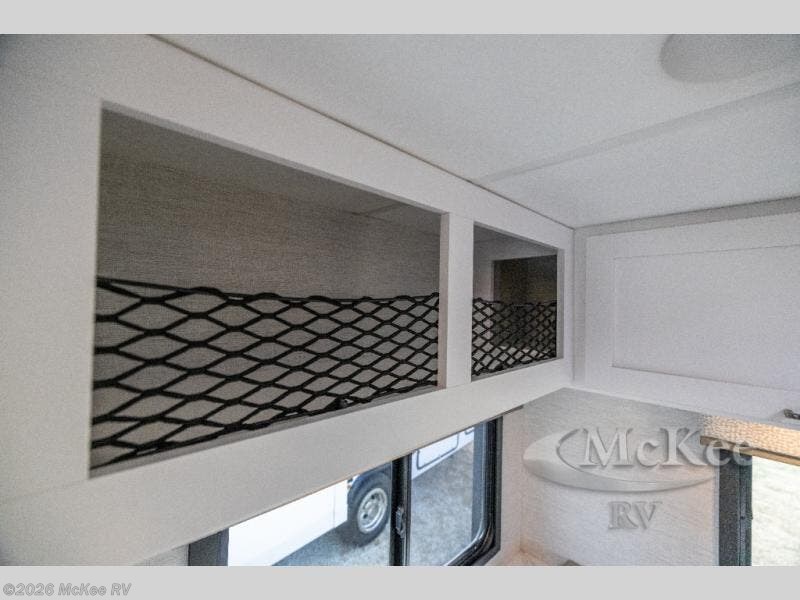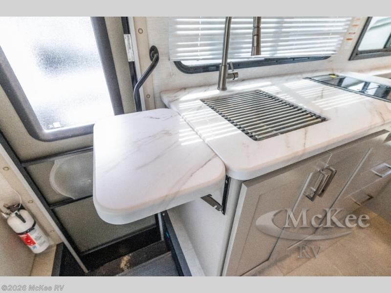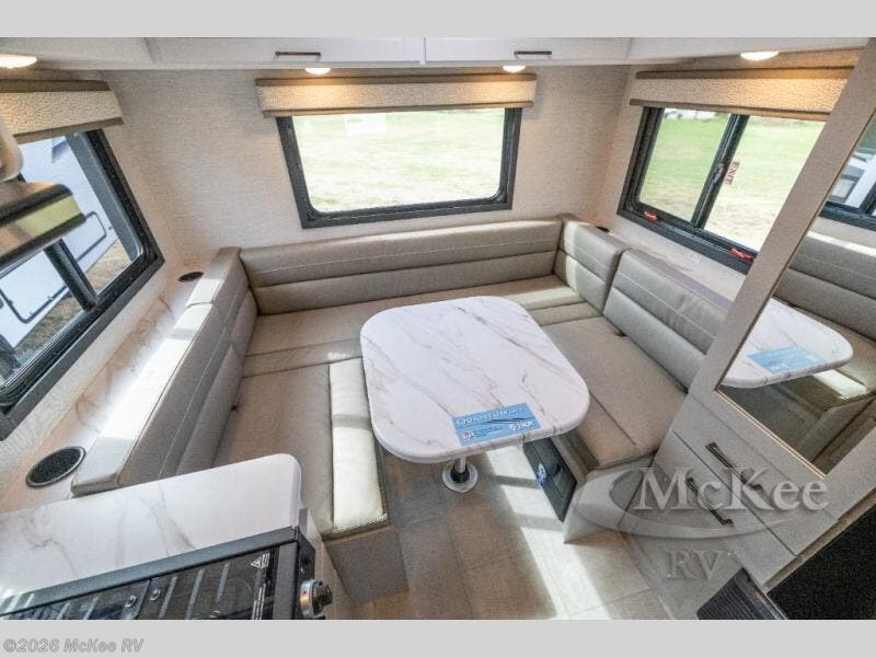 This compact, yet cozy coach is perfect for trips to the campground each weekend! Once you've reached your destination, you can set up the 11' power awning, unload the exterior storage compartments, and relax in your camp chairs. The two burner gas cooktop and convection microwave with an air fryer will let you make meals each day, and there is a 12V refrigerator to keep food fresh. A flip-up counter is another great feature that will give you more prep space! You can freshen up in the wet bath, grab your night clothes from the closet, then convert the U-shaped dinette into a 54" x 77" bed for a great night's rest!