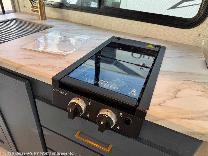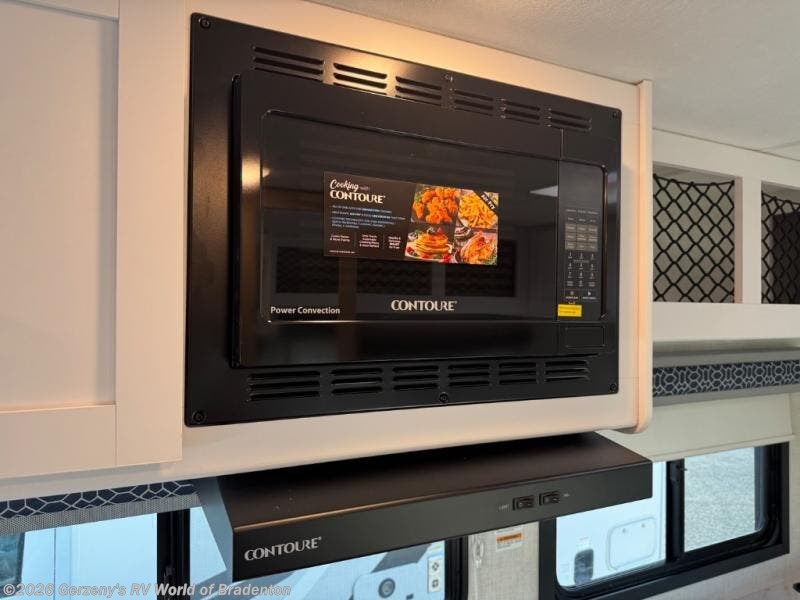 This compact, yet cozy coach is perfect for trips to the campground each weekend! Once you've reached your destination, you can set up the 11' power awning, unload the exterior storage compartments, and relax in your camp chairs. The two burner gas cooktop and convection microwave with an air fryer will let you make meals each day, and there is a 12V refrigerator to keep food fresh. A flip-up counter is another great feature that will give you more prep space! You can freshen up in the wet bath, grab your night clothes from the closet, then convert the U-shaped dinette into a 54" x 77" bed for a great night's rest!