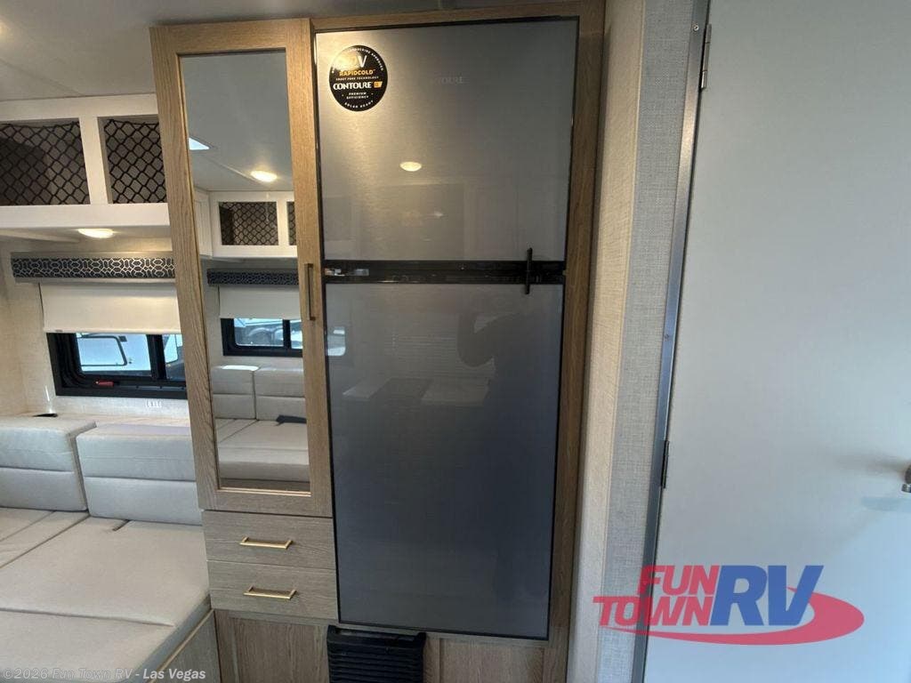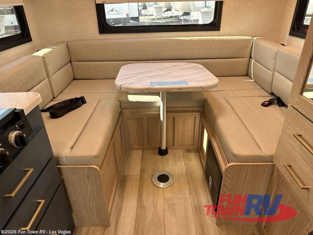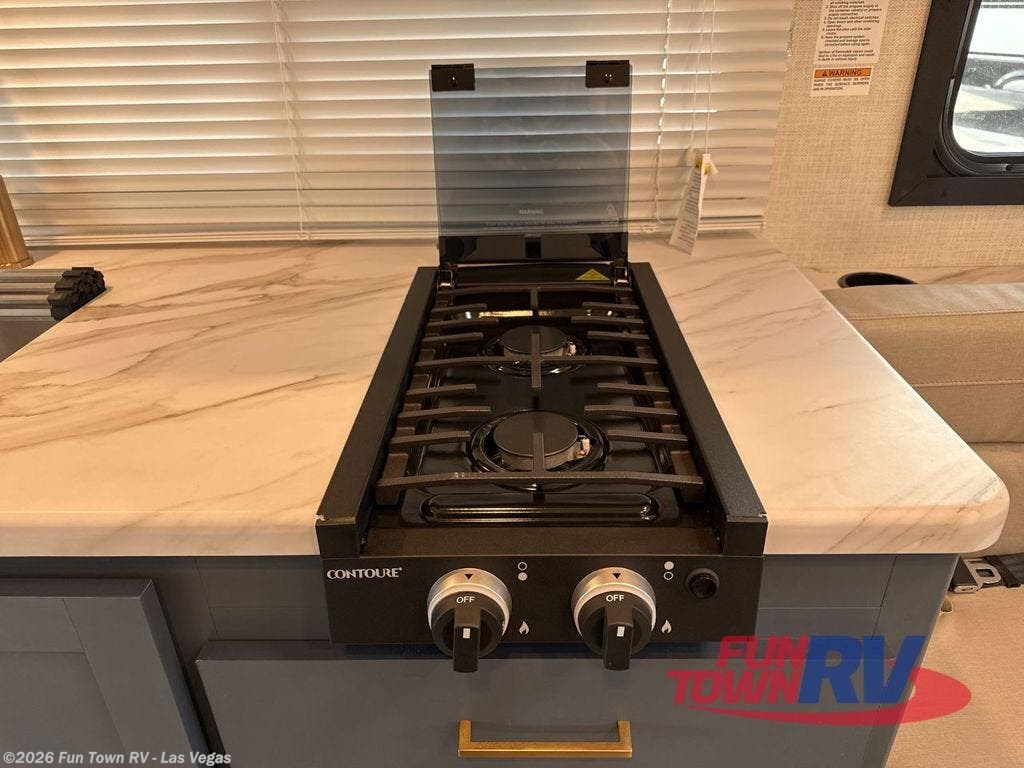 This compact, yet cozy coach is perfect for trips to the campground each weekend! Once you've reached your destination, you can set up the 11' power awning, unload the exterior storage compartments, and relax in your camp chairs. The two burner gas cooktop and convection microwave with an air fryer will let you make meals each day, and there is a 12V refrigerator to keep food fresh. A flip-up counter is another great feature that will give you more prep space! You can freshen up in the wet bath, grab your night clothes from the closet, then convert the U-shaped dinette into a 54" x 77" bed for a great night's rest!
