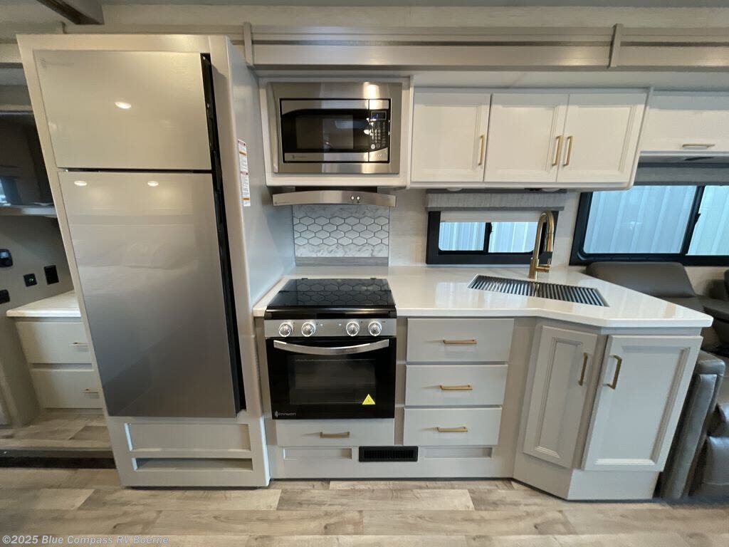 Wherever you decide to roam, you will be met with at-home comforts in this Resonate coach! Once you arrive at your destination, the swivel captain's chairs can become a part of the living area, and your guests can relax on the jack-knife sofa or Dream Dinette. The little ones are sure to love the drop-down overhead bunk, and there is a 40" LED Smart TV in the living area to enjoy a movie together. Within the spacious kitchen you'll find a 12V DC double door refrigerator, a microwave oven, plus a large single bowl stainless steel sink for easy clean-up, and the mid-coach full bath is easily accessible for everyone. The rear private bedroom will feel just like home with its king bed and 32" LED Smart TV, plus there is a dresser and a closet to keep your clothes wrinkle-free. This model also includes an outdoor kitchen with a refrigerator, a sink, and a 1,000-watt inverter!