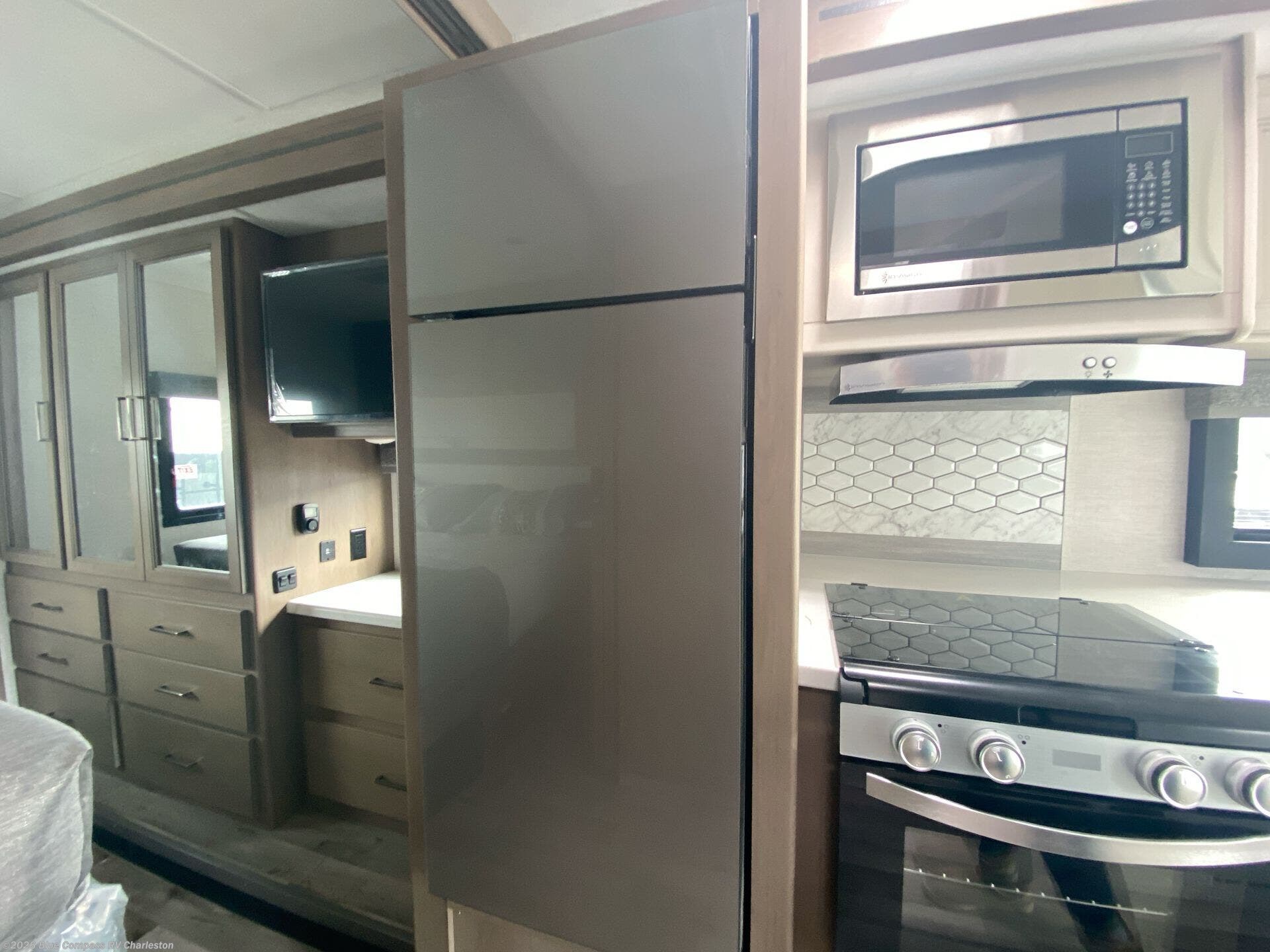 Wherever you decide to roam, you will be met with at-home comforts in this Resonate coach! Once you arrive at your destination, the swivel captain's chairs can become a part of the living area, and your guests can relax on the jack-knife sofa or Dream Dinette. The little ones are sure to love the drop-down overhead bunk, and there is a 40" LED Smart TV in the living area to enjoy a movie together. Within the spacious kitchen you'll find a 12V DC double door refrigerator, a microwave oven, plus a large single bowl stainless steel sink for easy clean-up, and the mid-coach full bath is easily accessible for everyone. The rear private bedroom will feel just like home with its king bed and 32" LED Smart TV, plus there is a dresser and a closet to keep your clothes wrinkle-free. This model also includes an outdoor kitchen with a refrigerator, a sink, and a 1,000-watt inverter!