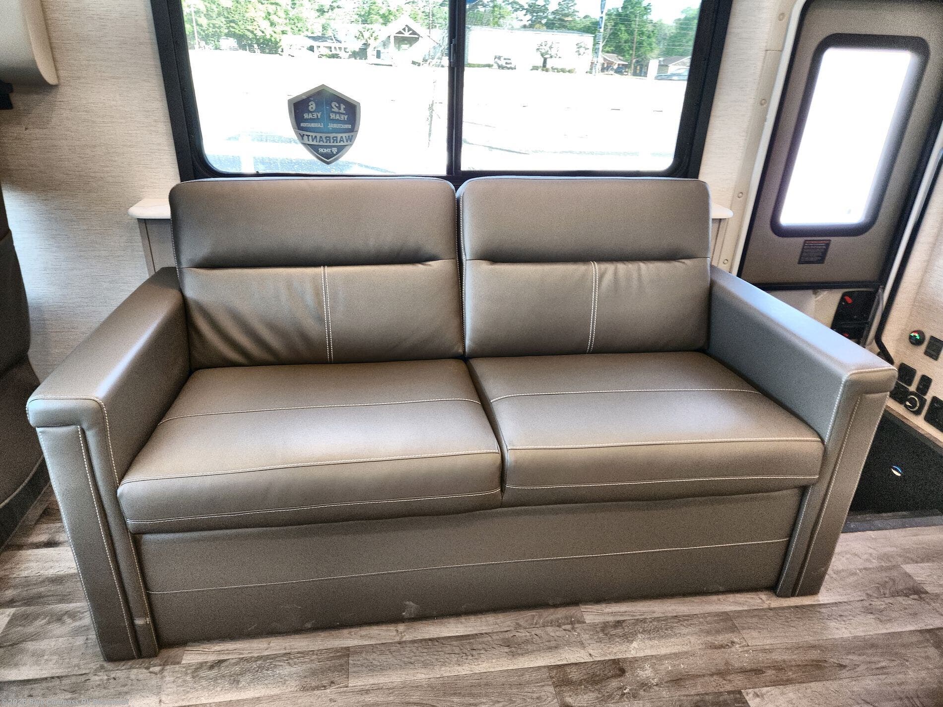 With any Resonate Class A gas motorhome by Thor Motor Coach you will find solid construction materials, including a one-piece fiberglass front cap, a welded tubular steel floor, and block foam insulation to enjoy camping all year long. The Ford F-53 chassis is ultra durable for many trips across the country, and the automatic leveling jacks with touchpad controls make setting up camp easier than ever. You will also love the rotocast storage compartments for all your gear, plus an HD-MAX exterior and framed windows for a more sleek look. The interior of each Resonate coach is warm and inviting with its residential vinyl flooring, flat panel cabinetry, and 7' interior ceiling height, and there are solid surface countertops the chef of your group is sure to love. An Onan RV QG 4000 gas generator also comes standard, along with dual 13,500 BTU roof A/C's, and a Winegard ConnecT WiFi extender + 4G to keep you connected to the outside world as you travel.