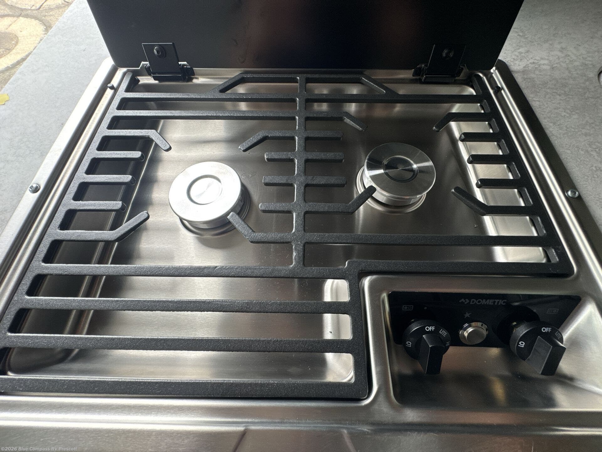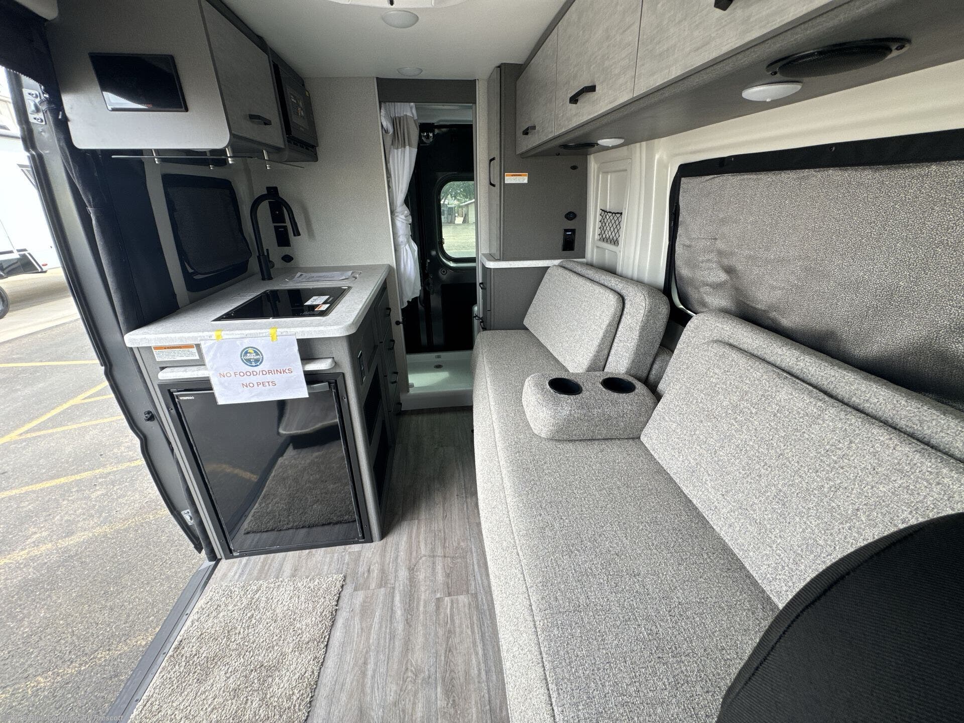 This coach is the perfect home on wheels for all your adventures. You will have everything you need, including a wet bath with a cassette toilet and pocket doors to save space. Once you have prepared breakfast on the two-burner gas cooktop, you can dine on the sofa with a removable table. This area can then be your sleeping space at night since the sofa converts into a 72" x 47" pull-out bed. Whether you're enjoying the fresh air let in by the large opening side windows, or you're sipping on a cold drink under the electric awning, you will love everything about this coach!