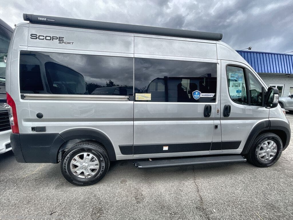 Each one of these Thor Motor Coach Scope Sport Class B gas motorhomes are built for those who want to explore the great outdoors in comfort! They are front wheel drive and constructed with a RAM Promaster 1500 XT chassis, plus a 5,000 lb. trailer hitch with 4-pin connector so you can haul even more items with you. The side steps make it easier to enter and exit the units, and the entryway screen door is an added bonus. The Sport Edition features patio awning prep, blackout zipper window shades, pressed countertops, slab style cabinet doors, and more convenient amenities. And you're sure to stay powered up by the 1000-watt inverter, 2800 gas generator, and 30-amp detachable shoreline power cord!